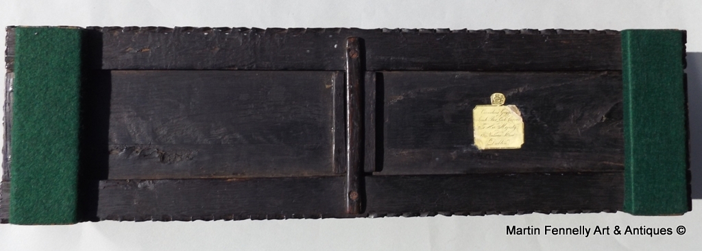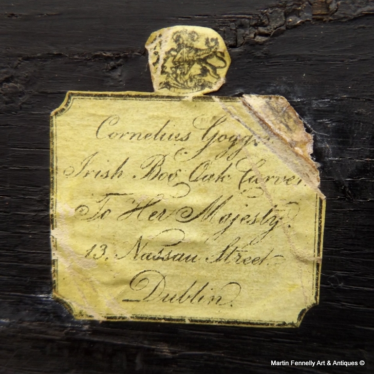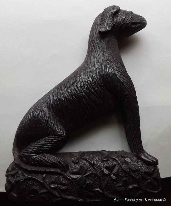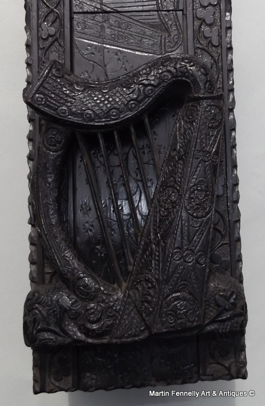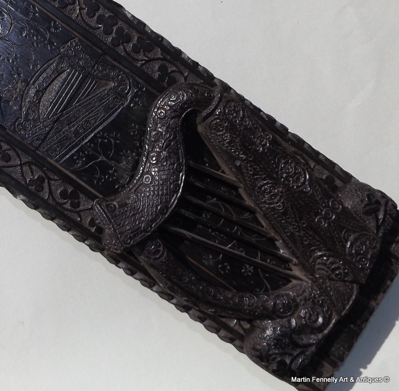 Rare Irish Hand Carved Bog Oak Book Slide of medium proportions, mid Nineteenth Century.The adjustable base with a central carving depicting an Irish Harp. One hinged folding bog oak bookend is carved depicting an elaborately carved seated Irish Wolfhound.The other folding bookend is carved depicting an Irish Harp above a solid base with shamrocks. Paper label "Cornelius Goggin Irish Bog Oak Carver to Her Majesty. 13 Nassau Street, Dublin" Condition: Good untouched condition with no losses to carvings, nice surface patination.