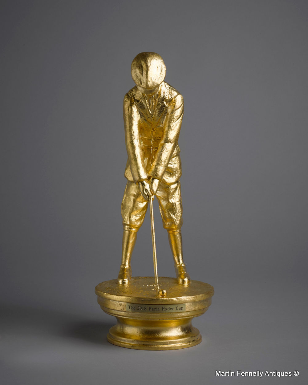 When some of the most powerful people in Paris, France decided to do something special for the Ryder Cup – They called on Paul Ferriter, the famed Irish Sculptor. Paul created this stunning piece depicting Abe Mitchell – The Golfer on top of the Ryder Cup and the instructor to Samuel Ryder. The piece finished in Gilt Gold will be presented to each of the sponsers. Paul has agreed to do a limited edition and they will be sold throgh my Gallery – what an Honour