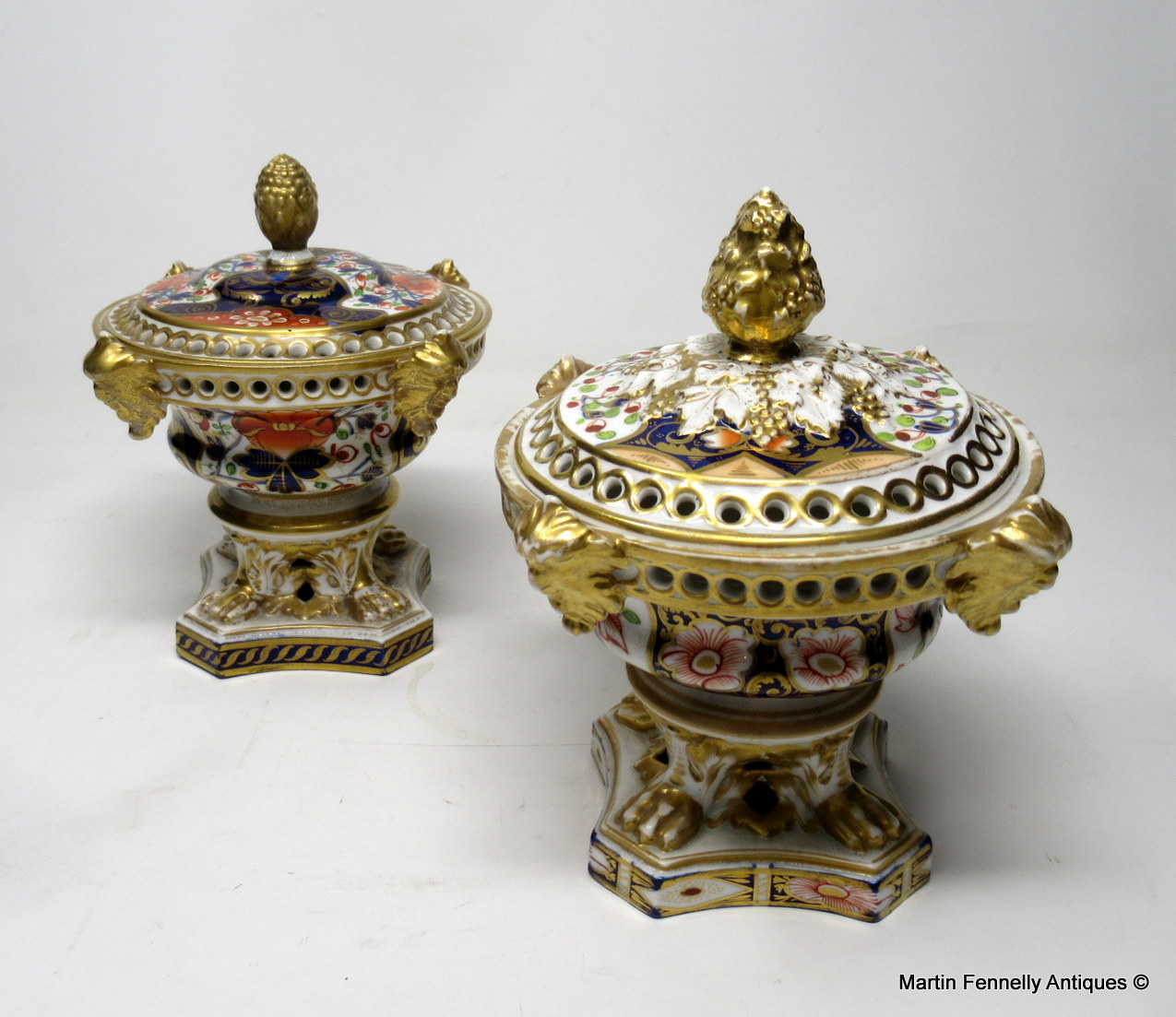 Rare Matched Pair of Early English Regency Royal Crown Derby Porcelain Pot Pourri or Pastile Burners of traditional form. First quarter of the Nineteenth Century.