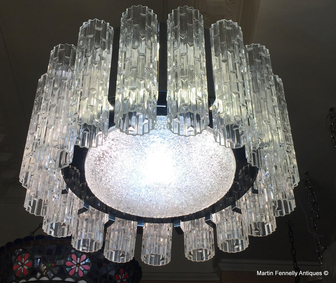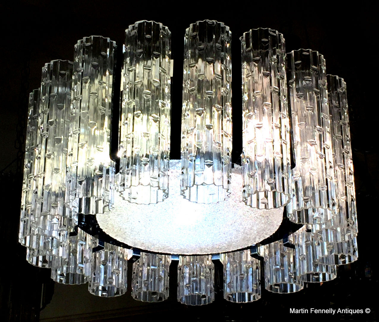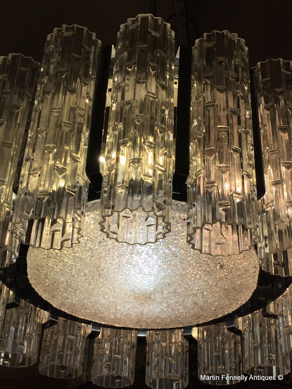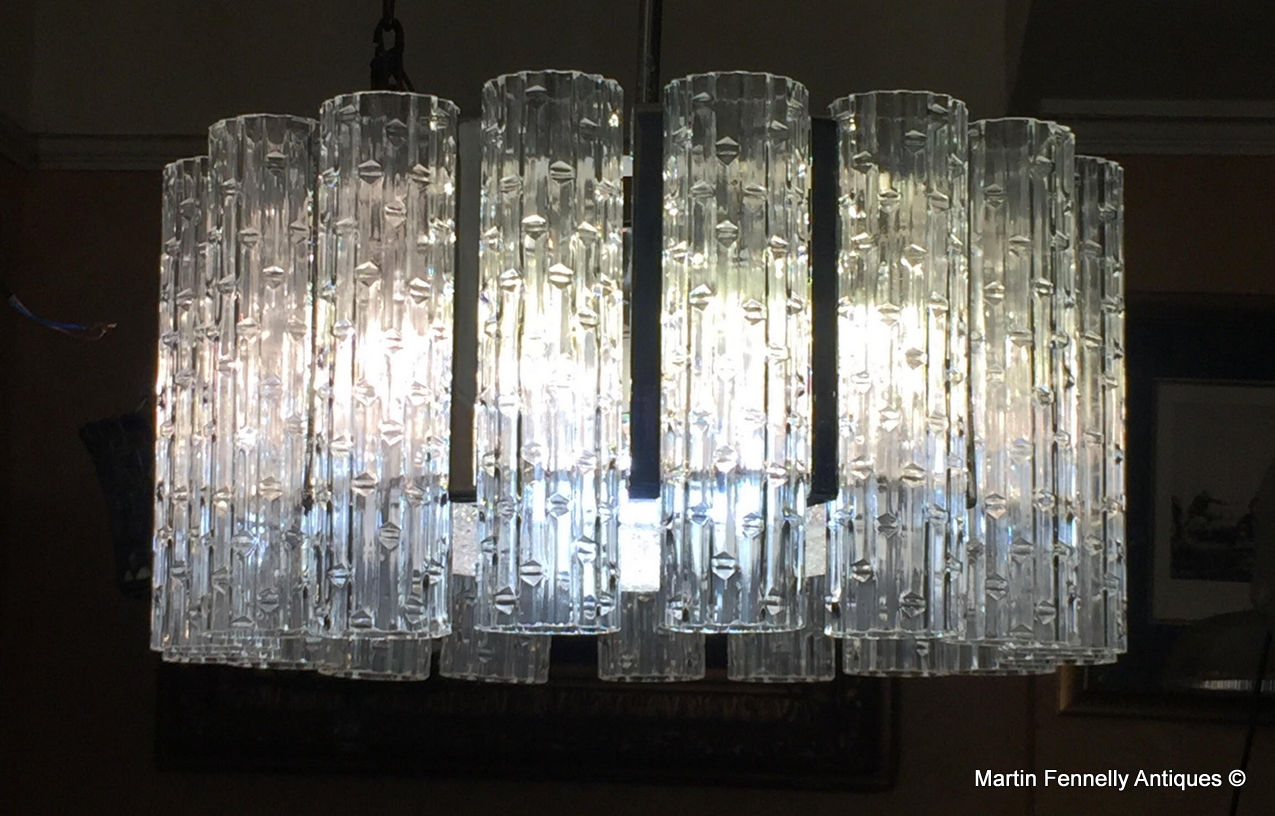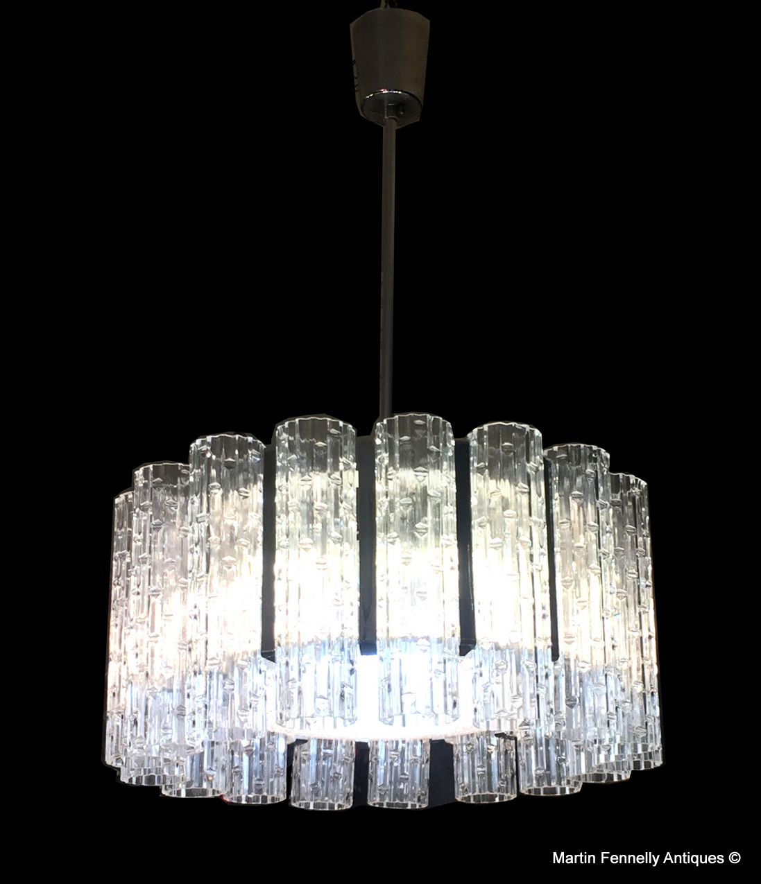 This is a Mazeega Italian Chandelier dating to Cira 1950 and is comprised of 17 ‘tronchi’, each with a sculptural gap up its length, surrounding a cast glass disc on the bottom of the fixture. A chrome frame accents the glass. Glass tronchi cylinders are 12″ tall. These chandeliers are very sought after and are rare to find. Superb Chandelier which would add Italian flair to any room and interior design.