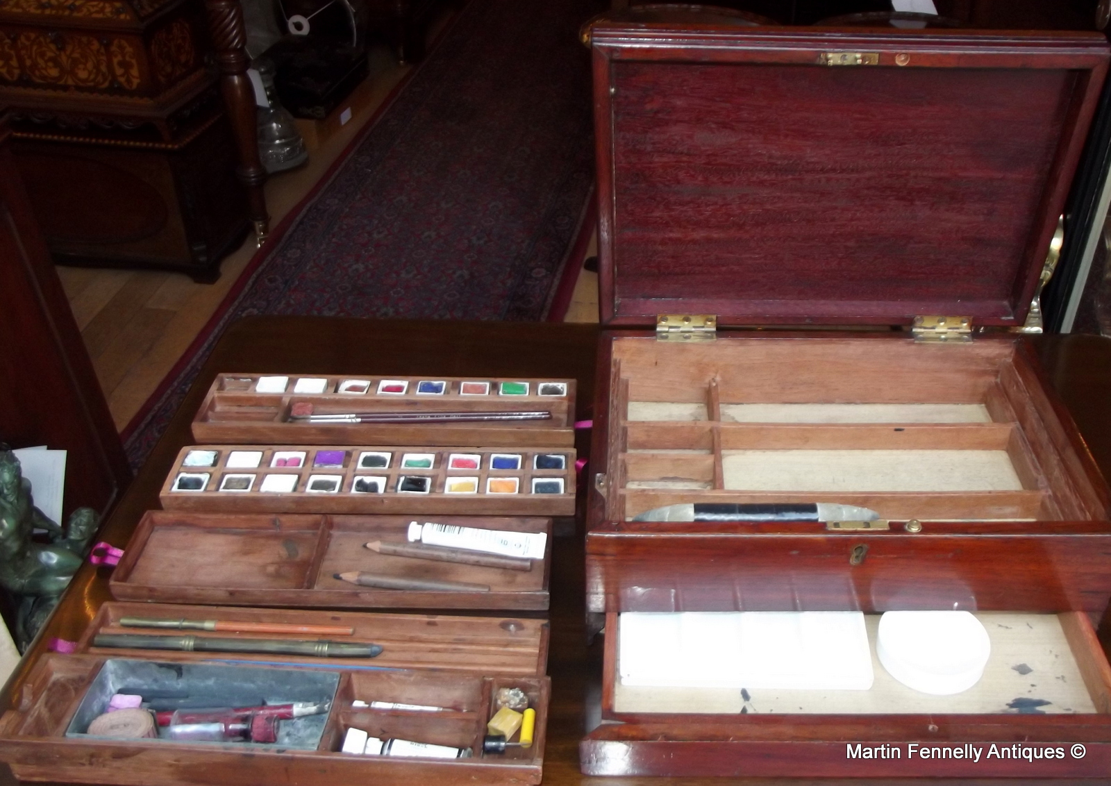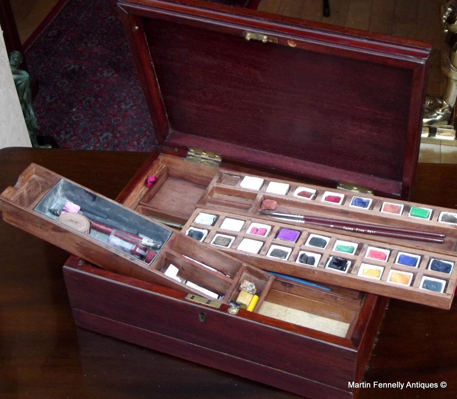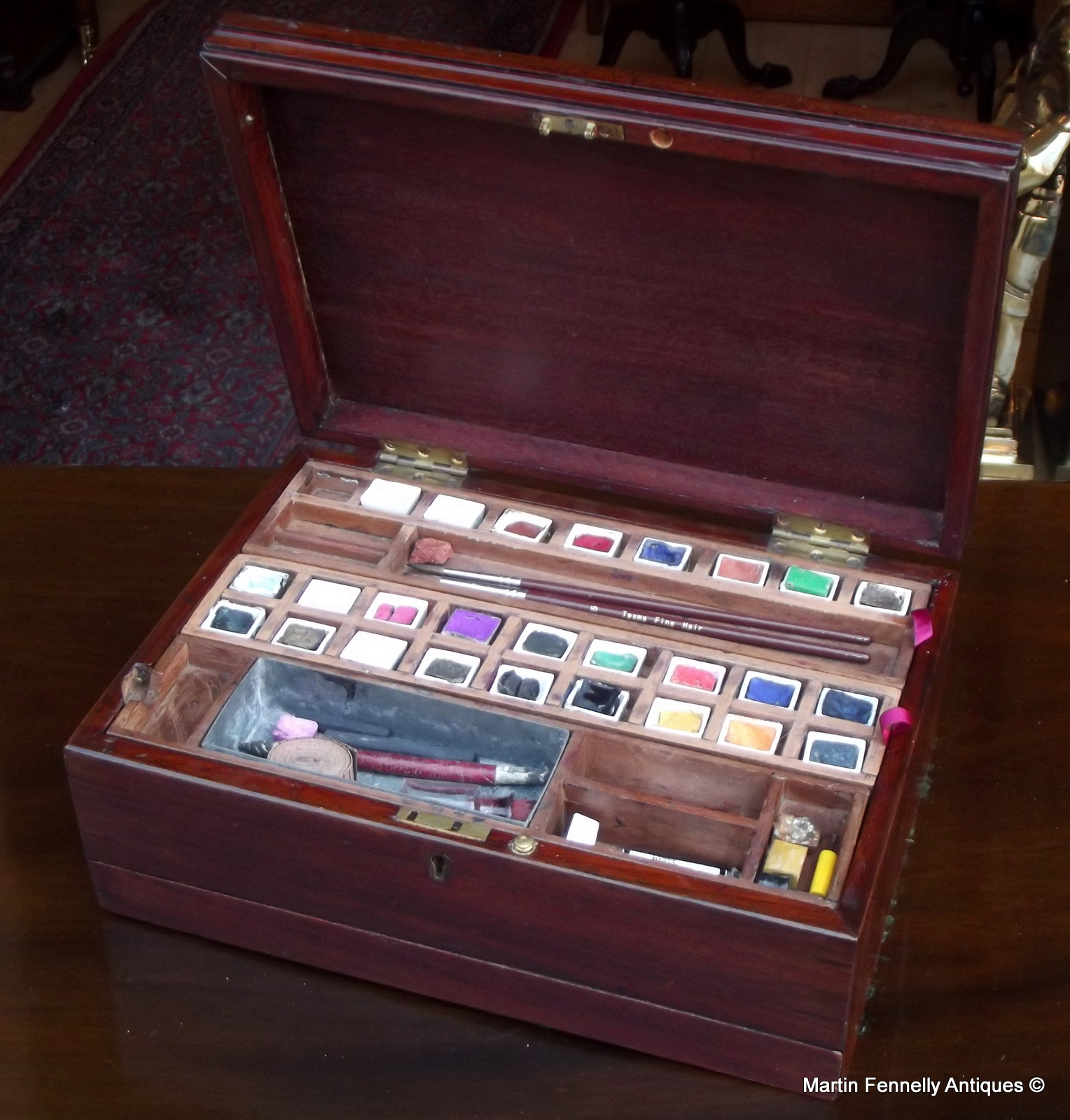This is really the Ultimate Item for the Artist in your Life. It is rare to find these and to find one with pretty much the entire contents and working key is really rare. The Mahogany box was made Circa 1900 and has a lower drawer and the top opens to reveal a multi sectioned layered area complete with various paints and brushes etc. It was used by a Watercolour Artist and one might well wonder what lovely paintings are out there that were painted from this lovely box.