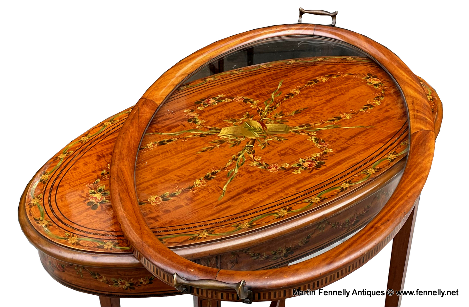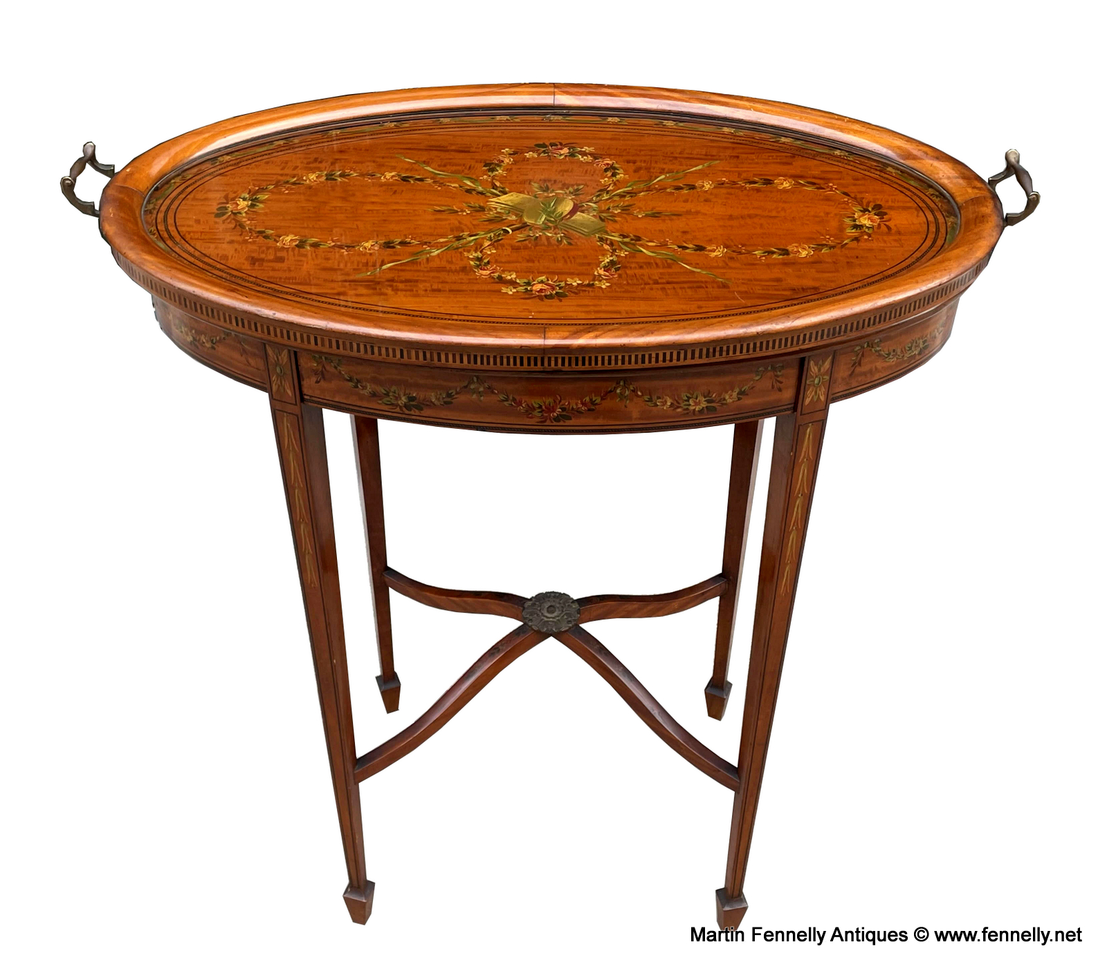 This is a Superb Satinwood Hand Painted Tray Table Dating to Circa 1900. The Glass Tray with Satinwood Frame and Brass handles sits above a hand painted top. The top is painted with floral and garland detail and is a iece of art in itself. There are tapering legs and central cross supports all of which are politely hand painted. This is a beautiful piece of furniture and in very good condition.