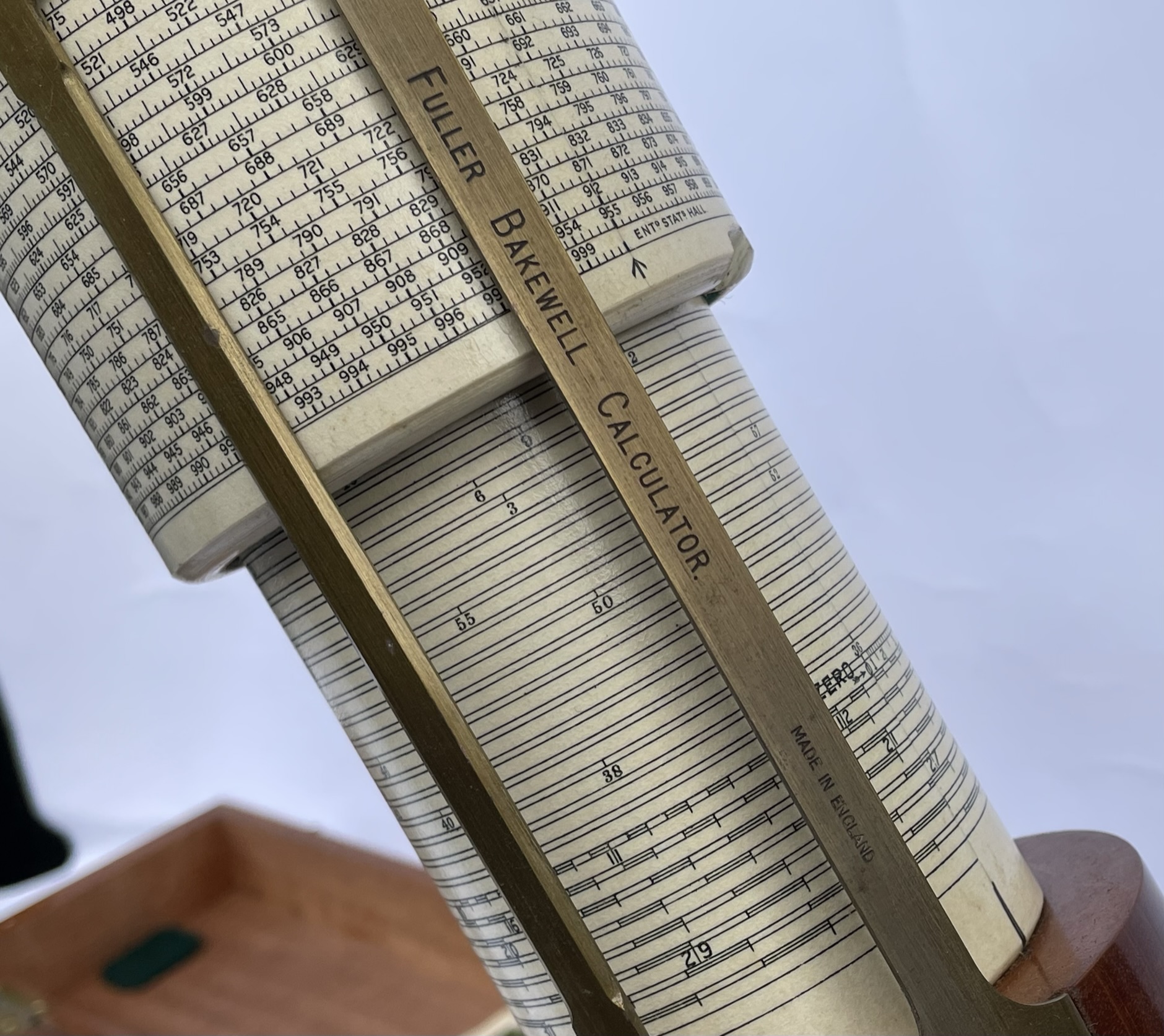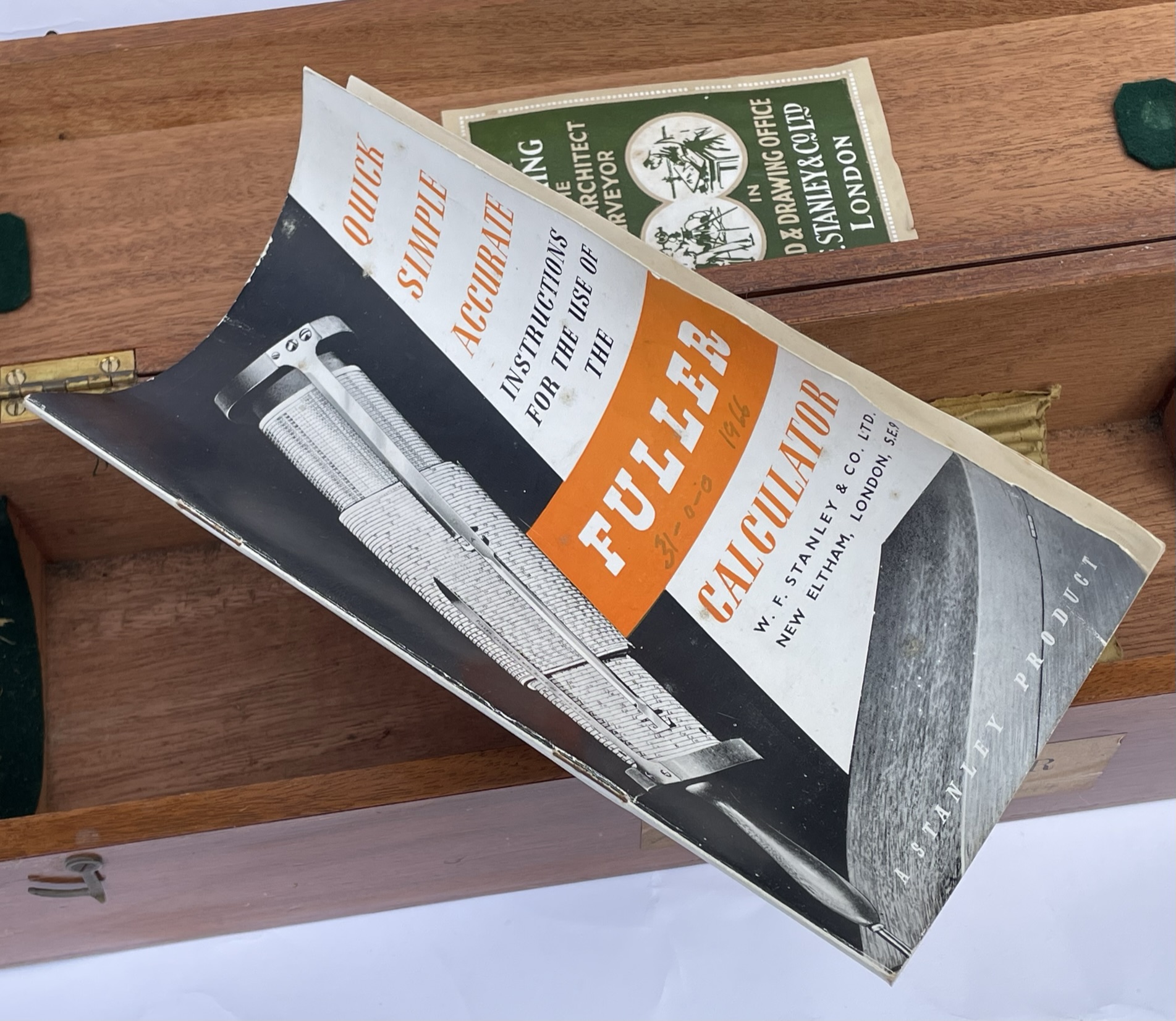 This is a Rare Fuller Bakewell Calculator by Stanley of London with original instruction booklet in good condition. It has the logarithmic scale of numbers 41 feet 8 inches in length. By George Fuller, M.Inst., C.E. In original wooden box.