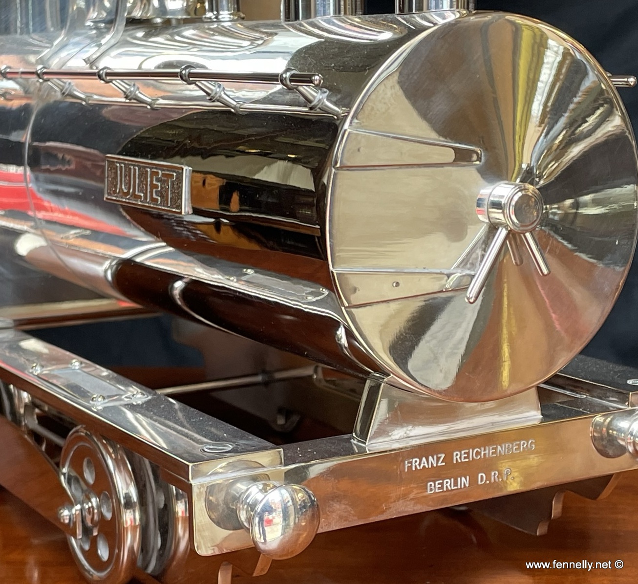 This is a very Rare Item – Dating to 1905 and made by Franz Richenberg of Berlin Germany. This Novelty Cocktail Bar in the form of a train comes complete with all original glasses, decanter and cocktail sticks.There are 4 Whiskey Tumblers, 2 Cocktail Stick Holders, 6 Port Glasses, 1 Whiskey Decanter and 2 Match Lighting patches either side of the Train engine. Franz Richenberg pieces are highly sought after and this Juliet example is one of very few in the World. This piece was in a private collection and very well looked after. The set is currently in my Gallery window and draws many admiring glances and comments. The set was described by some of my fellow dealers as one of the rarest items to come for sale on Francis Street in many years.