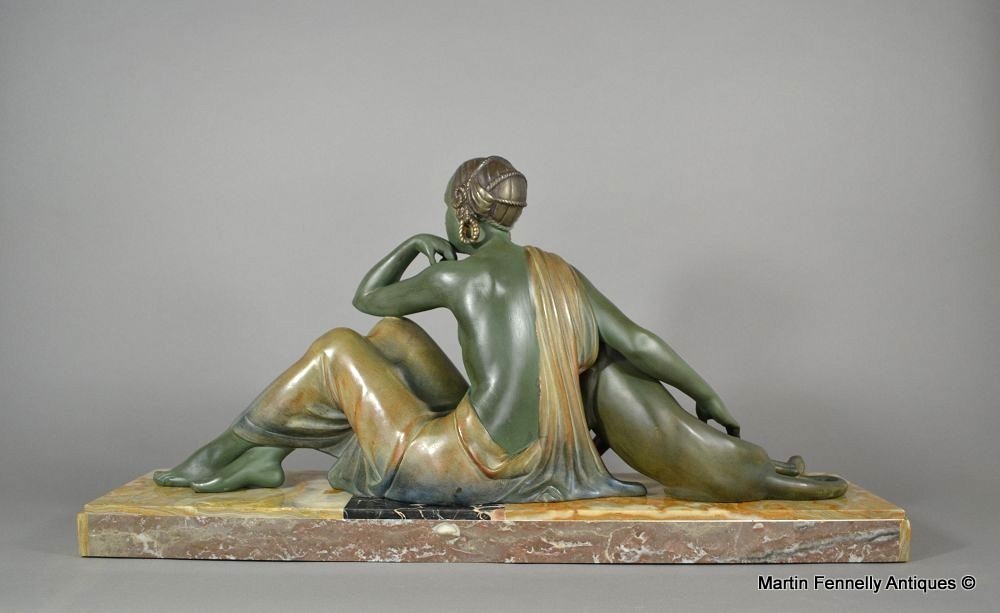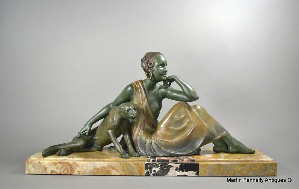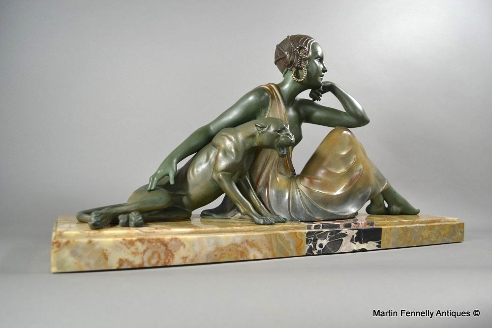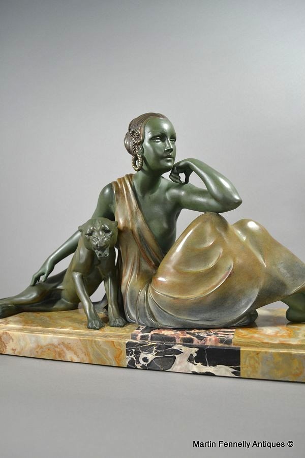 This is a really stylish Art Deco Sculpture – Lady with Panther. It dates to Circa 1930 and is in superb condition. It is large and created by the famed Armand Godard from France Circa 1930 and the piece is raised on a Portoro Marble Base and Onyx. The Piece is large so shipping would be expensive. Martin Fennelly Antiques – The Home in Ireland for original Art Deco Sculpture.