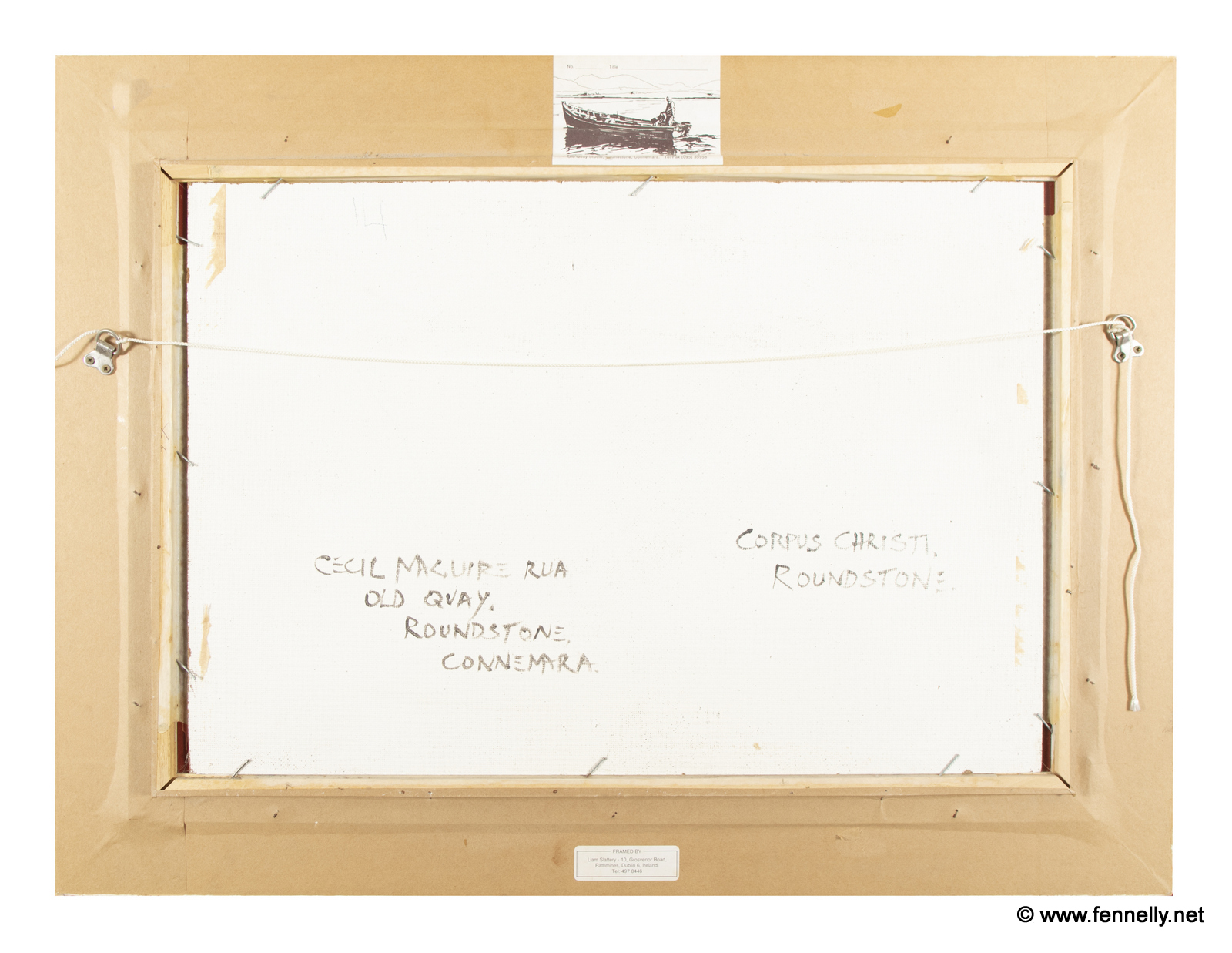 This is a superb Oil on Board by Cecil Maguire (1930-2020) – Depicting a scene from Roundstone on the occasion of Corpus Christi. The painting is signed lower left and nicely framed. Maguire always shows a passion for the West of Ireland capturing scenes of Connemara landscapes, harbours, village scenes and horse fairs. His work is in such collections as The United Nations Headquarters, New York and The Ulster Museum, Belfast. He won the RUA Perpetual Gold Medal in 1993.