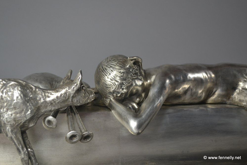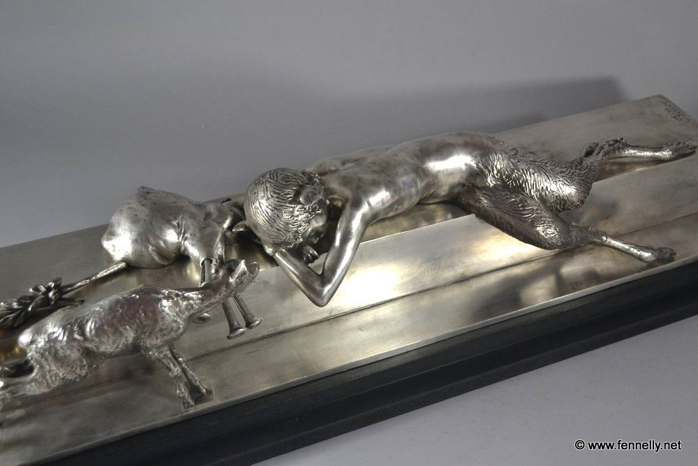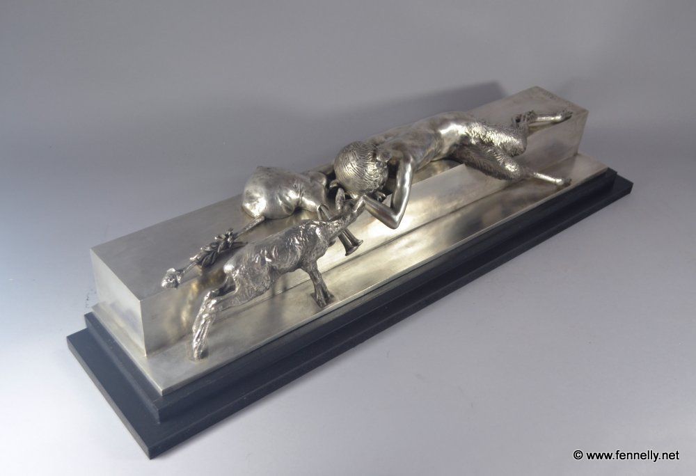 Magnificent Art Deco Sculpture from Circa 1925 by Ary Bitter (1883-1973). This majestic and large piece is very striking and depicts a sleeping faun, near his bagpipes, arousing a young deer’s curiosity. The inspiration for the piece’ with no doubt, is a homage to the famous symphony by Debussy “prelude to the afternoon of a faun”.