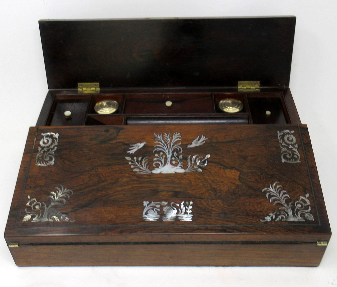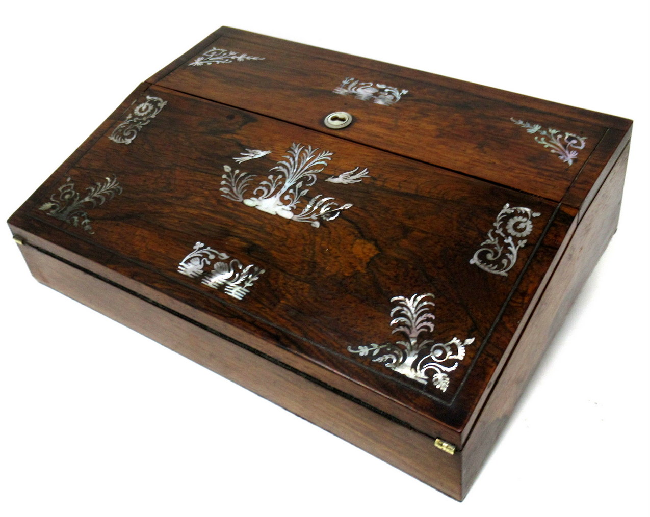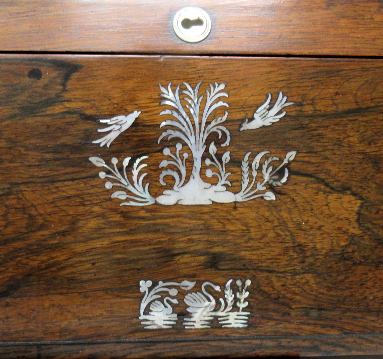 The entire outer main area with lavish Mother of Pearl inlays depicting scrolls and flowers, other areas with inlay of exotic flying birds and swans in waters, opening to reveal a wonderful fitted complete interior and a later dark green leather with lavish gold leaf tooling.