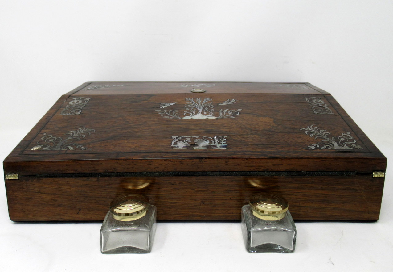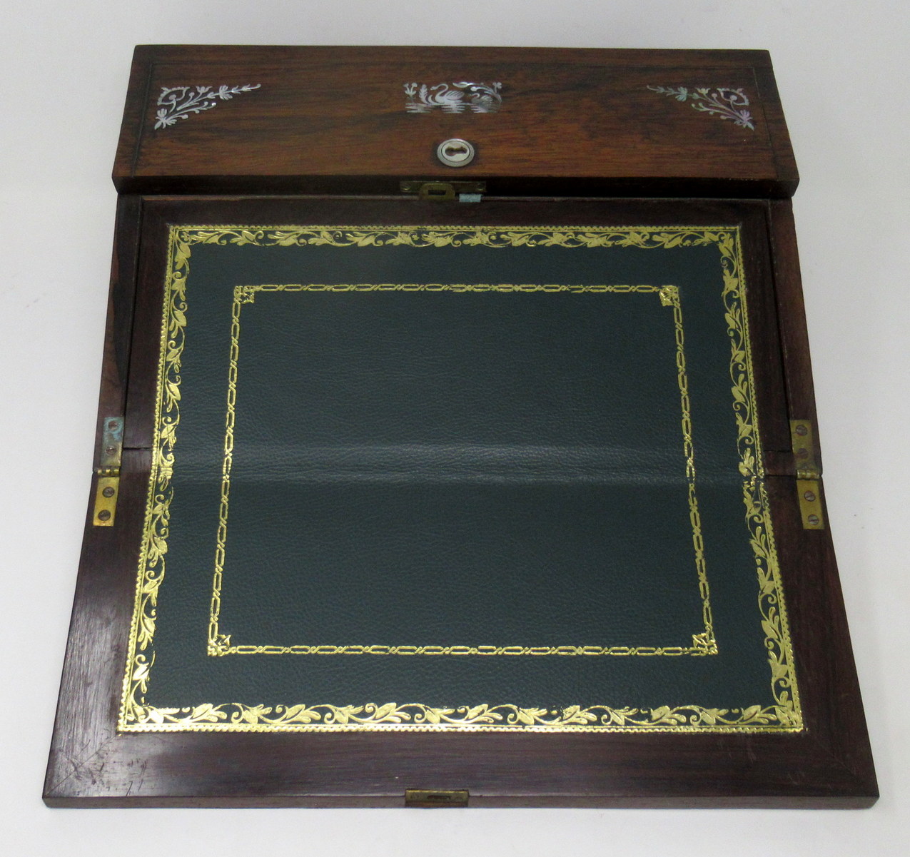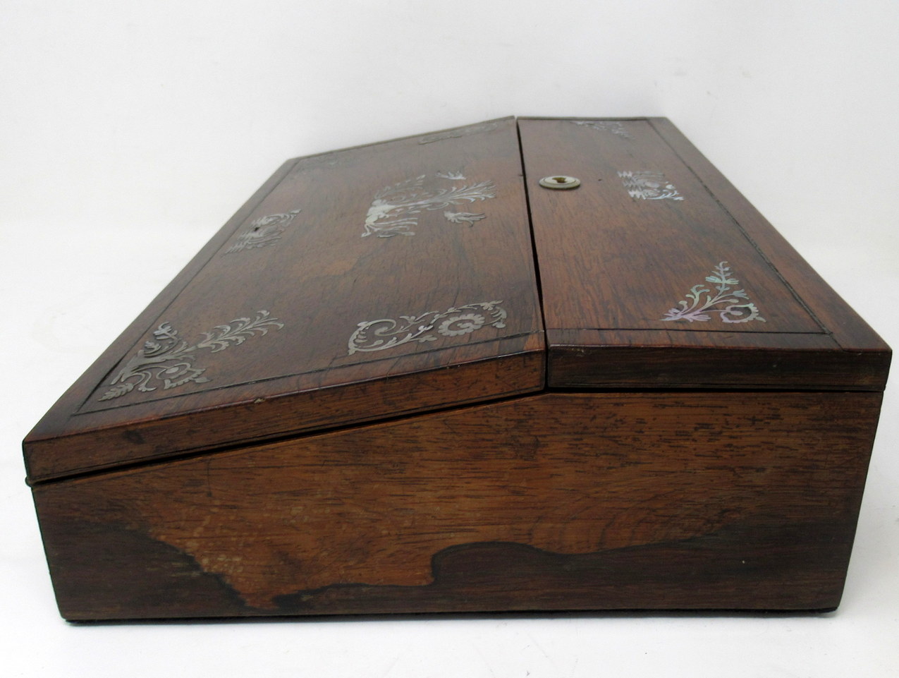 The entire outer main area with lavish Mother of Pearl inlays depicting scrolls and flowers, other areas with inlay of exotic flying birds and swans in waters, opening to reveal a wonderful fitted complete interior and a later dark green leather with lavish gold leaf tooling.