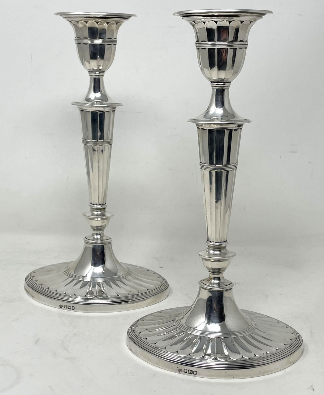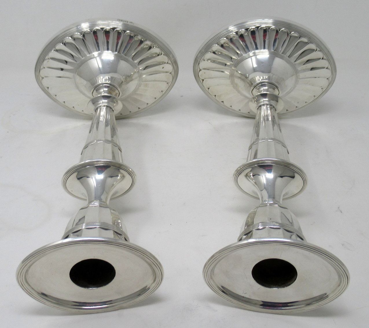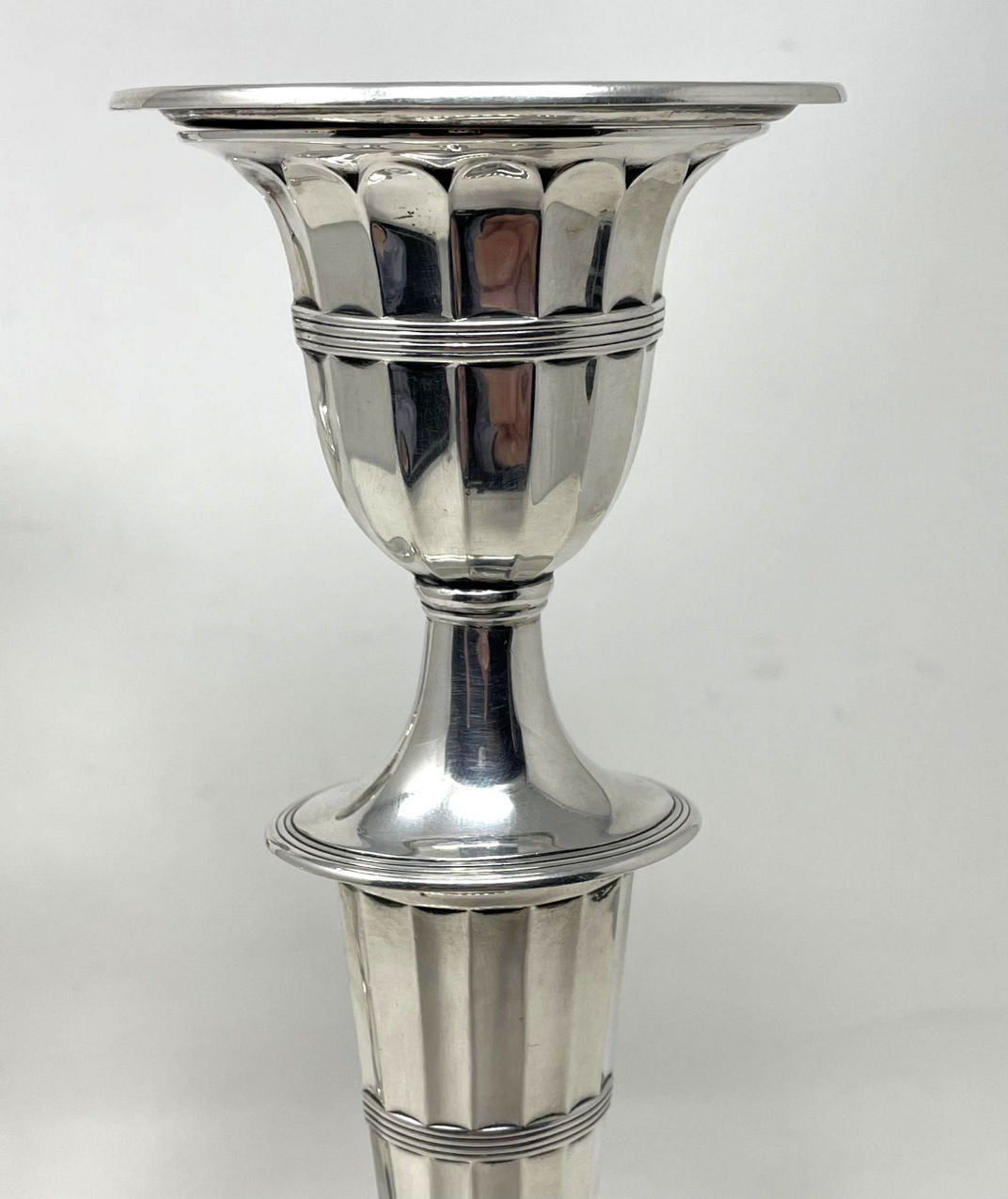Pair of early Edwardian English Adams Style heavy gauge Sterling Silver Single Light Table Candlesticks of outstanding quality and quite large proportions.