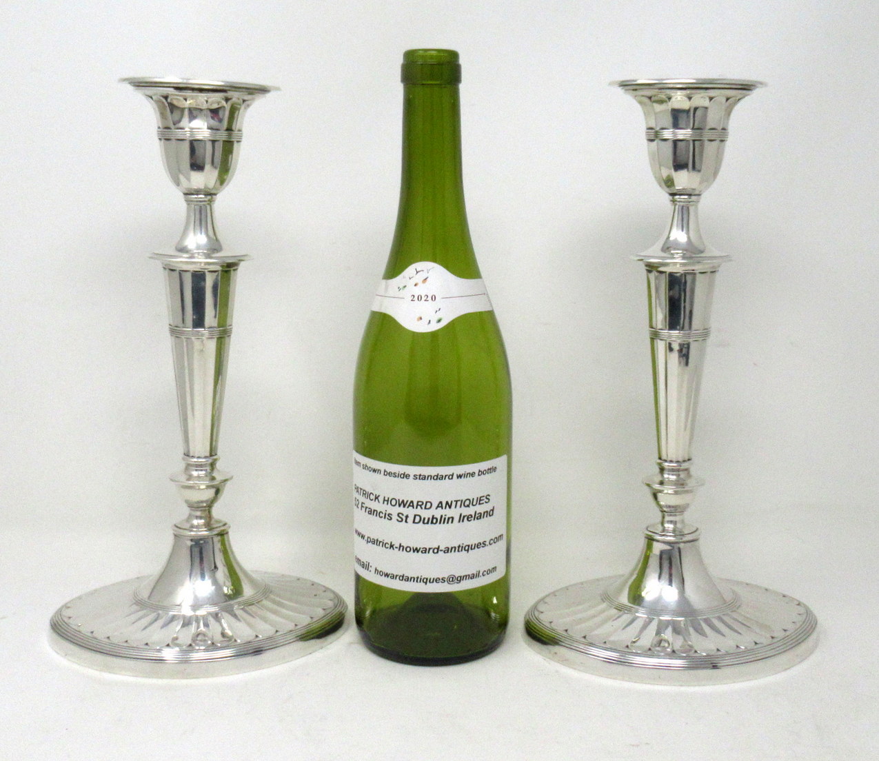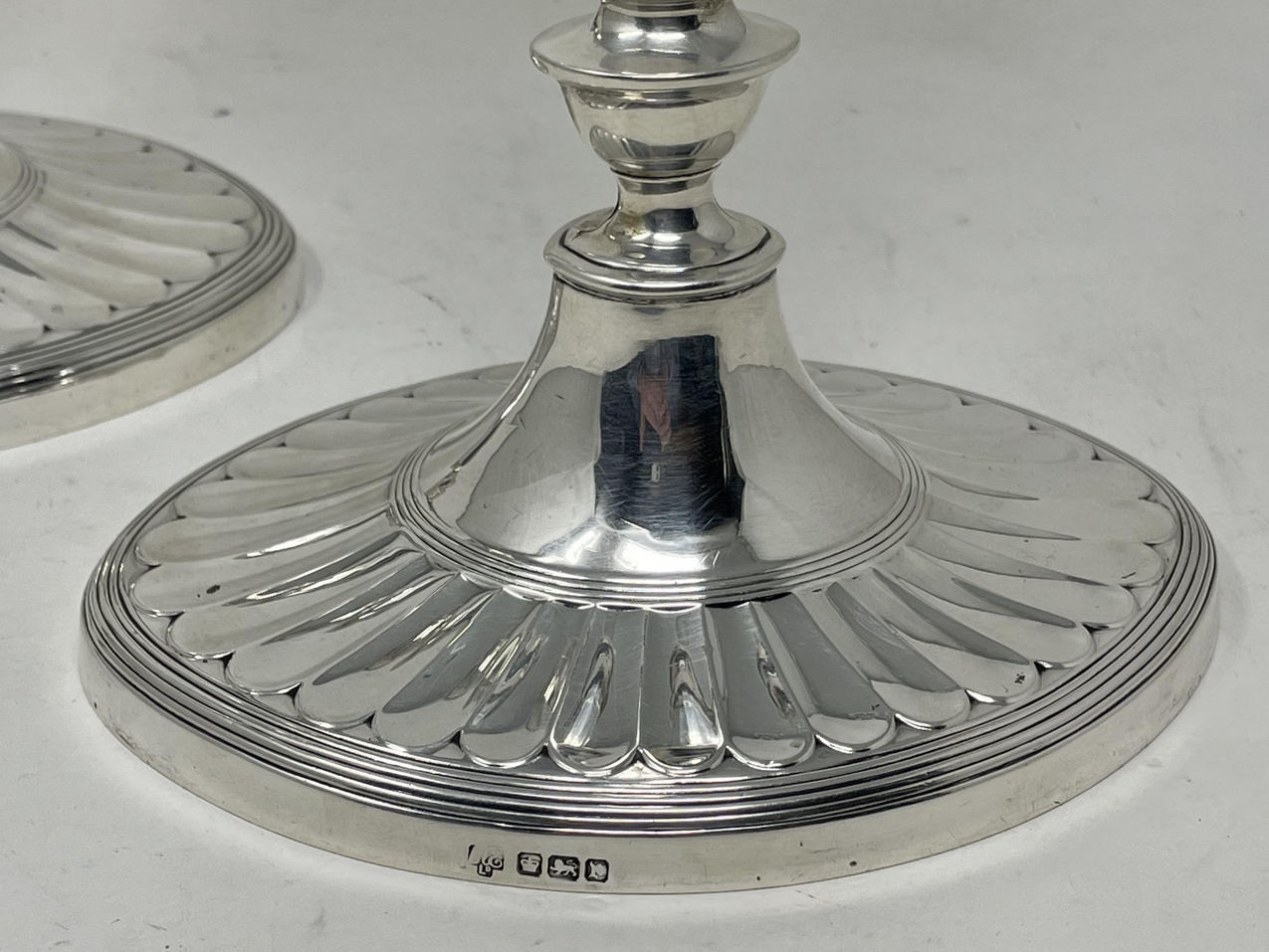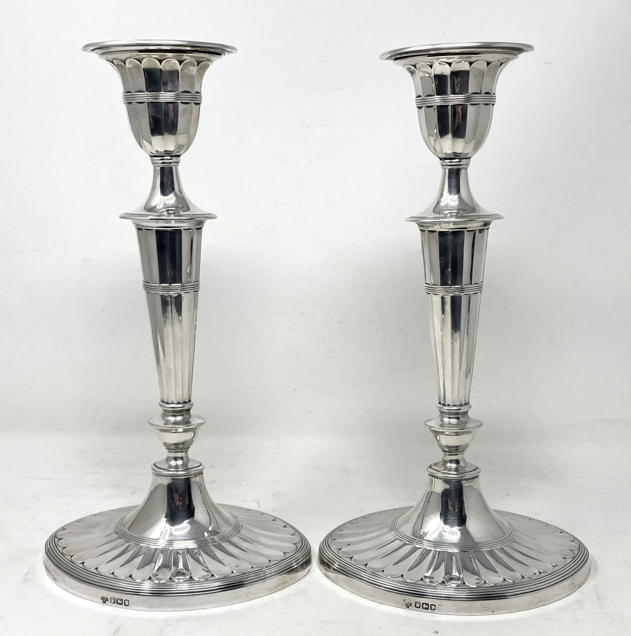 Pair of early Edwardian English Adams Style heavy gauge Sterling Silver Single Light Table Candlesticks of outstanding quality and quite large proportions.