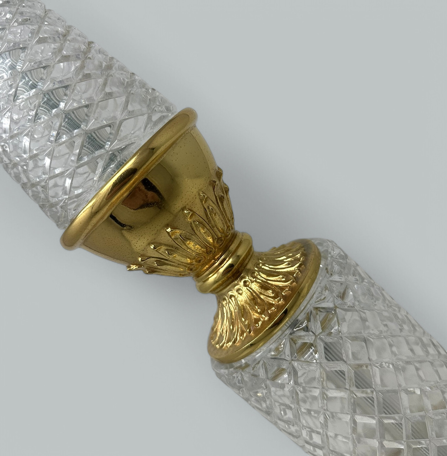 The main crystal tapering column above a decorative Ormolu socle ending on a circular crystal support with a circular ormolu heavy cast bronze dore base.