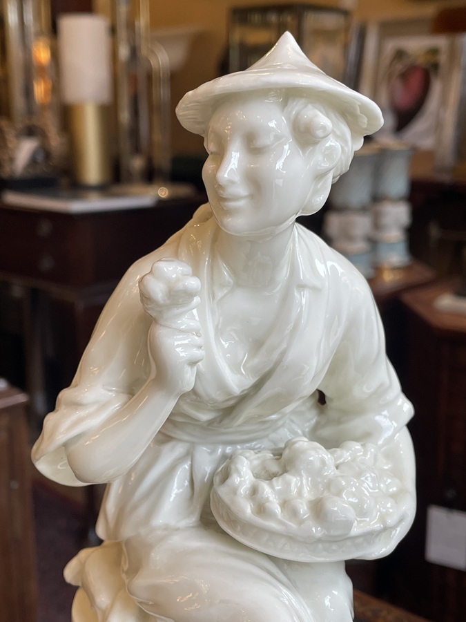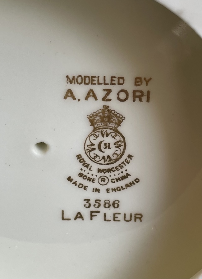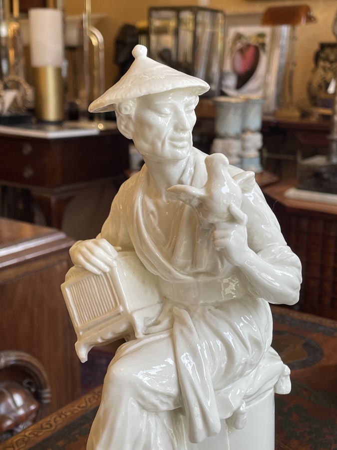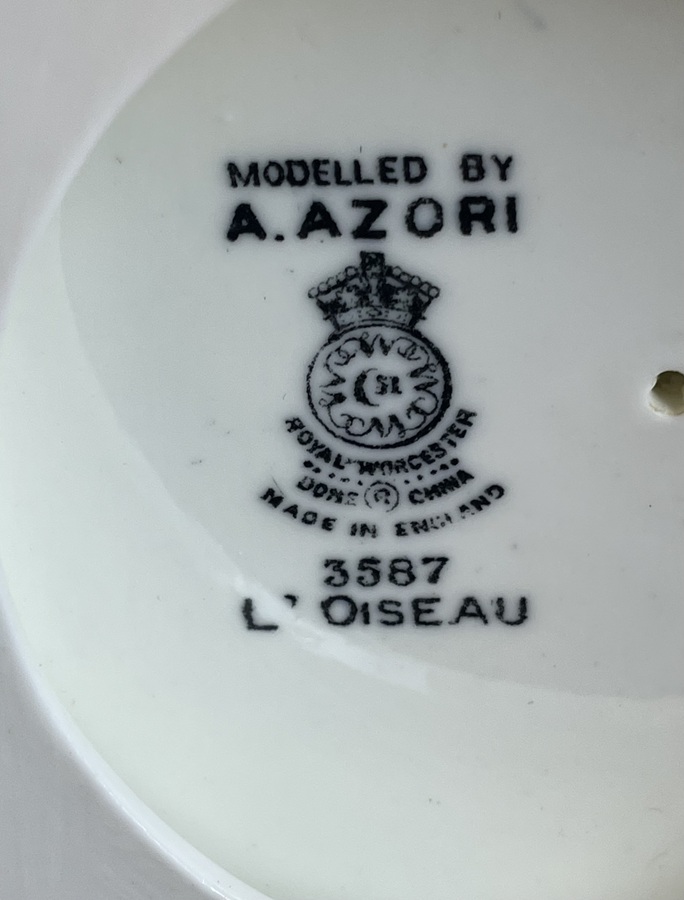Pair of porcelain bisque figurines designed by A. Azori for Royal Worcester in England. The pair is titled ‘La Fleur’ and ‘L’Oiseau’ and were manufactured in 1956 in the highly popular English chinoiserie style. Both pieces have makers marks on the bottom and are in excellent vintage condition with age-appropriate wear.
