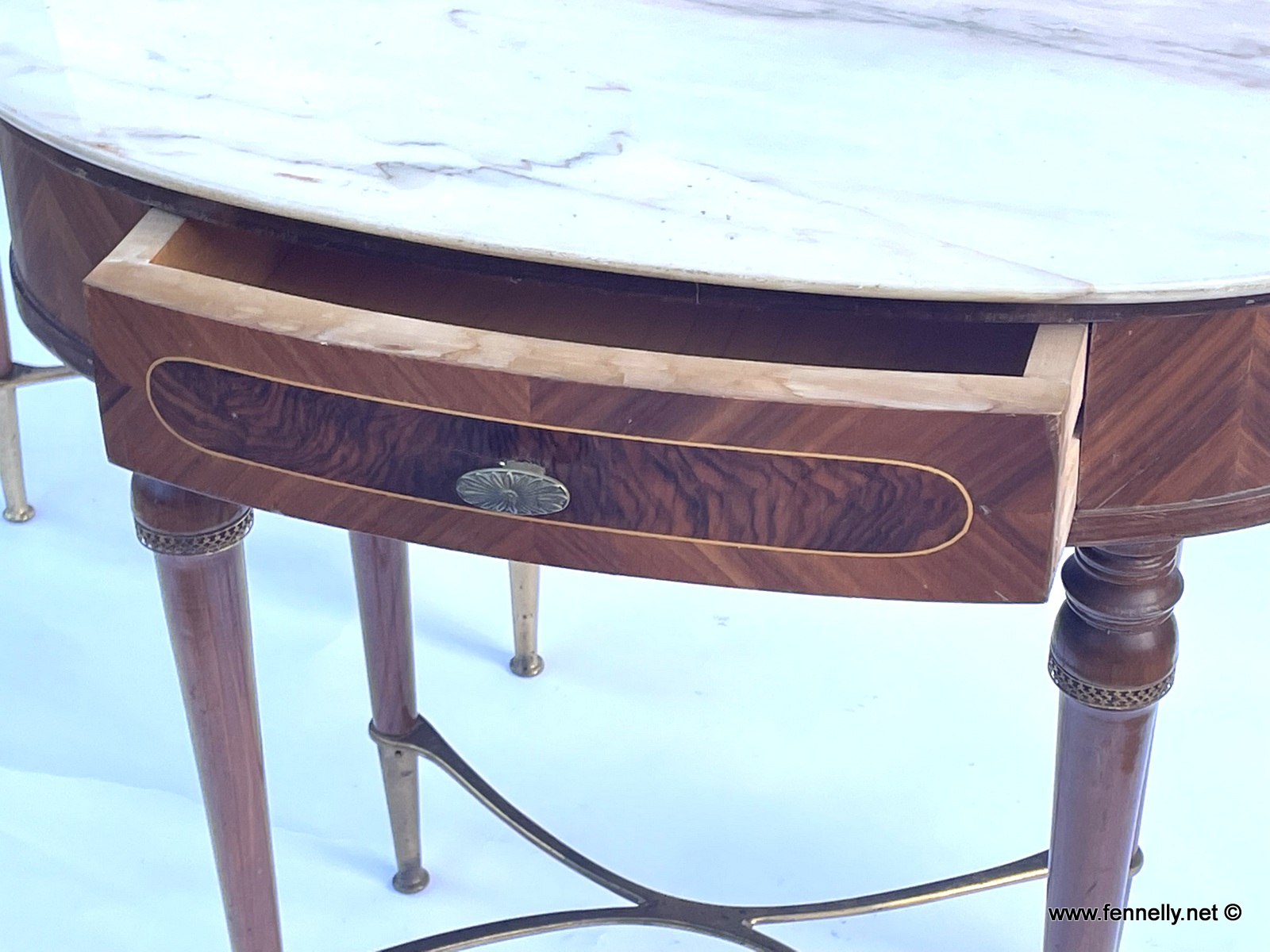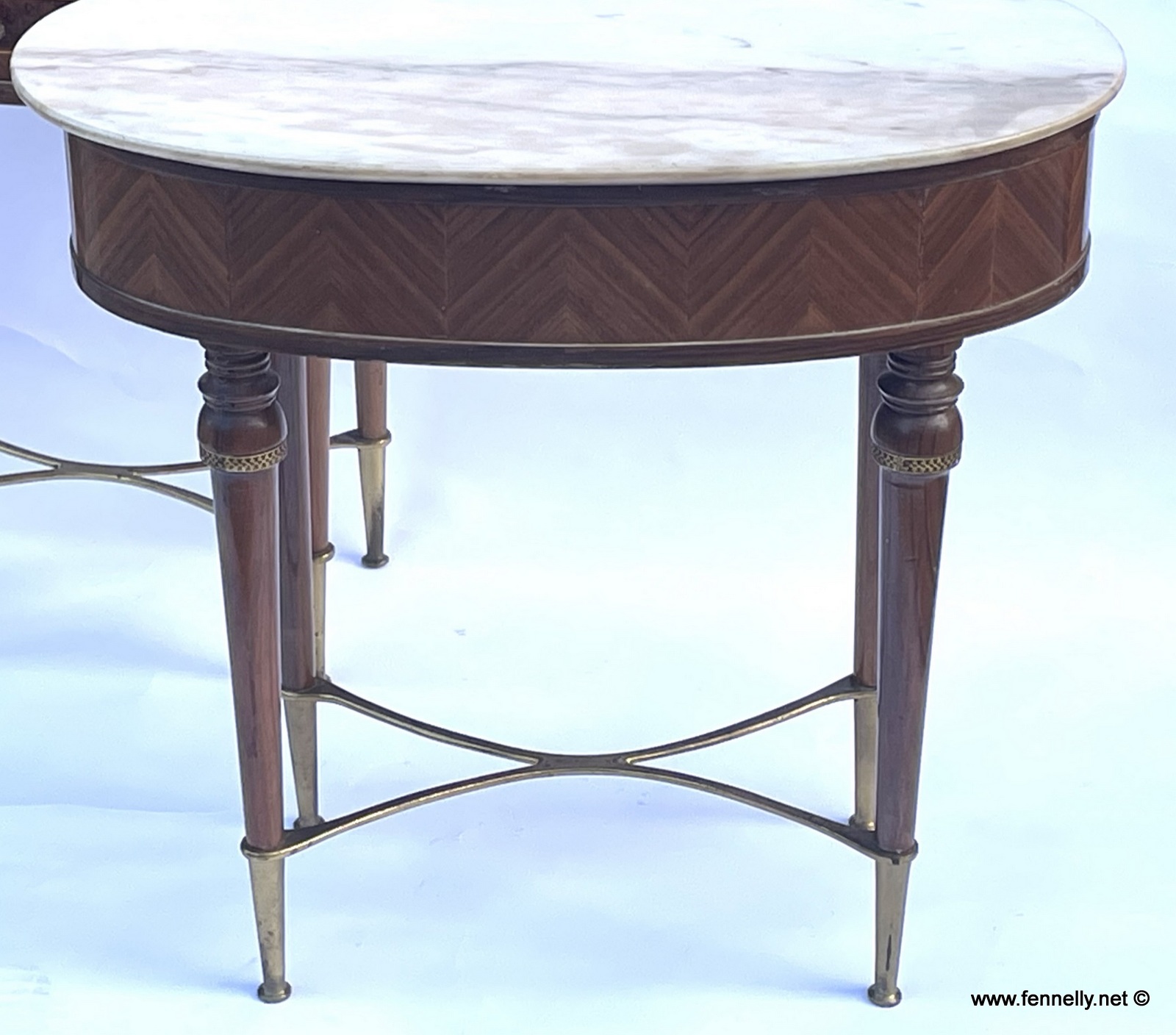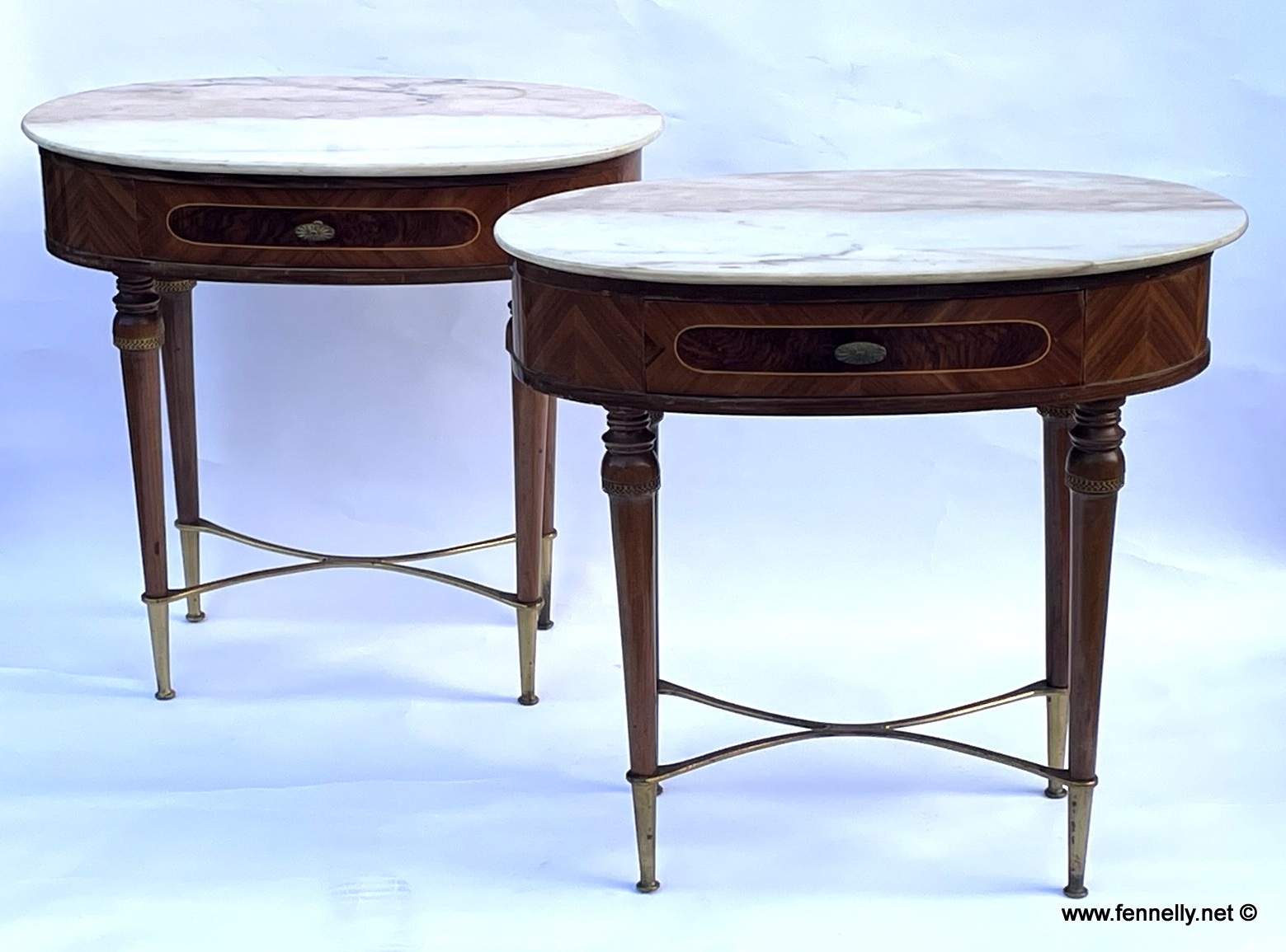 These are a rare and beautiful Pair of Italian Kingwood, Mahogany and Rosewood Cabinets/Night Stands dating to Circa 1950. With original Carrara Marble tops these Cabinets make for a handsome addition to the stylish bedroom or livingroom. They are in a superb oval design with the main body of the pieces in Kingwood. They have a single drawer with Rosewood veneer to the front, raised on tapering Mahogany legs with extended brass sabots. They have an unusual feature with an elegant brass strecher to the base. These beautful pieces are excellent examples of Mid Century Italian design and are a very stylish pair They are in great condition with original brass pulls. These are a very sought after design and currently very much the interior design choice. I was fortunate to locate them in Italy recently and they draw admiring glances from all that visit my Gallery.