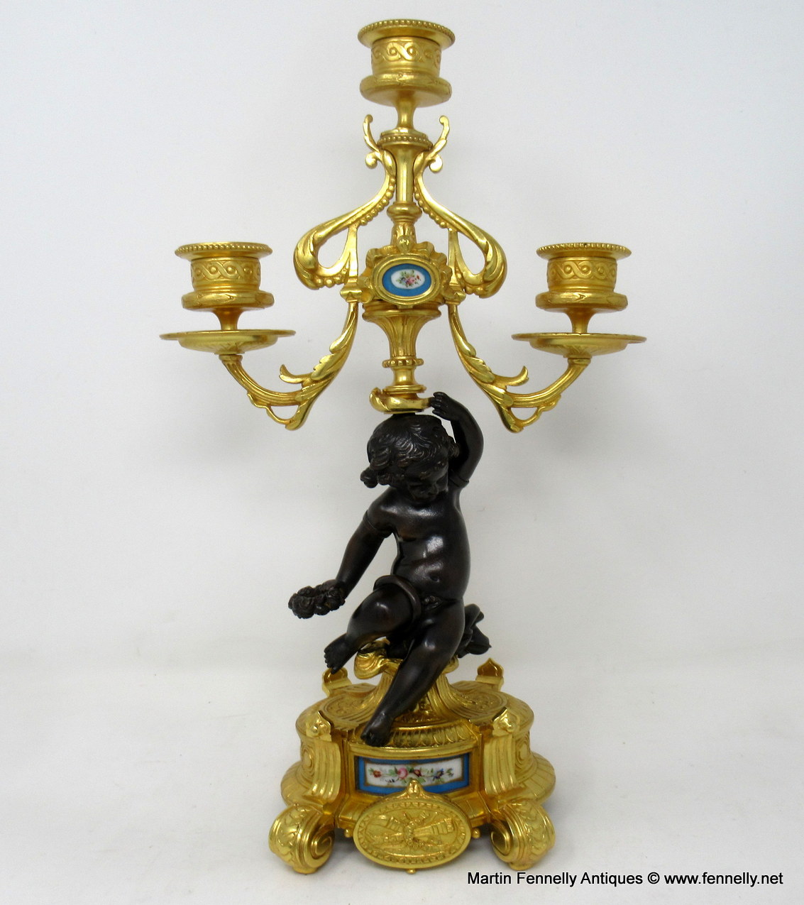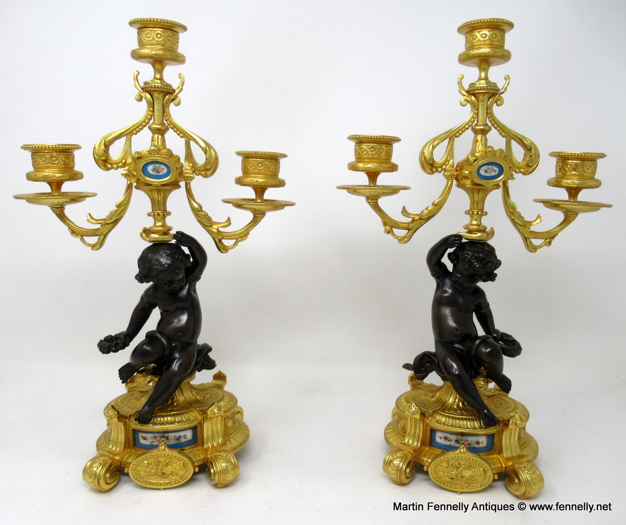 Each with a central seated patinated solid bronze Cherub holding a loft on one hand a three-branch candelabra and a naturalistic wreath on the other, ending on an ornate circular ormolu base with a hand decorated celeste blue porcelain inset and a superb oval central ormolu plaque depicting a pair of flame torches, supported on four scrolling feet.