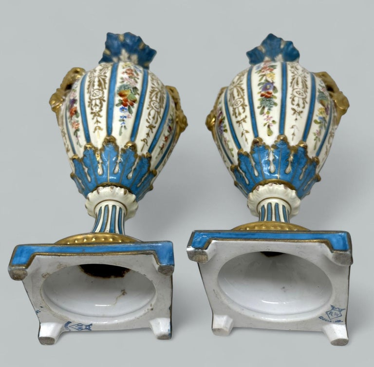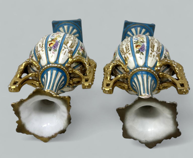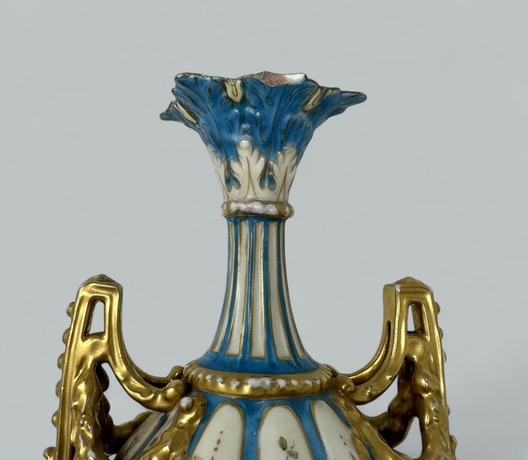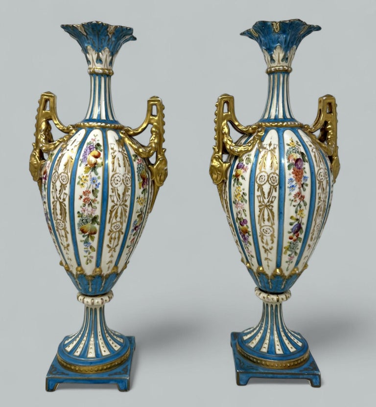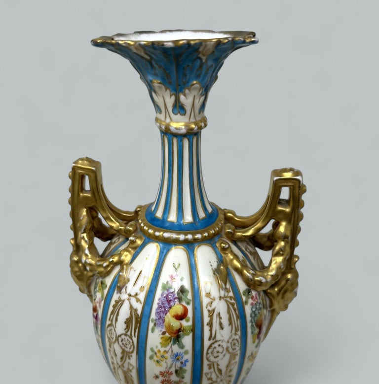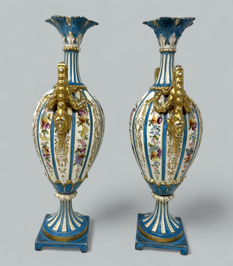 A Very Stylish German Royal Rudolstadt Hand Painted Twin Handle Lidded Porcelain Vases of Ovoid Outline and impressive proportions, last quarter of the Nineteenth Century. The lobed body with heavily gilded mask handles above elegant female faces, superbly decorated with alternating lobed panels of floral sprays and leaves and fruits and berries in relief, ending with similar decoration to circular spreading base on square support. Condition: Superb condition for such an early piece, small loss at top rim on each vase, see detailed images, some wear to gilding at high points. Base mark RW for period 1887-1918.