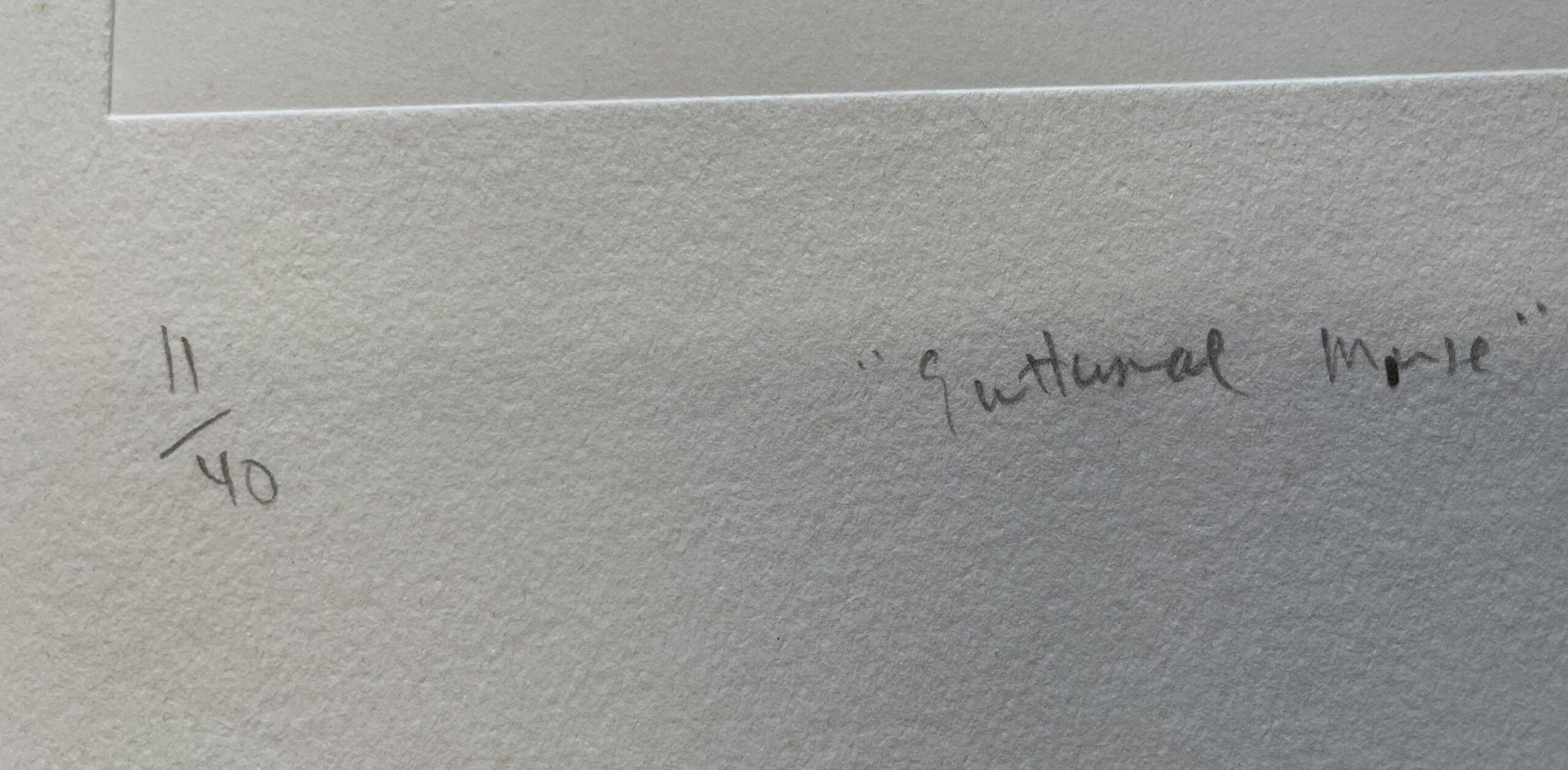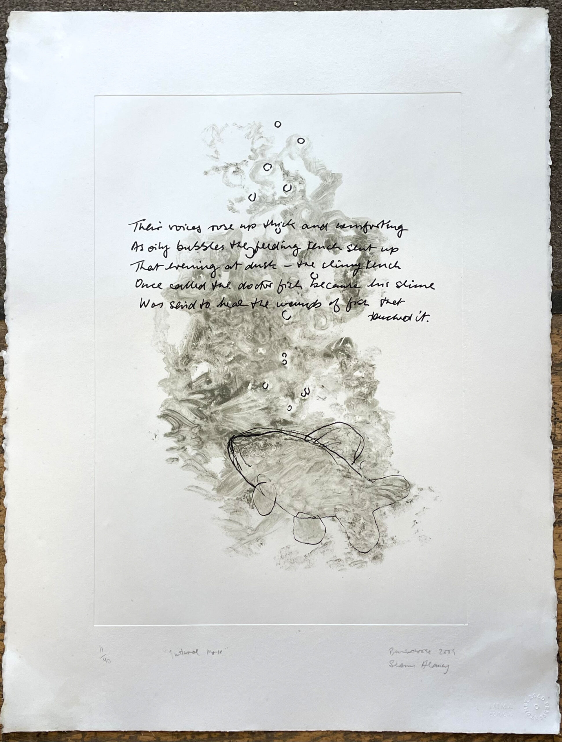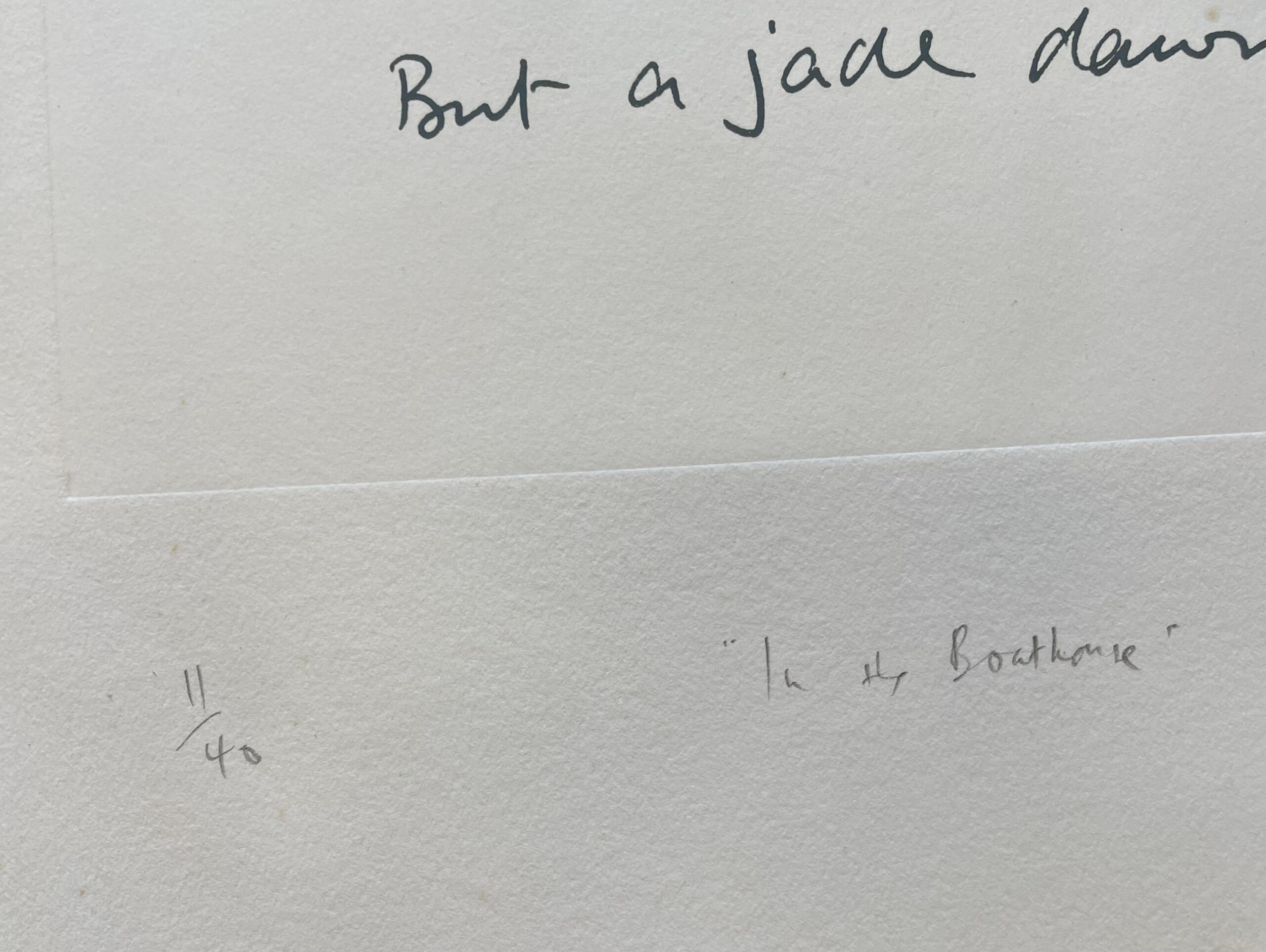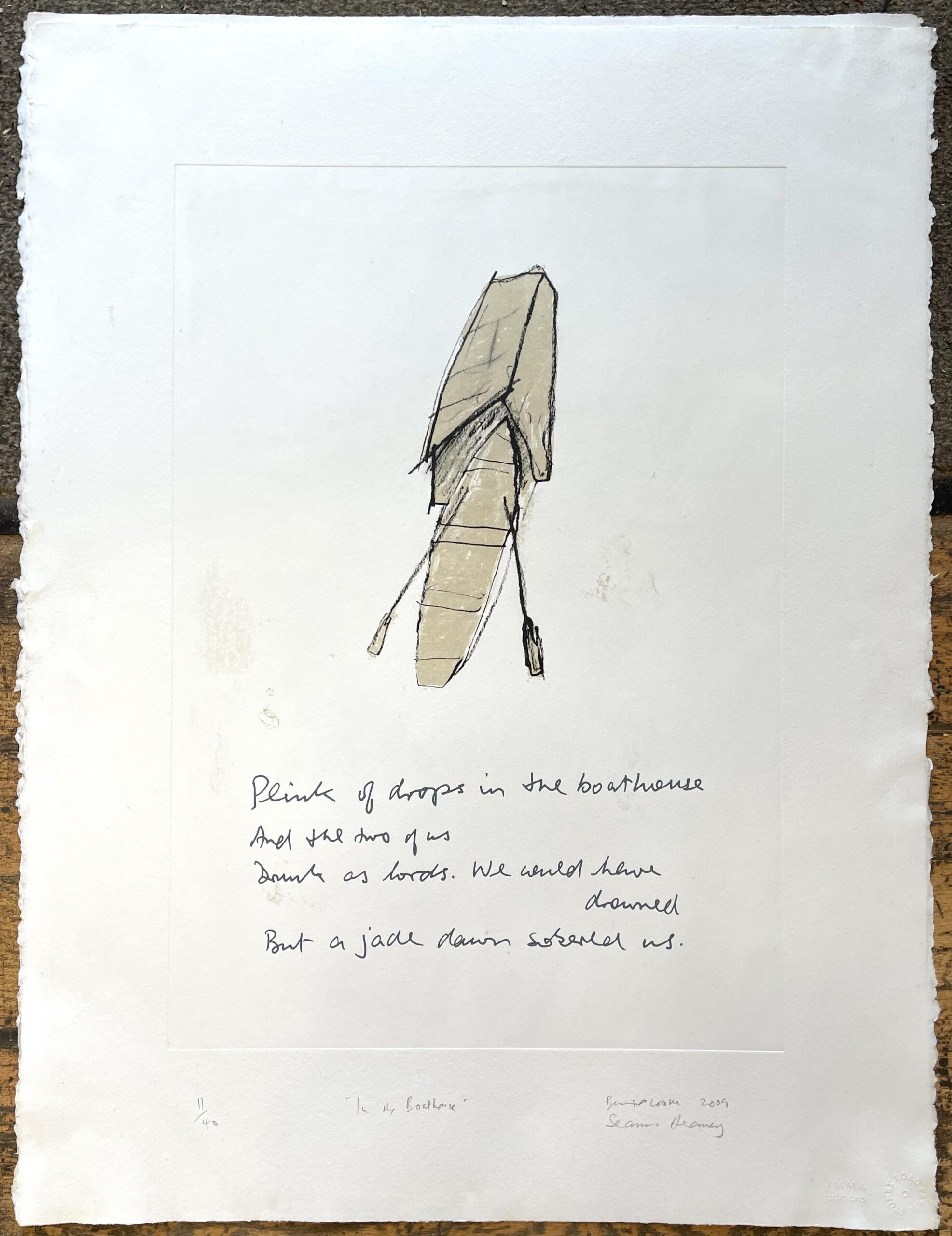 This Pair are number 11 / of 40 Limited Edition Prints from Barrie Cooke and Seamus Heaney – 2009. Guttural Muse and In the Boathouse. They are signed and numbered and come with original Certificate from The Irish Museum of Modern Art. They are colour intaglio limited prints and handprinted on Moulin de Gue paper. They were conceived exclusively by Barrie Cooke and Seamus Heaney for IMMA. They are framed. It is important to note that these are an original pair numbered with certificates and the copyright remains the Artists. Barrie Cooke (1931-2014) was born in Cheshire UK and was exhibited in some of the finest galleries and museums around the World. Seamus Heaney (1939-2013) MRIA was an Irish poet, playwright and translator. He received the 1995 Nobel Prize in Literature. It is a great honour to have these and offer them for sale.