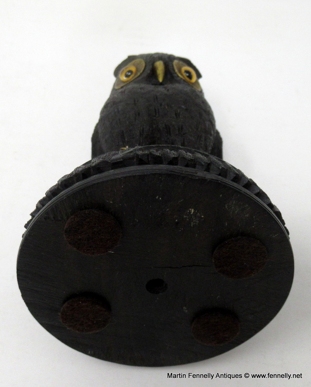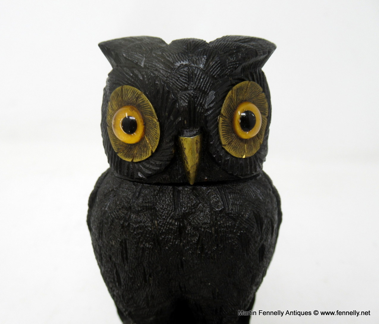 Fine and Rare Hand Carved Irish Bog Oak Figural Owl of Museum Quality and medium proportions, The quality and crispness of the carving means we can firmly attribute this to Cornelius Goggin, Carver to the Queen and based at Nassau Street Dublin. Made during the Mid Nineteenth Century.