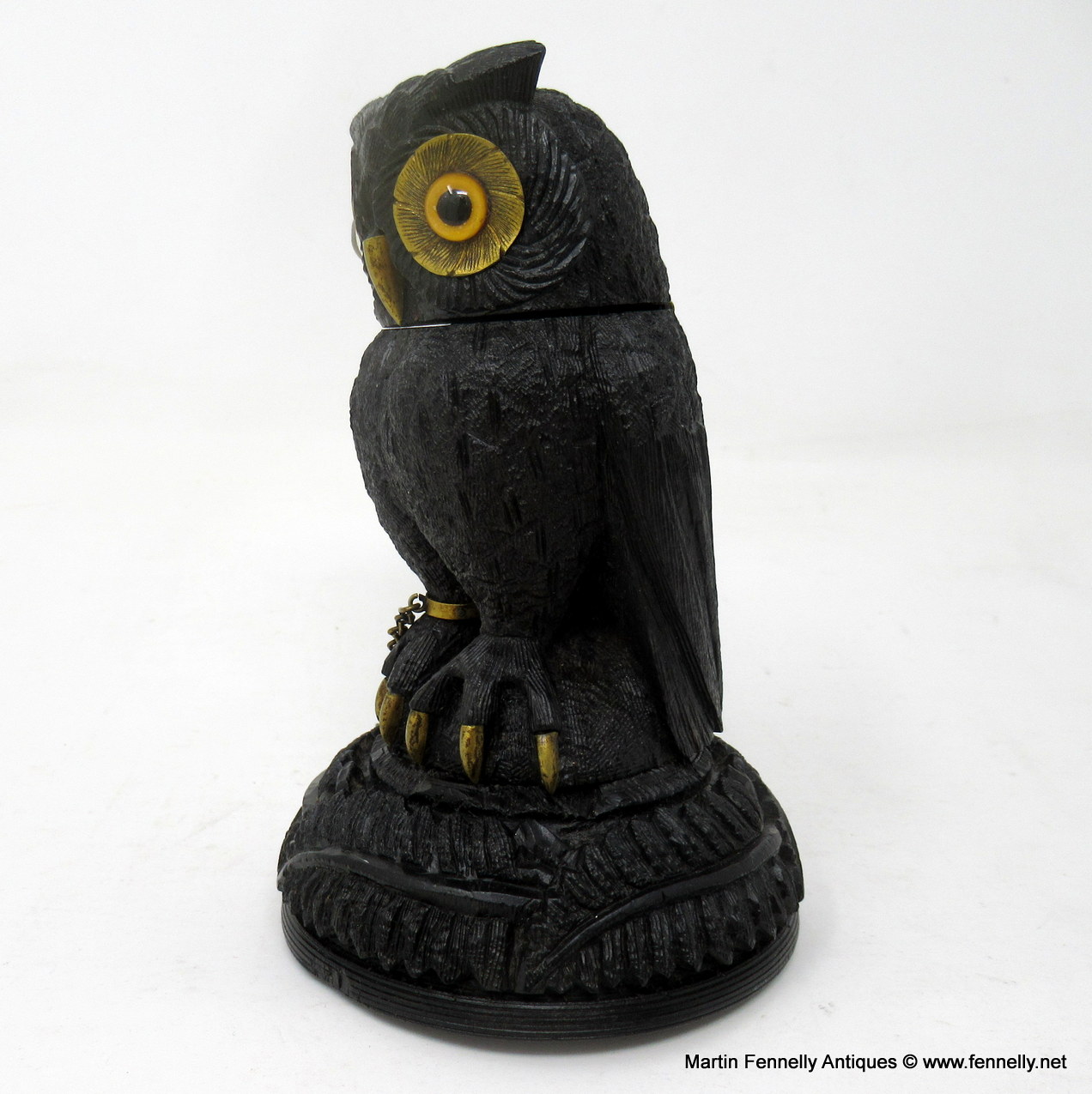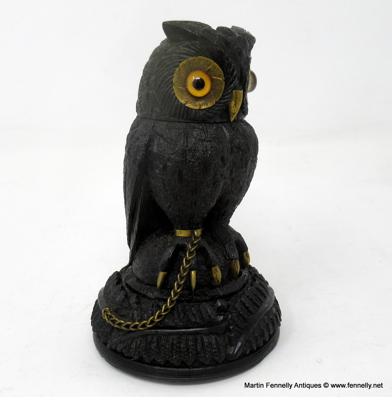 The Owl is firmly perched on a naturalistic base with its brass talons present, one foot is chained to lower base which is lavishly carved depicting overlapping ferns all around.