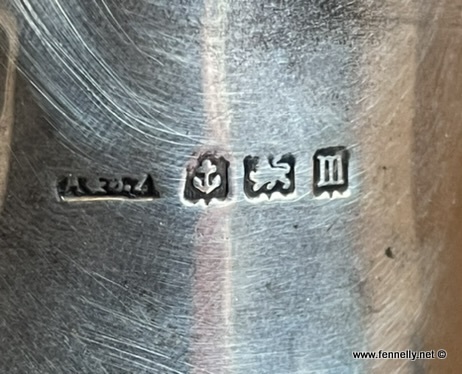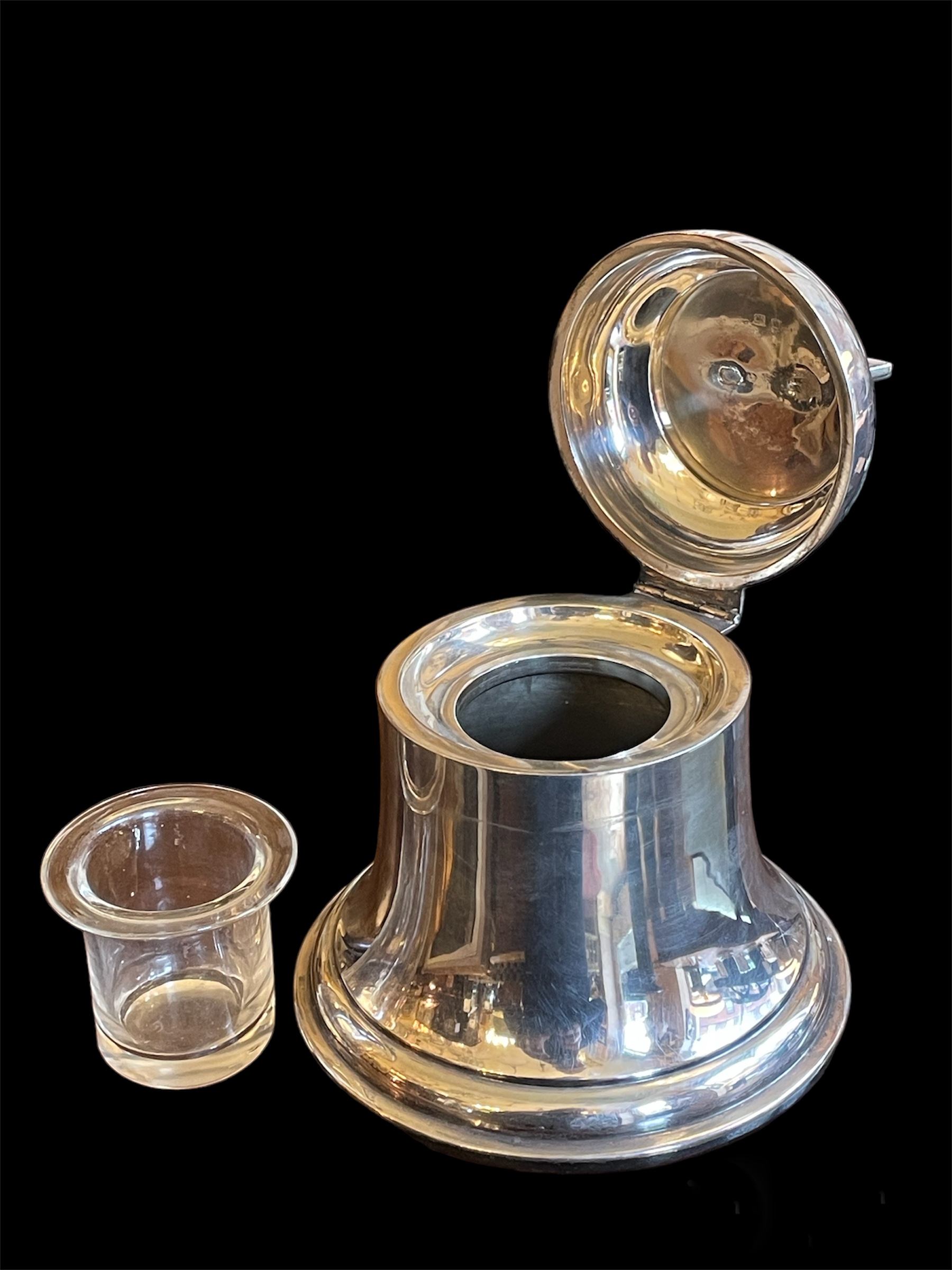 This is a large and Impressive novelty Solid Silver inkwell in the form of a bell. It has a plain finish with a hinged top which is set with an angular handle. It comes with a good-fitting clear glass liner. This piece is clearly hallmarked for Birmingham 1912 with the maker’s mark of A & J Zimmerman. This inkwell is in good condition with just a few minor marks consistent with age. The original leather base has some marks consistent with age but overall in good condition – There were various sizes of this novelty bell made and I believe this one to be the largest.