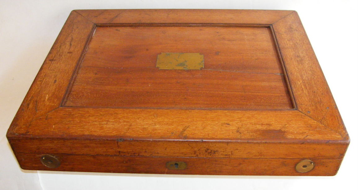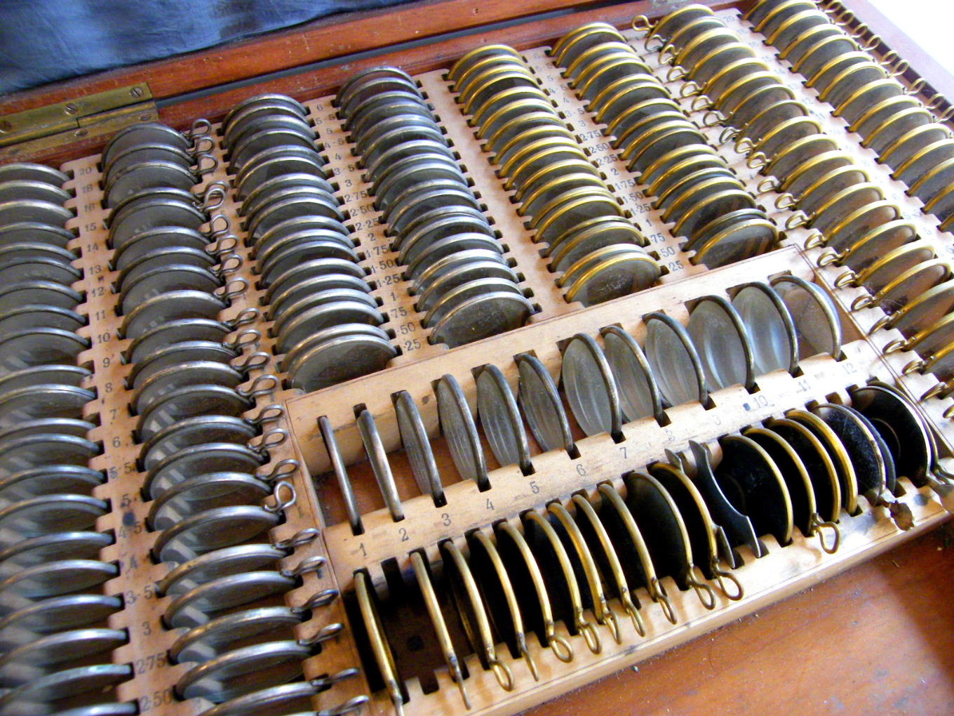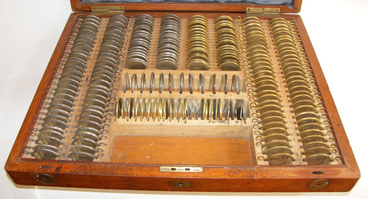 A late 19th Century Optician’s trail case, by Curry & Paxton, 195, Gt. Portland St. London. The case compartmentalised to house spherical concave and convex lenses, cylindrical convex and concave lenses, smoked, blue and prism lenses. This complete set !! which is rare and housed in a beautiful mahogany box with blue plush-lining in the interior and bevelled glazing to the lid, a brass escutheon (no key) and two disc locks.