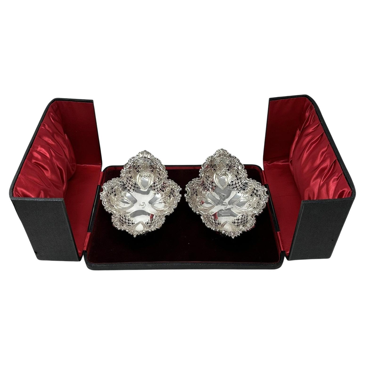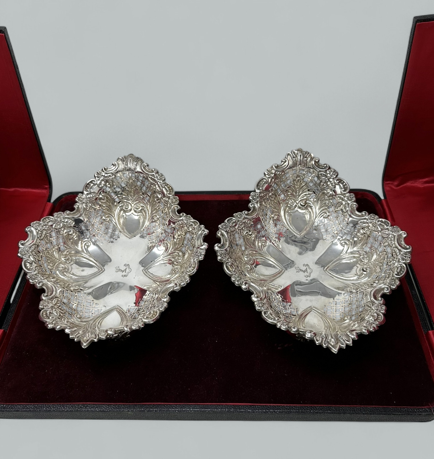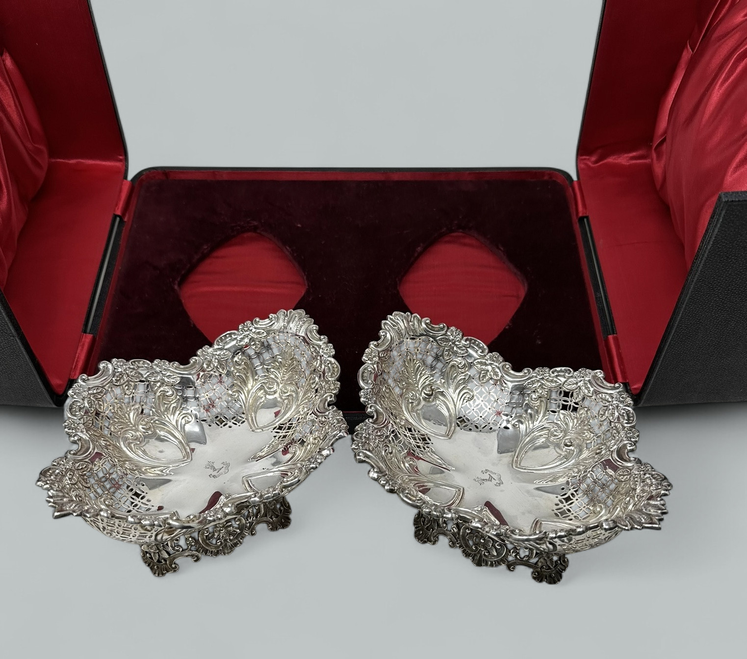 The stylish oval form crested dishes with lavish pierced decoration to main body and foot depicting foliage and flowers, raised on a separate attached base with similar detailing. Mark of R & W Sorley. Hallmark Scottish Glasgow 1900. William Sorley & William Steele trading as R & W Sorley, St Vincent Street & Renfield Street, Glasgow, also at Buchanan Street, Glasgow & Argyle Street, Glasgow. Condition: Good condition for such early pieces with no losses anywhere, nice surface patination allover. Original box closes firmly, has tiny evidence of age wear. Stunning red silk fabric interior is perfect.