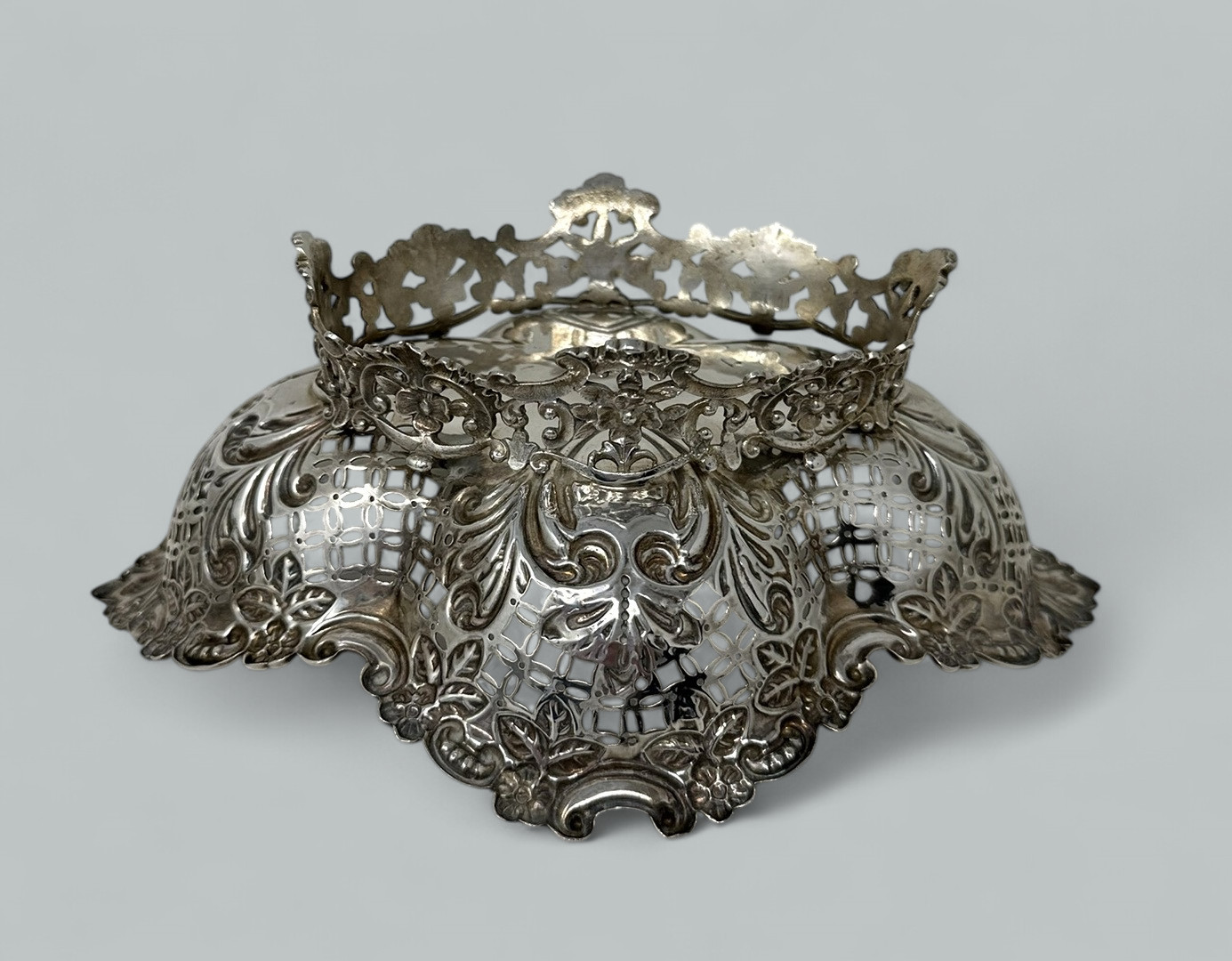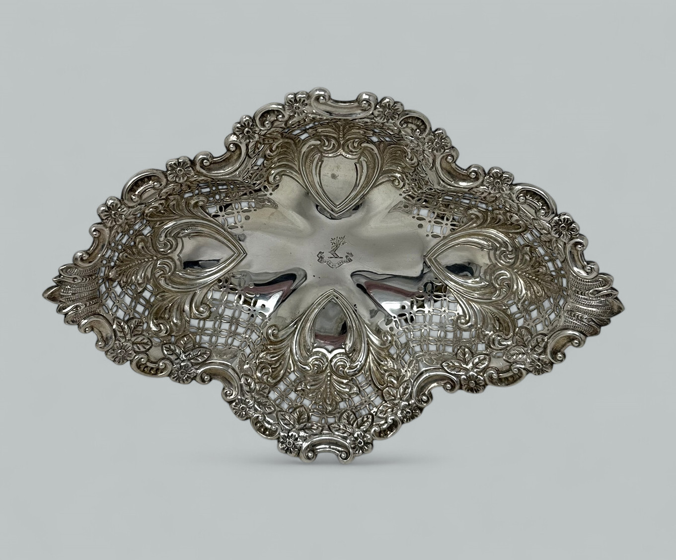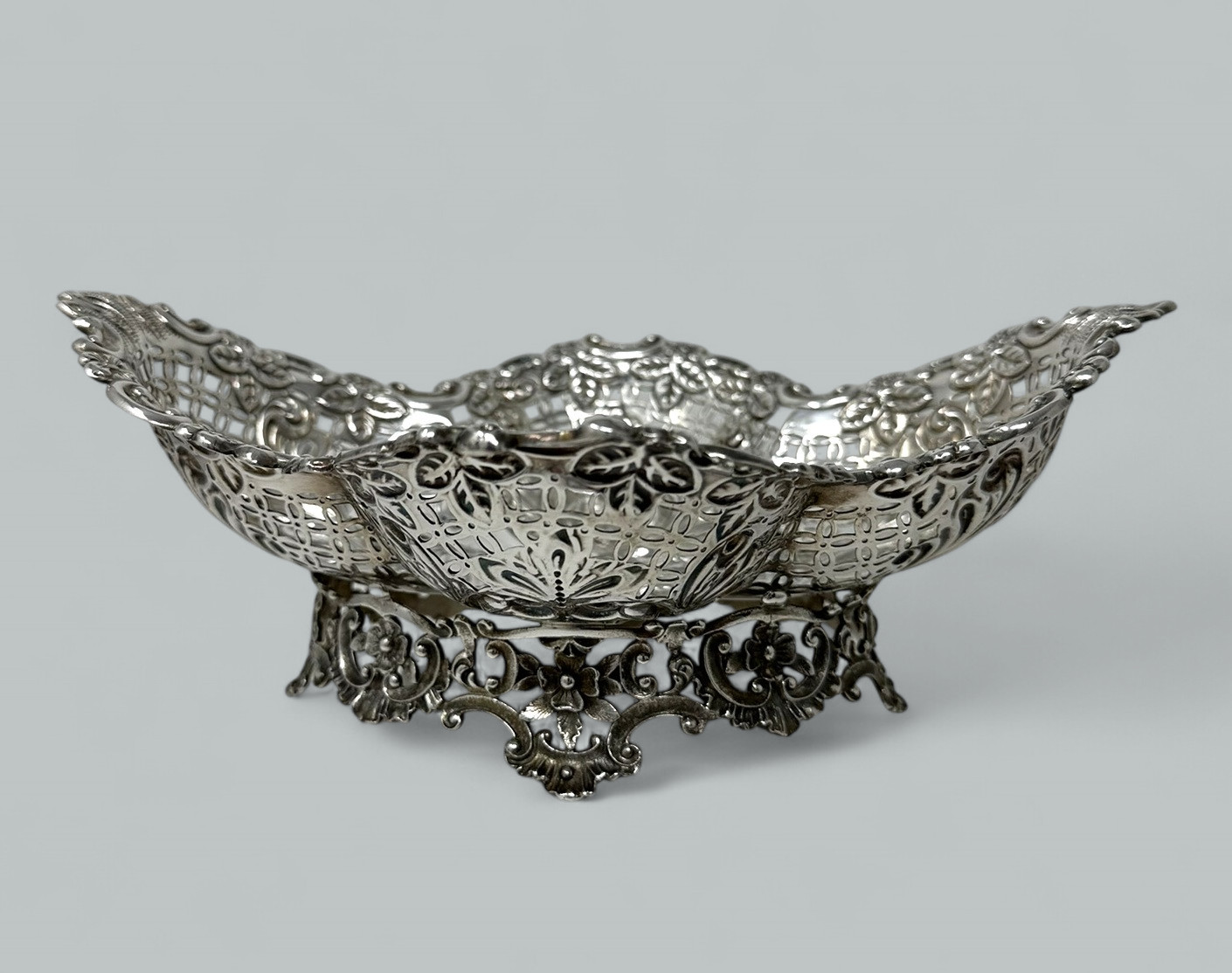 The stylish oval form crested dishes with lavish pierced decoration to main body and foot depicting foliage and flowers, raised on a separate attached base with similar detailing. Mark of R & W Sorley. Hallmark Scottish Glasgow 1900. William Sorley & William Steele trading as R & W Sorley, St Vincent Street & Renfield Street, Glasgow, also at Buchanan Street, Glasgow & Argyle Street, Glasgow. Condition: Good condition for such early pieces with no losses anywhere, nice surface patination allover. Original box closes firmly, has tiny evidence of age wear. Stunning red silk fabric interior is perfect.