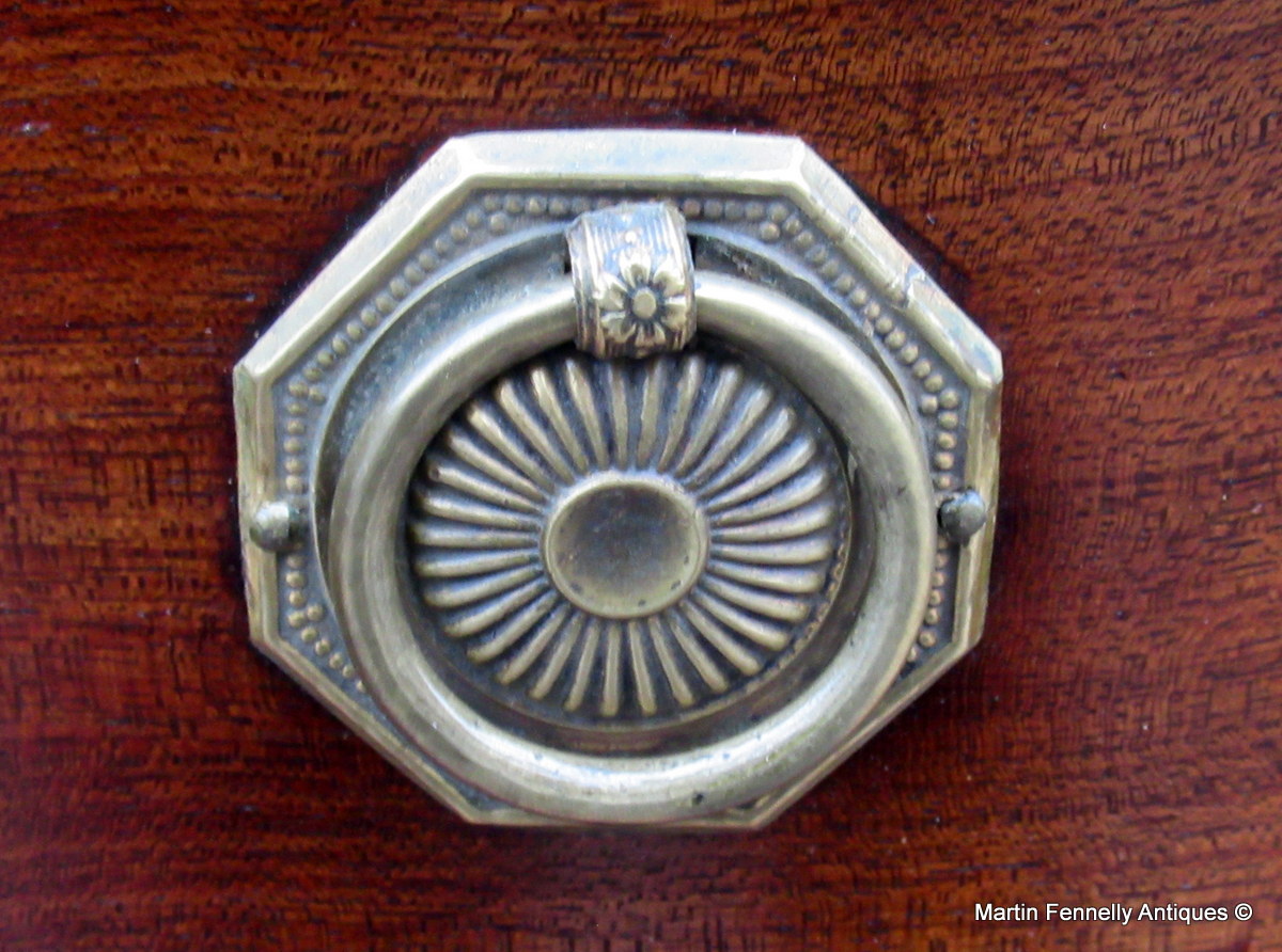 This is a superb Rregency English Chest of drawers dating to Circa 1810 and in superb condition for a piece over 200 years old. It is English and made from Mahogany with brass handles. The chest has a rare design configuration with Bow Front, 4 Central graduated drawers and side cabinets discreetly behind side doors. This is a rare little chest and very heavy. The cockbeading is all intact and 200 years has created a deep rich patina that make the piece very appealing to the eye.
