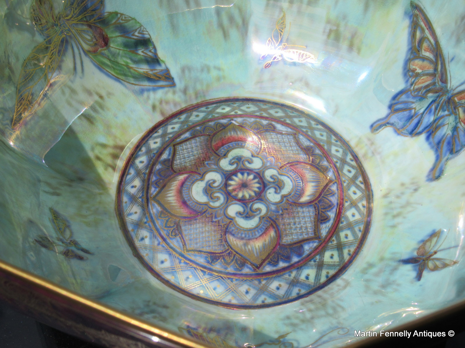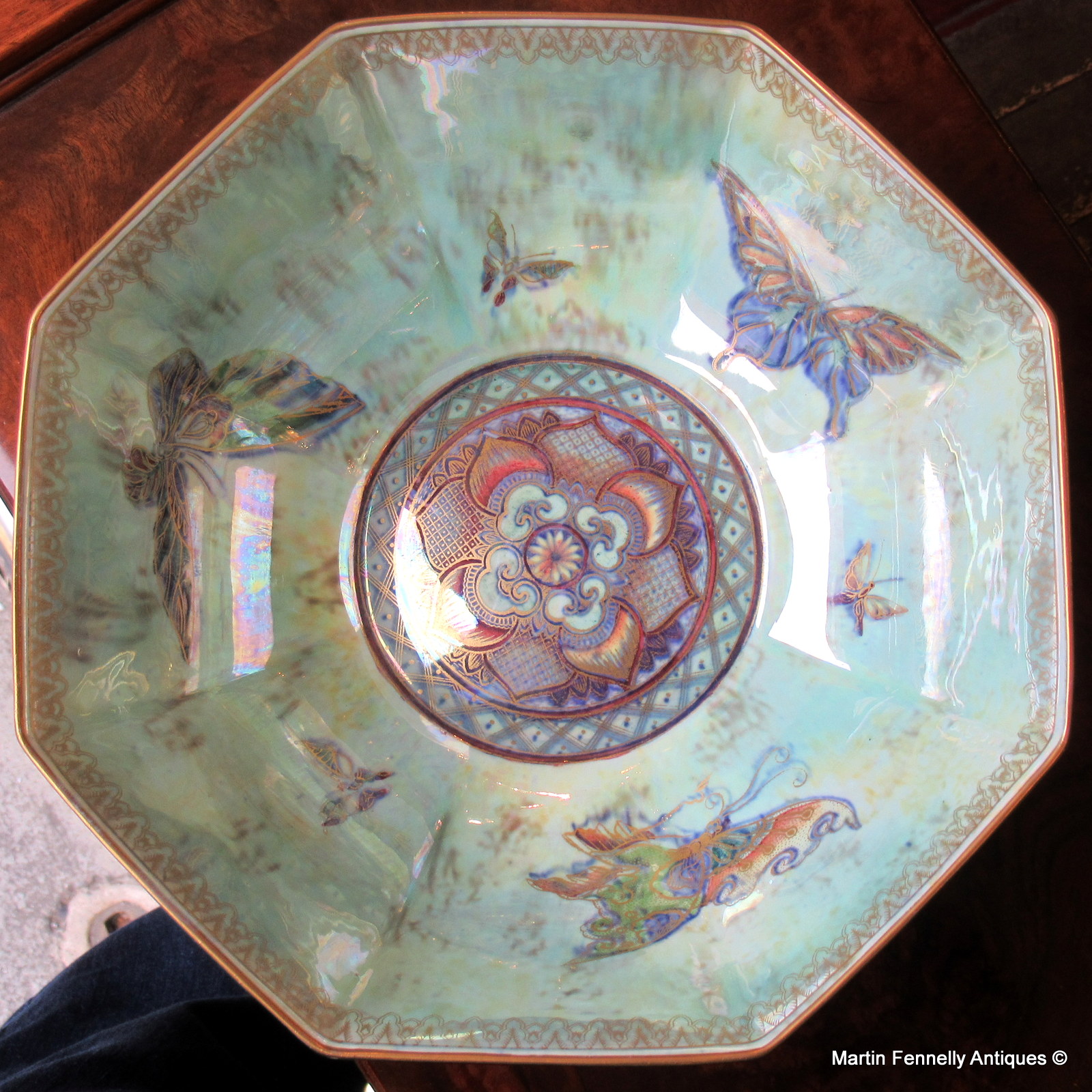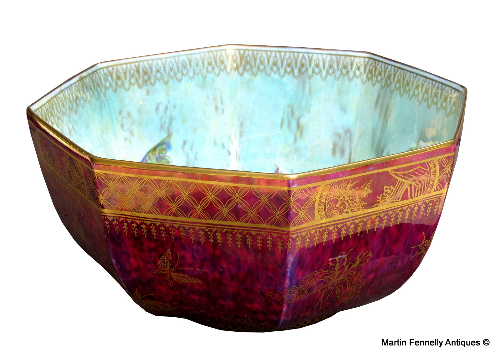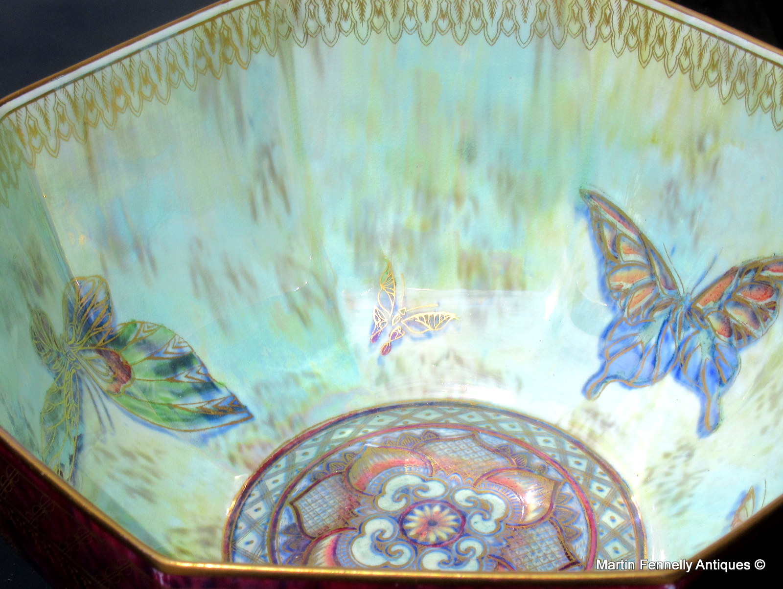 Superb Wedgwood ‘Butterfly’ lustre bowl, Circa 1920-30 by Daisy Makeig Jones , of octagonal form the exterior decorated with gilt illustrations portraying butterflies and further insect reserved against a rich magenta and purple ground, the interior adorned with central rosette roundel, surrounded by butterflies, below a stiff leaf rim border, all reserved against a green to blue lustre ground. The printed gilt mark and pattern number Z4827 to base.