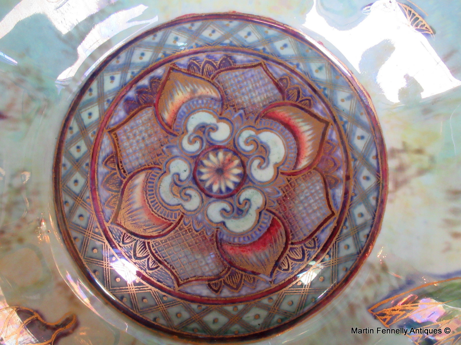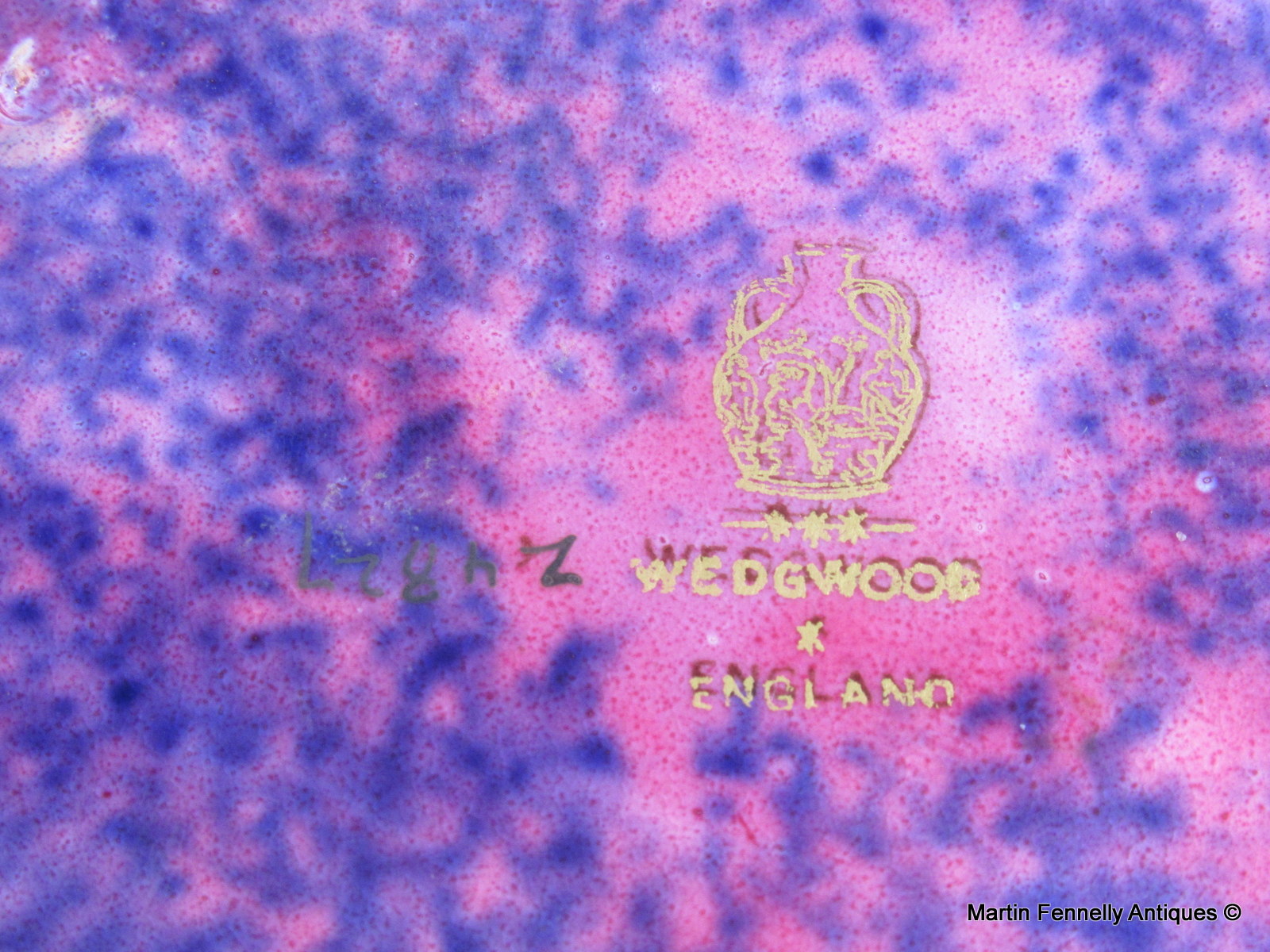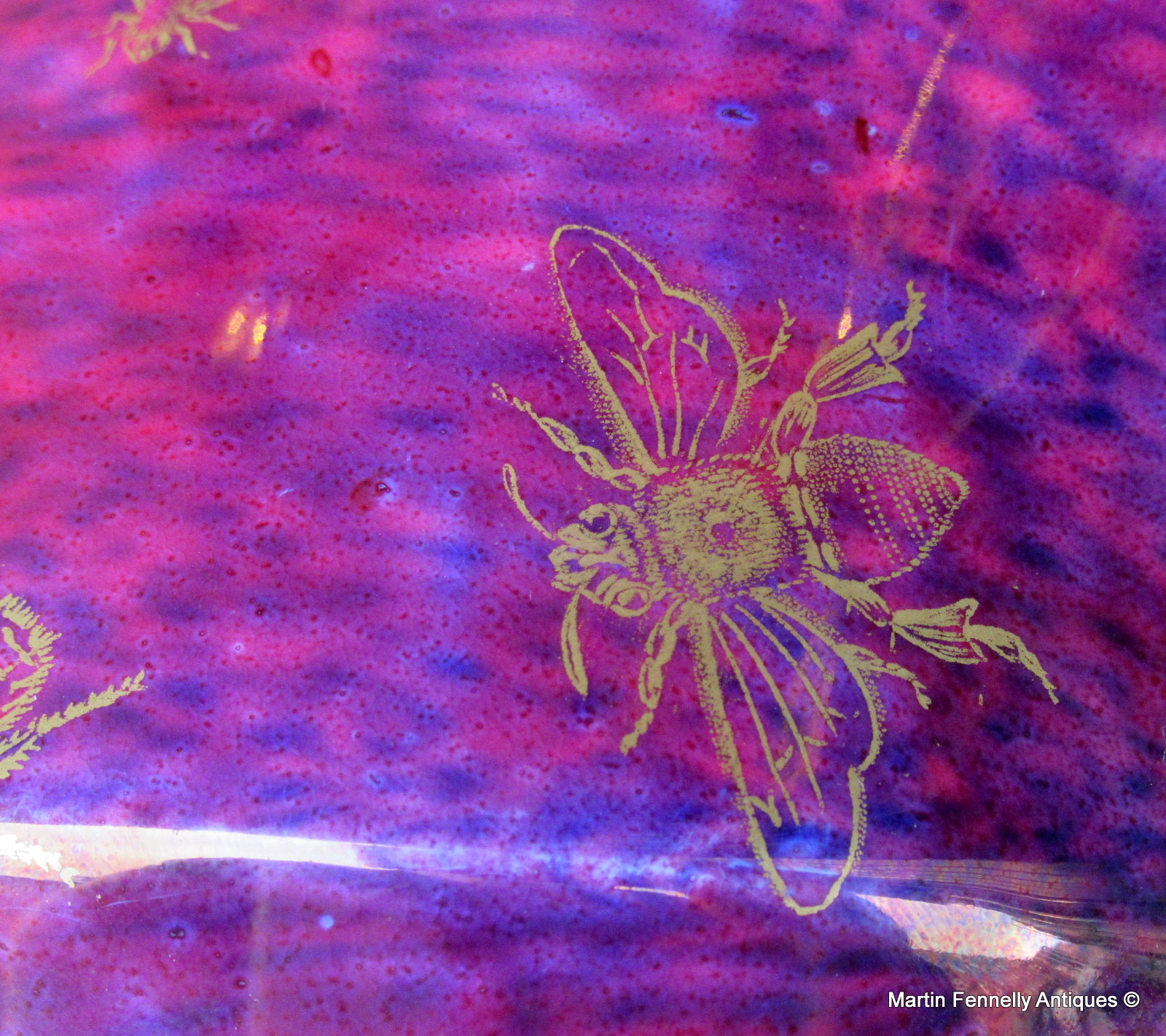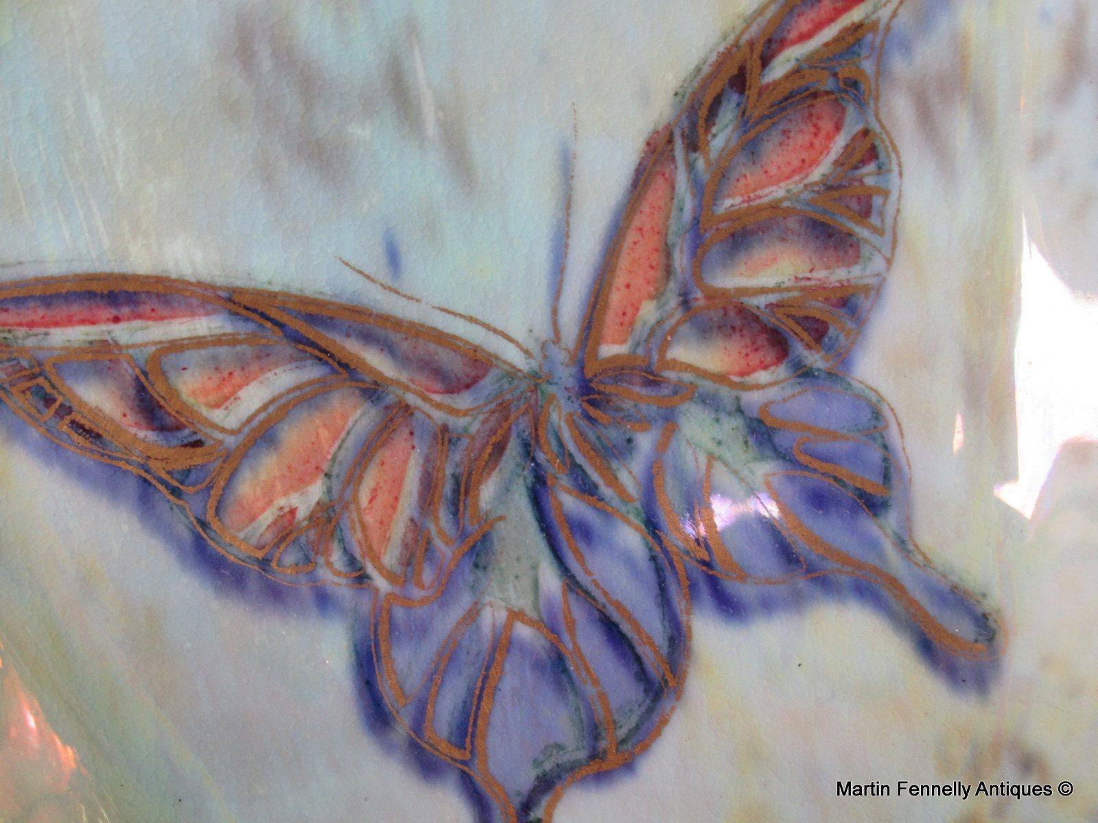Superb Wedgwood ‘Butterfly’ lustre bowl, Circa 1920-30 by Daisy Makeig Jones , of octagonal form the exterior decorated with gilt illustrations portraying butterflies and further insect reserved against a rich magenta and purple ground, the interior adorned with central rosette roundel, surrounded by butterflies, below a stiff leaf rim border, all reserved against a green to blue lustre ground. The printed gilt mark and pattern number Z4827 to base.