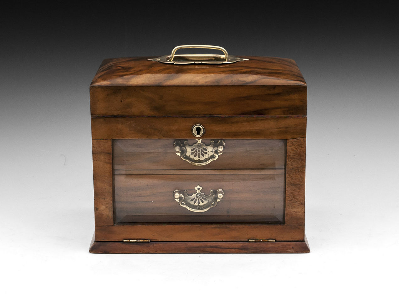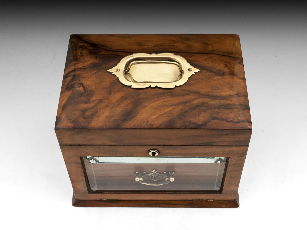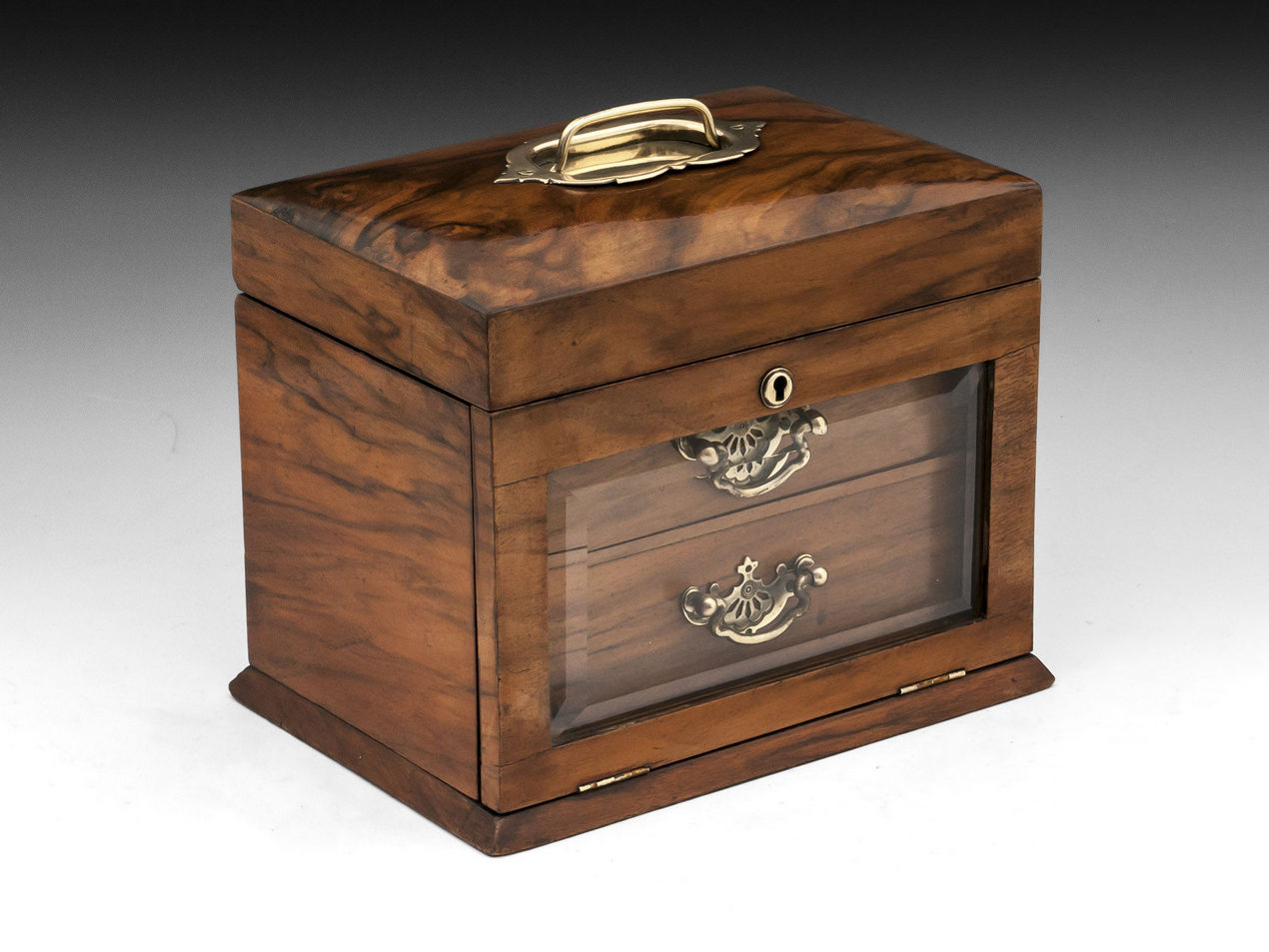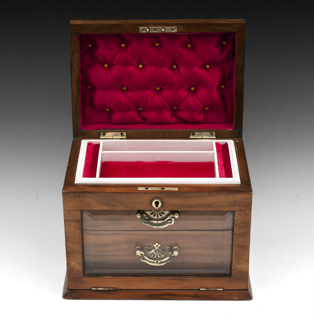 Lifting the lid of the Jewellery box using the carry handle reveals a white silk and red velvet lined jewellery compartments including two specifically for securing rings, earrings and cufflinks. The glazed door of the antique jewellery box folds down to allow access to the two brass handled drawers, each one is lined in the same manner as the rest of the box. This fabulous walnut jewellery box comes with a fully working lock and tasselled key and once locked this jewellery box can be carried from room to room with ease using the ornate shaped carry handle.