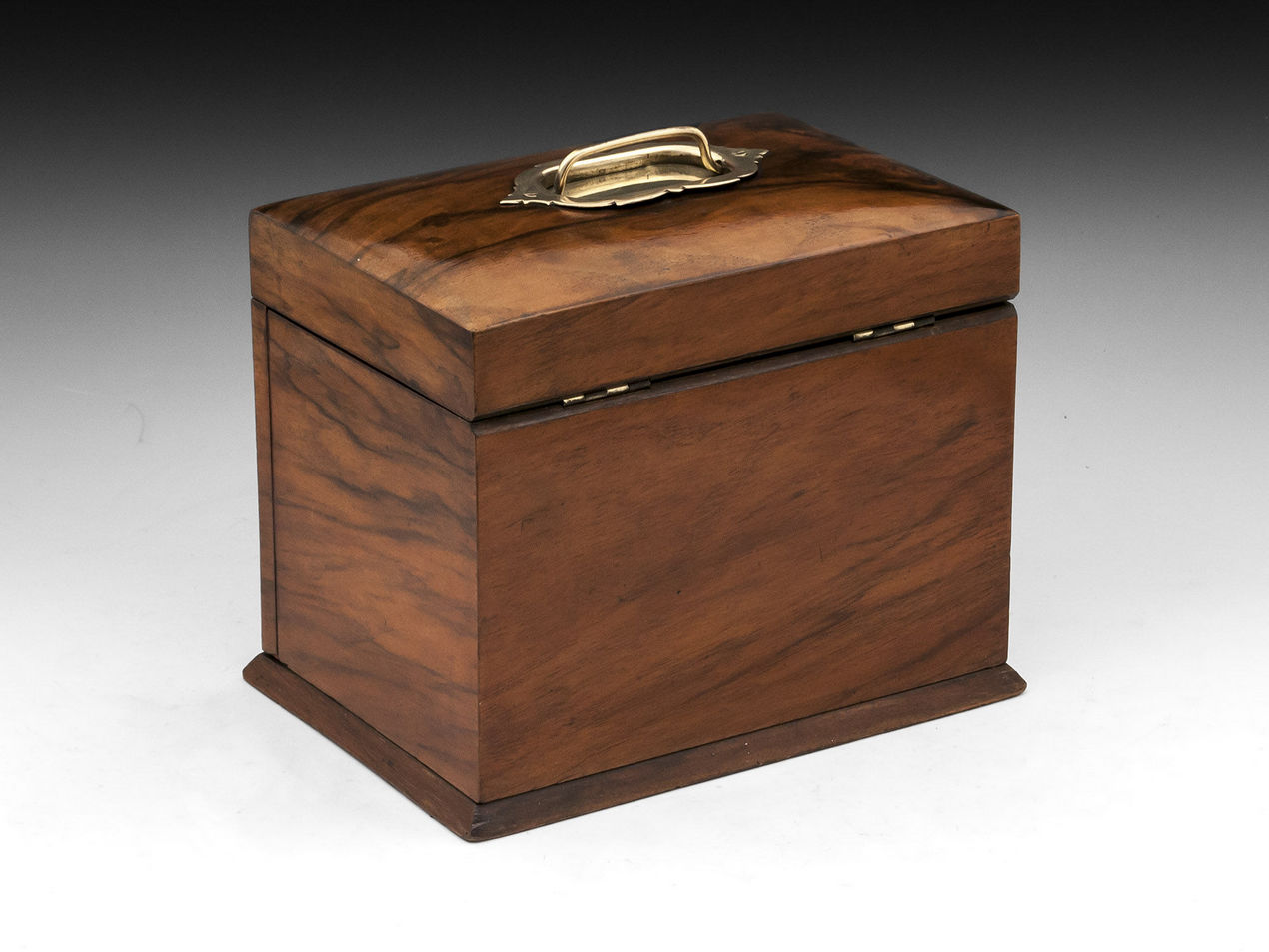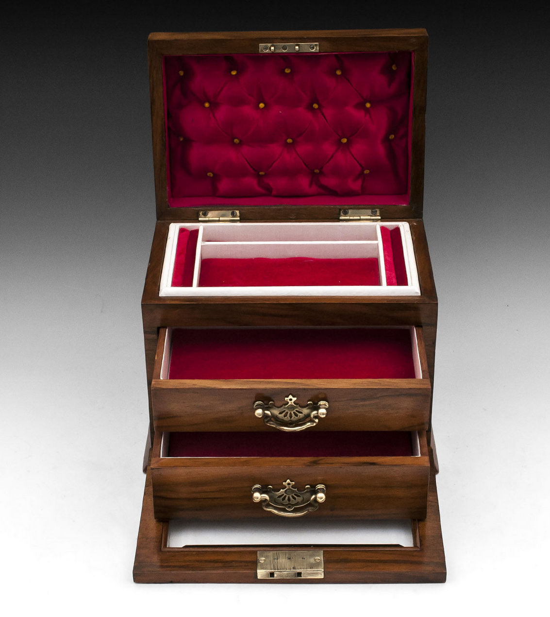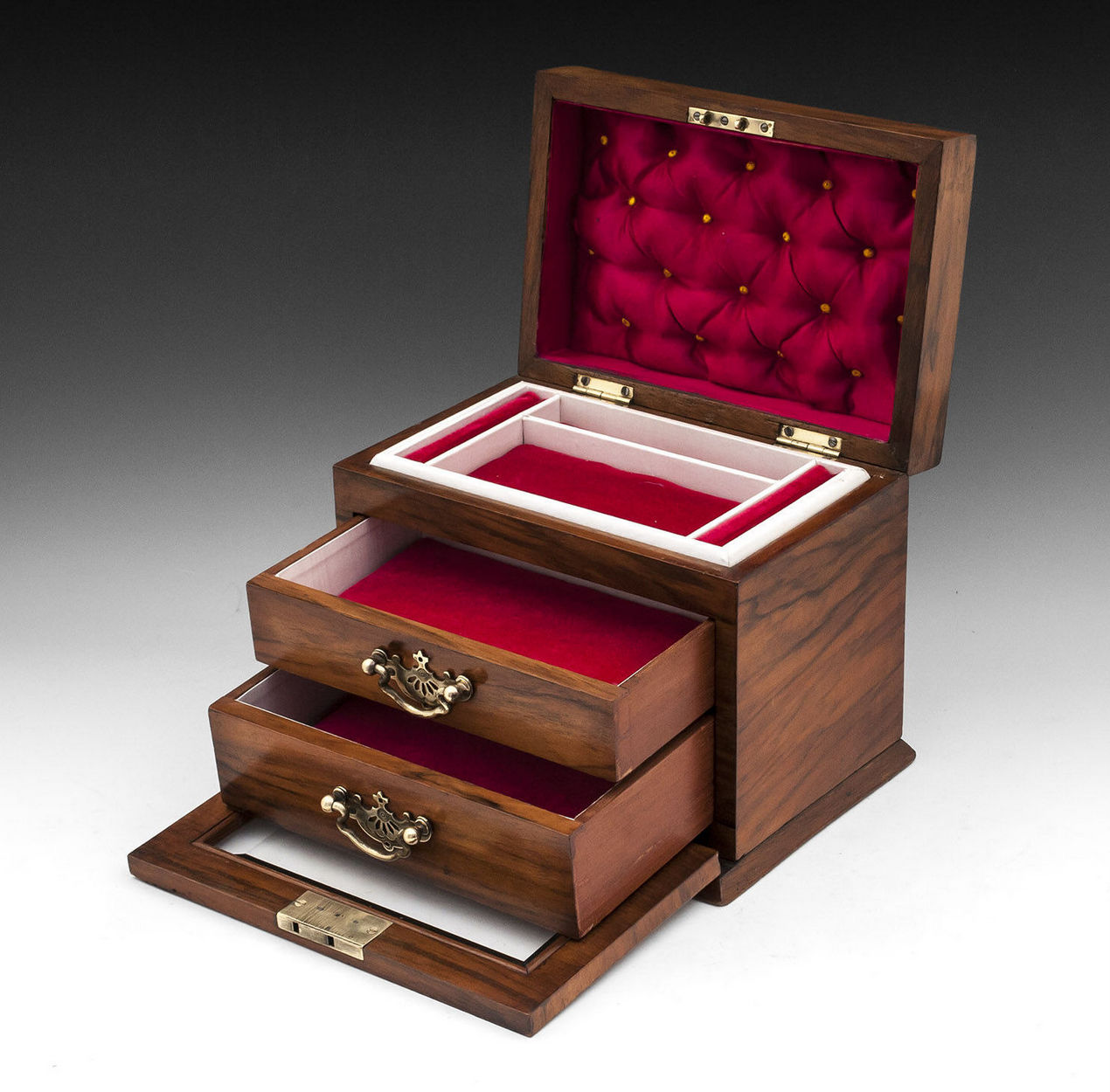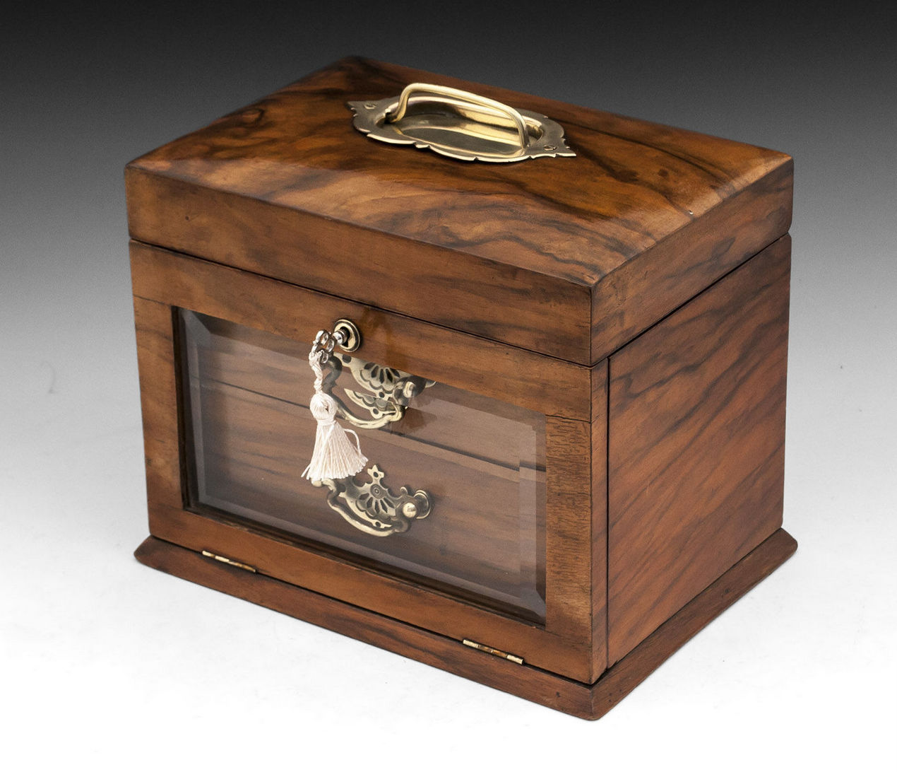 Lifting the lid of the Jewellery box using the carry handle reveals a white silk and red velvet lined jewellery compartments including two specifically for securing rings, earrings and cufflinks. The glazed door of the antique jewellery box folds down to allow access to the two brass handled drawers, each one is lined in the same manner as the rest of the box. This fabulous walnut jewellery box comes with a fully working lock and tasselled key and once locked this jewellery box can be carried from room to room with ease using the ornate shaped carry handle.