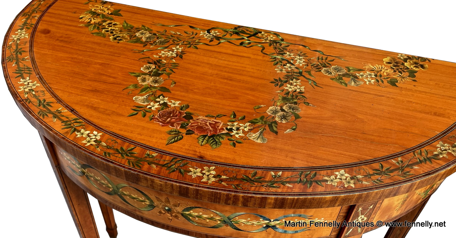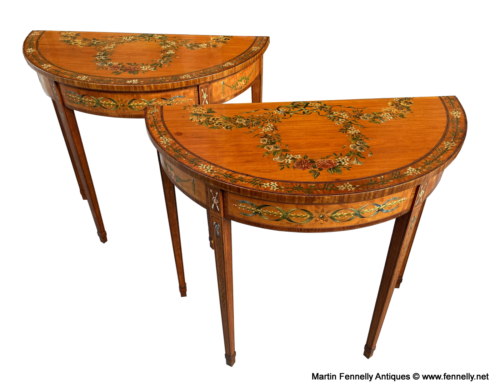 These are a wonderful Pair of Hand Painted Satinwood inlaid Tables dating to Circa 1880. This pair are delicately and expertly hand painted with floral, garland and classical detail. The tops of the Tables are crossbanded in Satinwood which are also hand painted with inlaid borders in Rosewood, Boxwood and Ebony stringing. The Frieze of the tables is similarly decorated and the table is raised on tapering legs with spade feet. The overall condition is very good. These tables date to Circa 1880 but are very much in the late 18th Century Adams design.