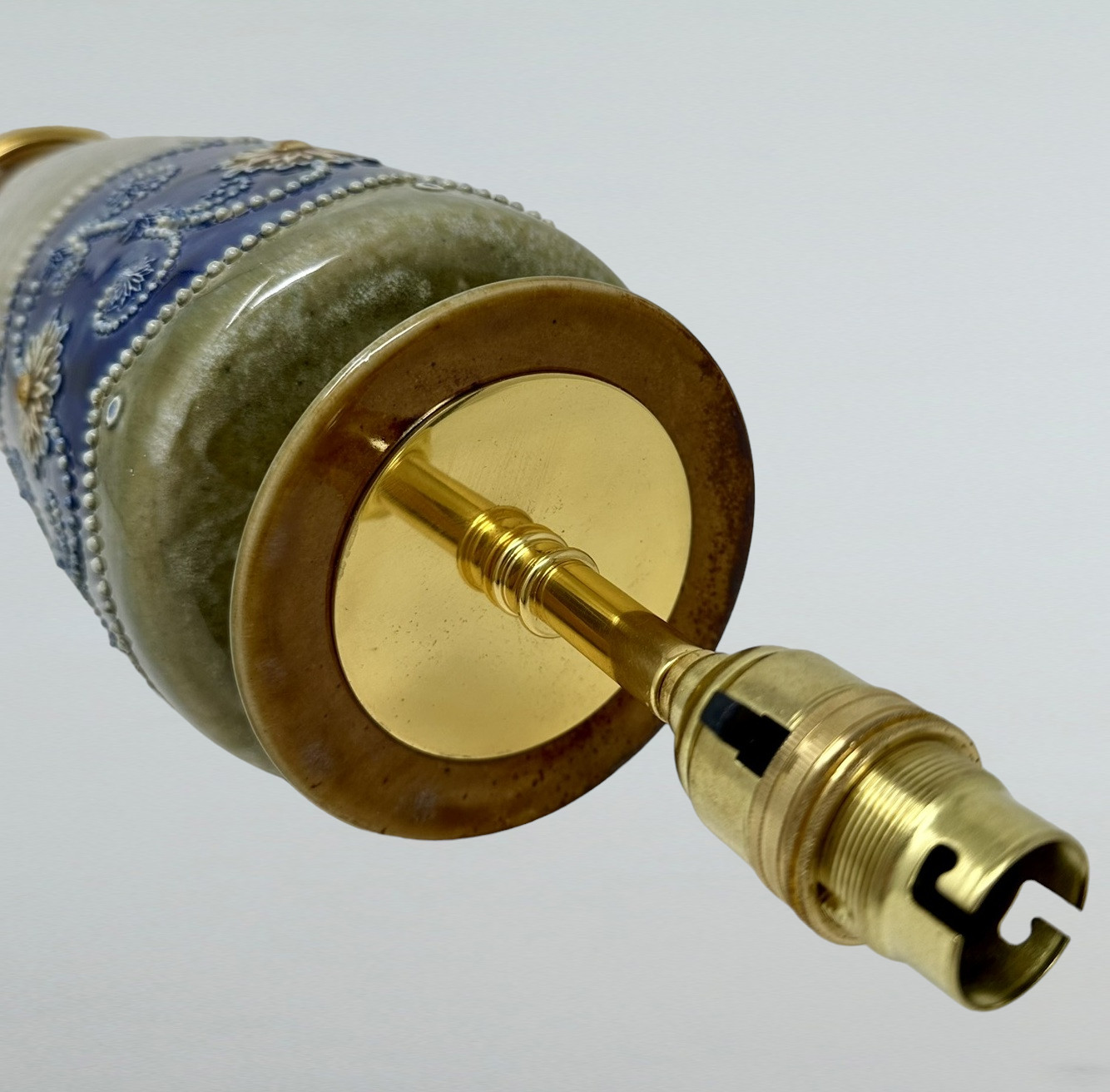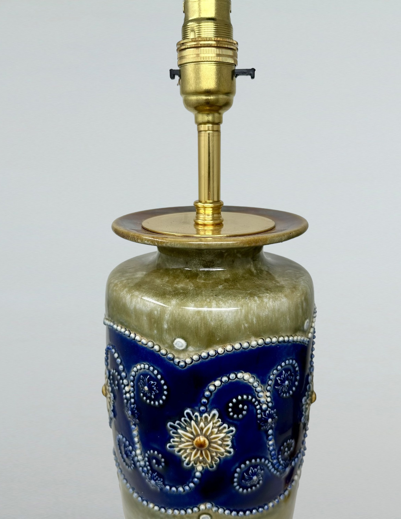 Very nice identical Pair of English Ormolu Mounted Royal Doulton Lambeth Moulded Salt-Glaze Stoneware Pottery tall slender mantle Vases by Ceramic Artist Minnie Webb, now converted to a pair of electric Table Lamps. Circa 1920s.