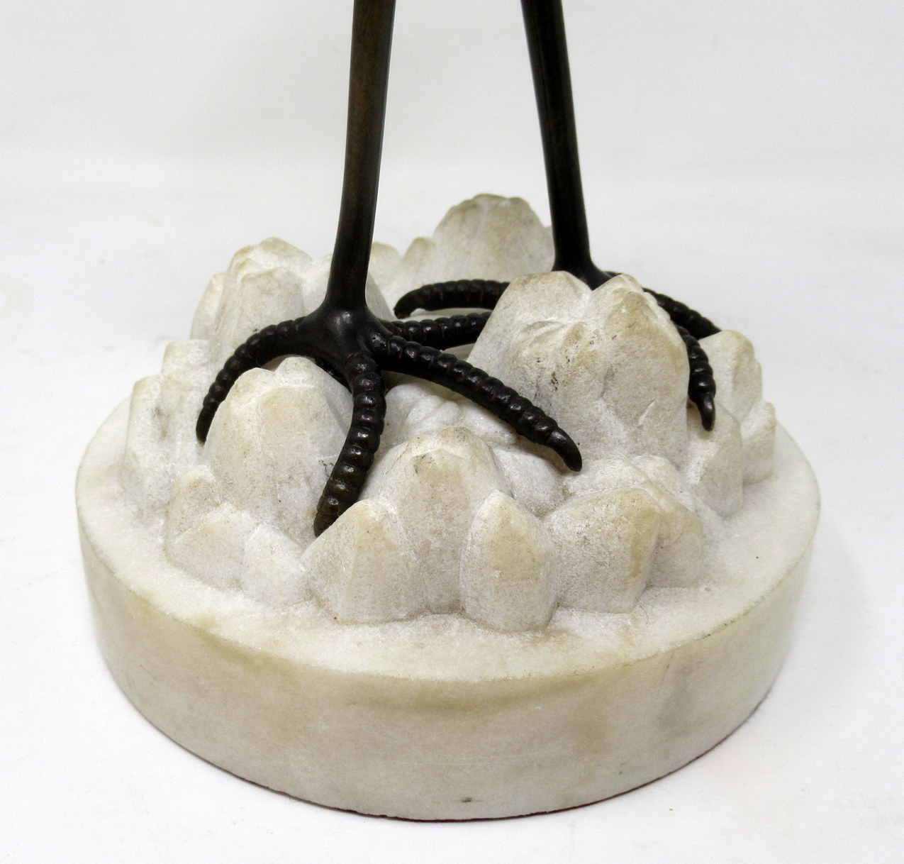Each exquisitely modelled as standing Storks or Cranes perched on a naturalistic rocky outcrop statutory creamy coloured marble circular base. The naturalistically cast circular form ormolu nozzles and drip pans above fret cut Acanthus leaf canopies held aloft by each bird’s head.