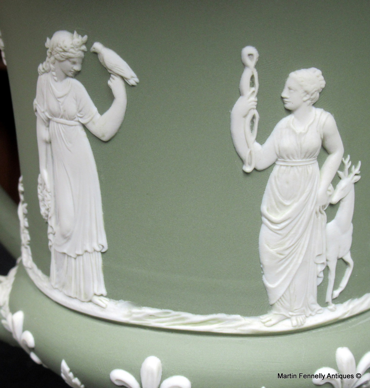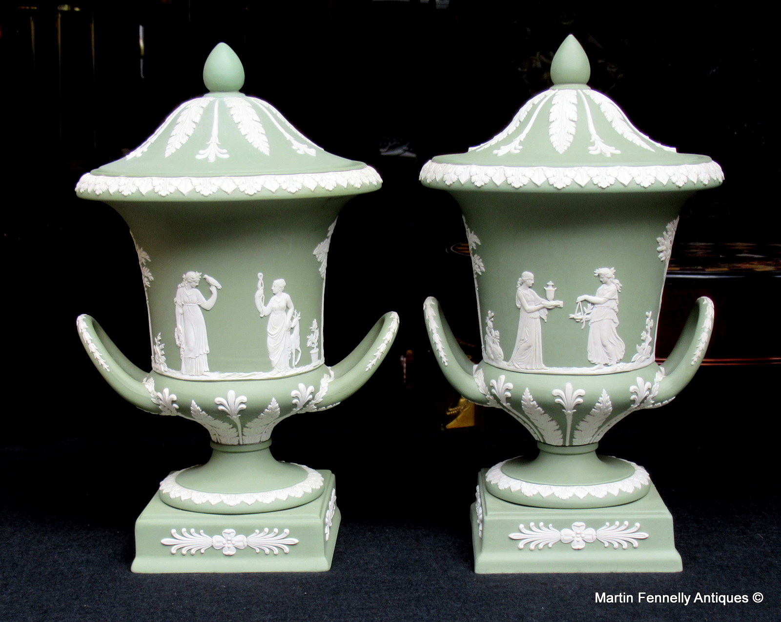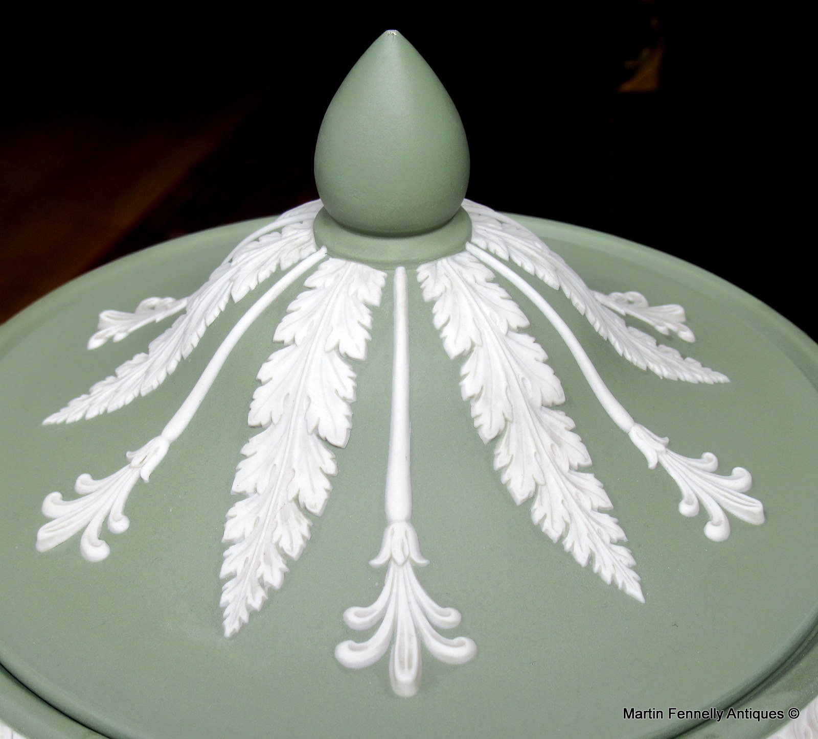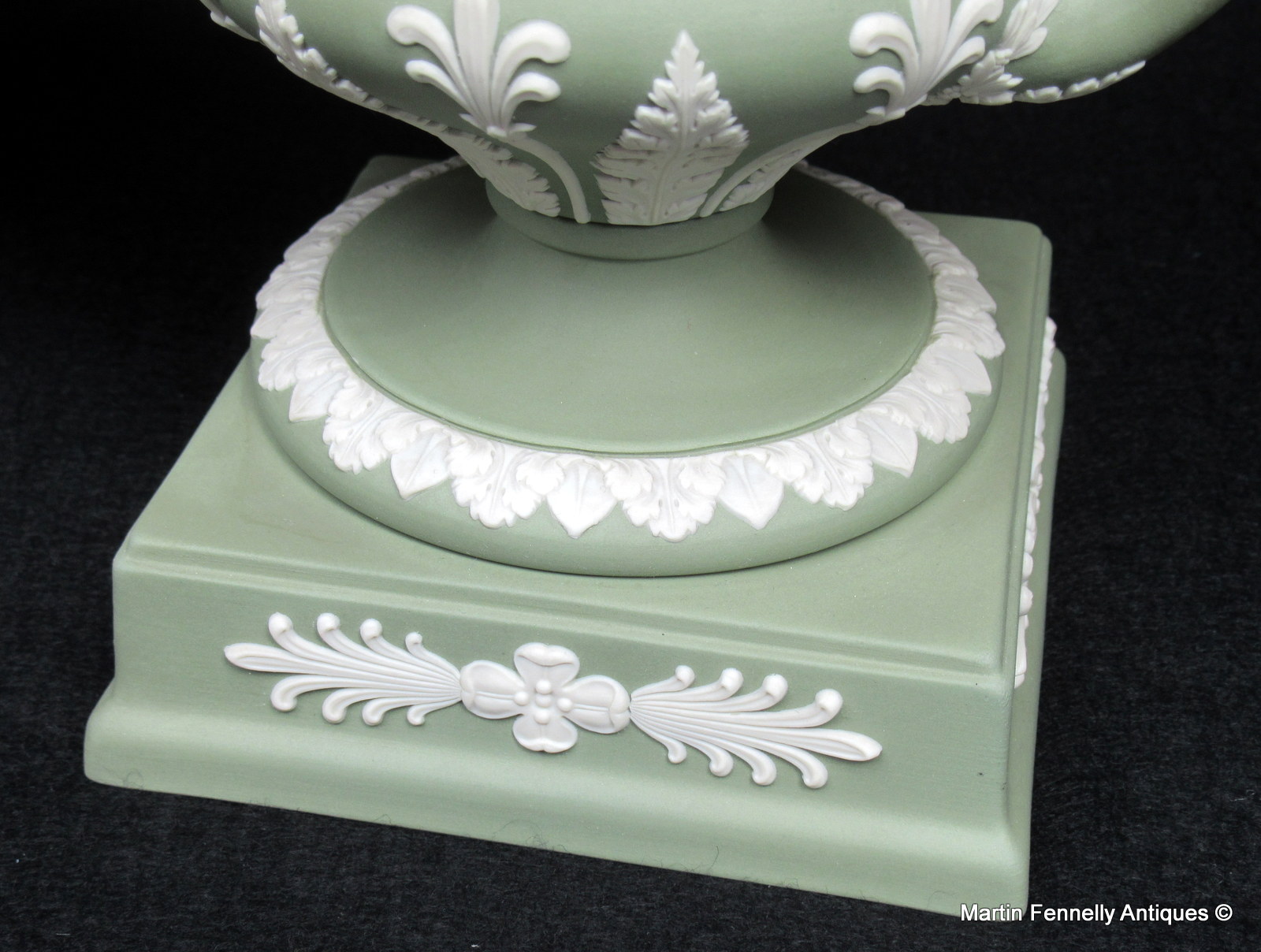 These are a Beautiful Mint Condition Pair of Wedgwood Green Jasperware Handled and lidded Campana Urns. They are in superb condition and date to Circa 1960. The ‘Muses’ and ‘Offering of Peace’ are raised on square pedestal vases. The Classical decoration is crisp and highly detailed.