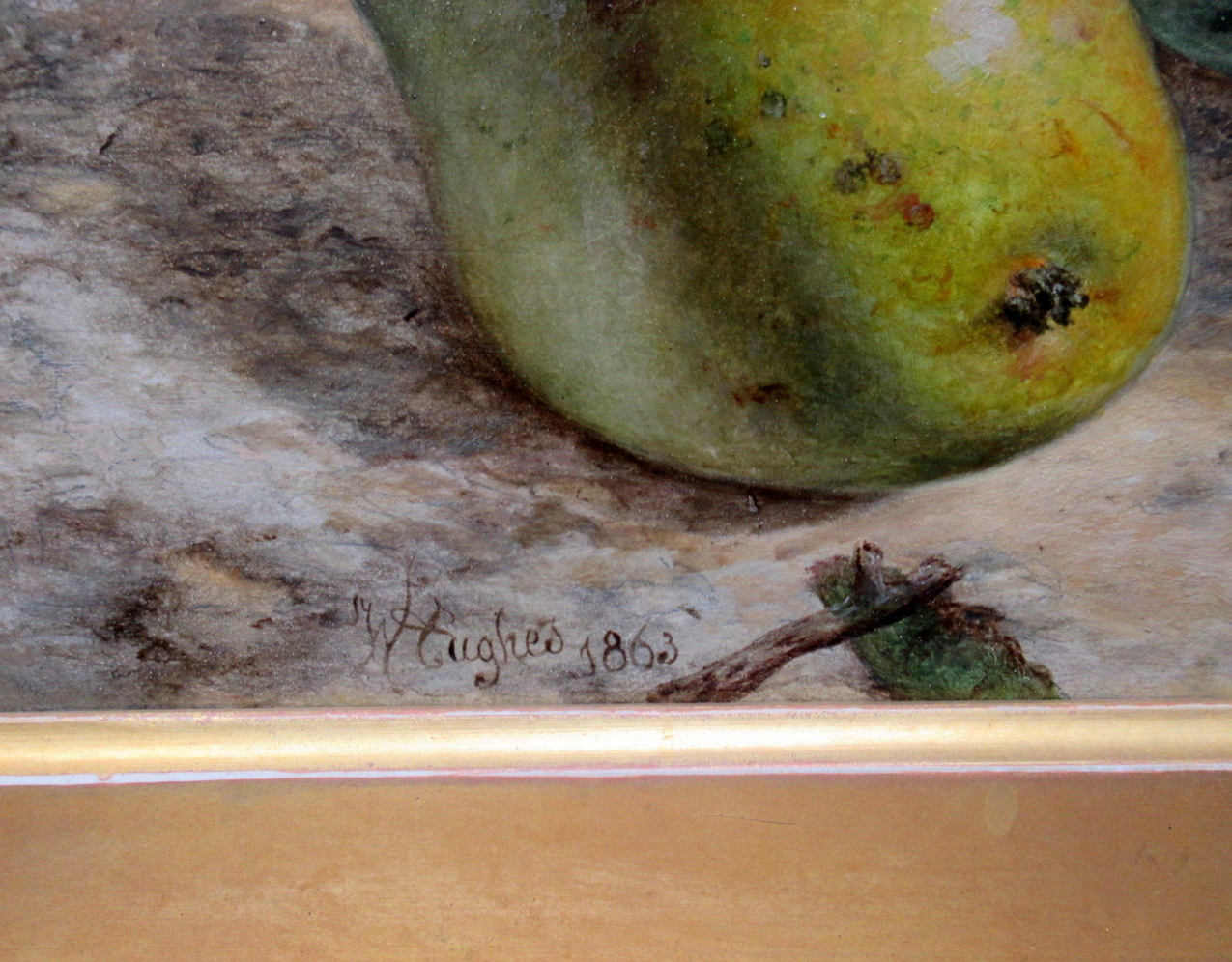 Fine quality example of a pair of framed Still Life of fruits Oil Paintings on Artists board by well documented English Artist William Hughes, third quarter of the Nineteenth Century. Complete with good giltwood frames, one is signed lower left W. Hughes and dated 1863