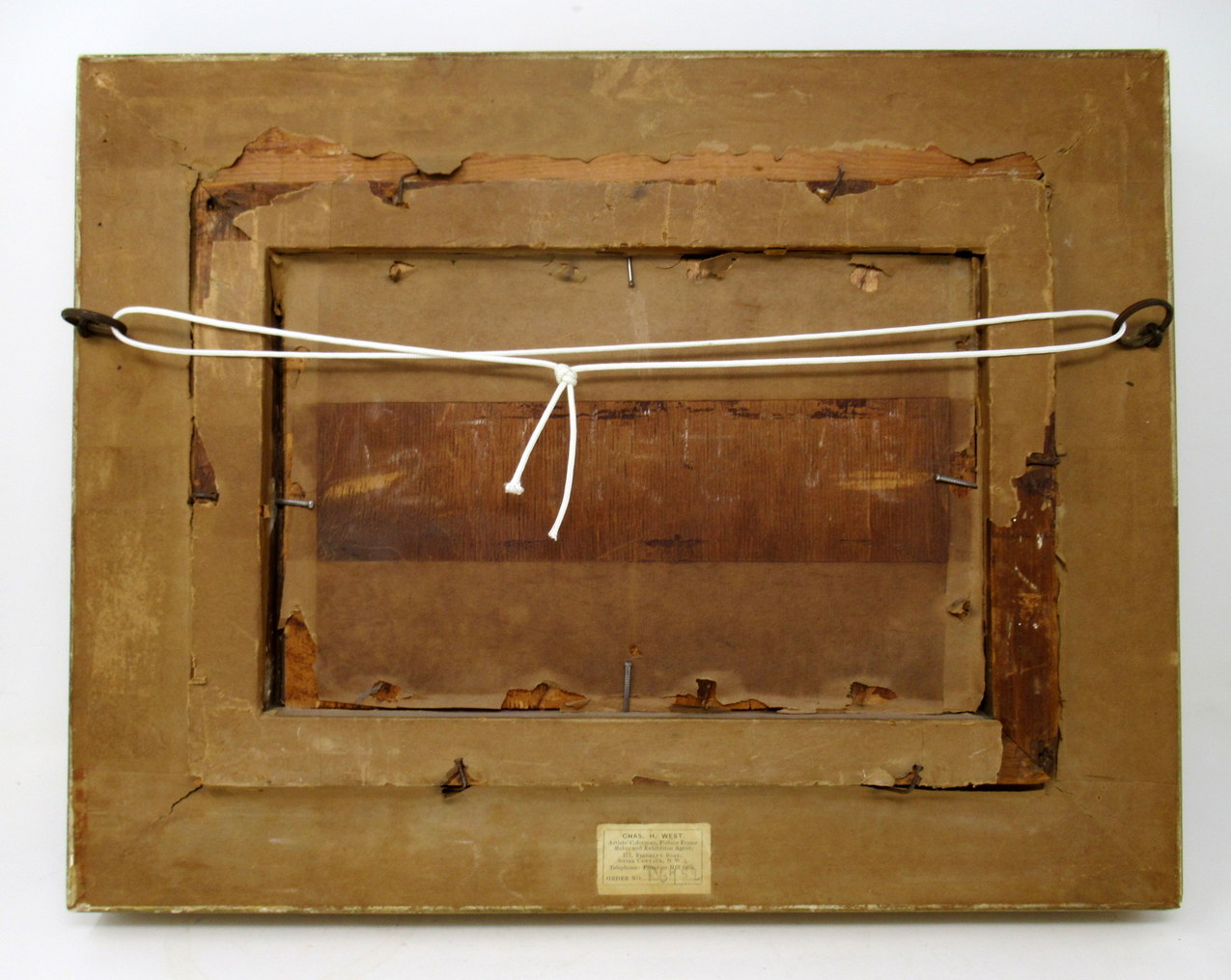Condition: Good condition recently professionally cleaned and ready to hang. Old trade label CHAS H WEST Framemakers in Primrose Hill, London.