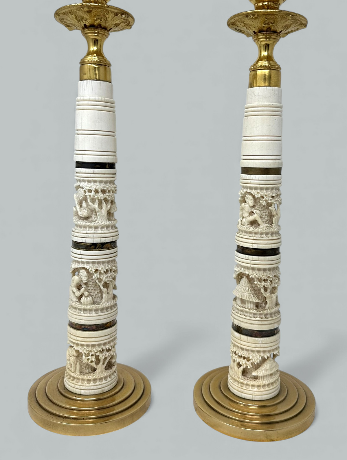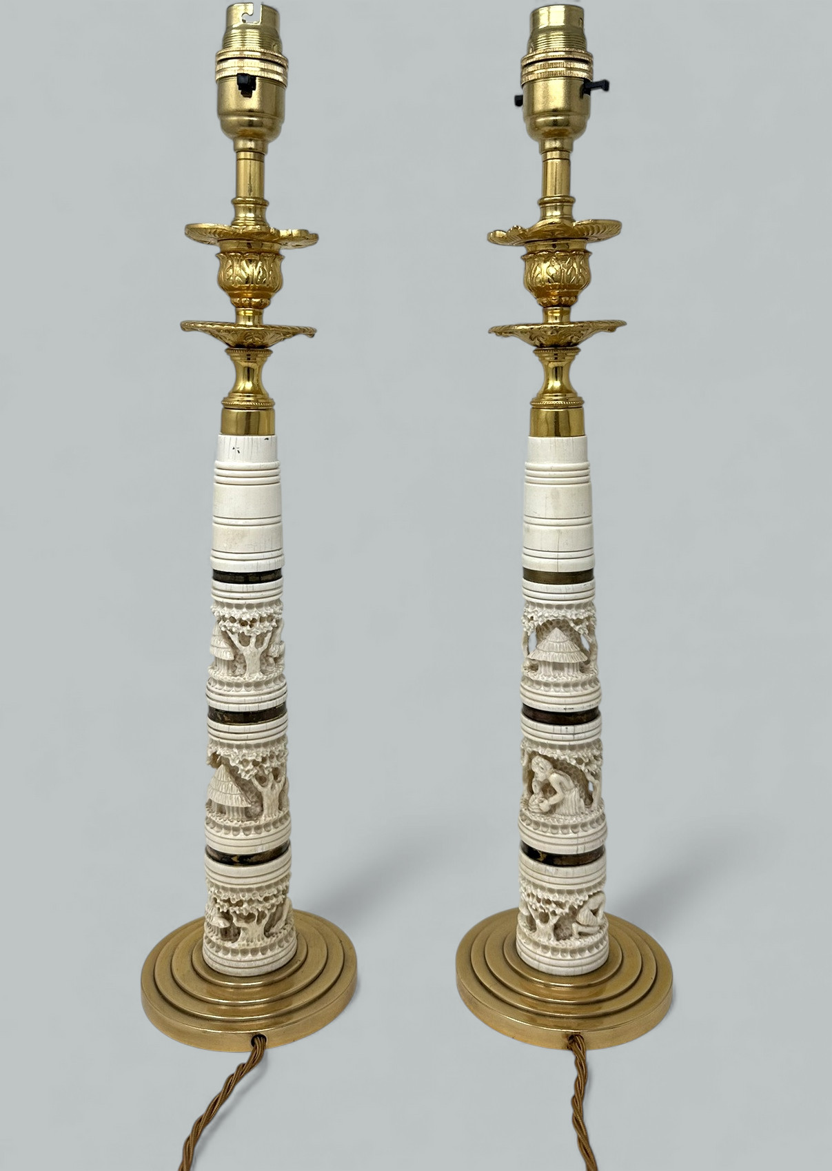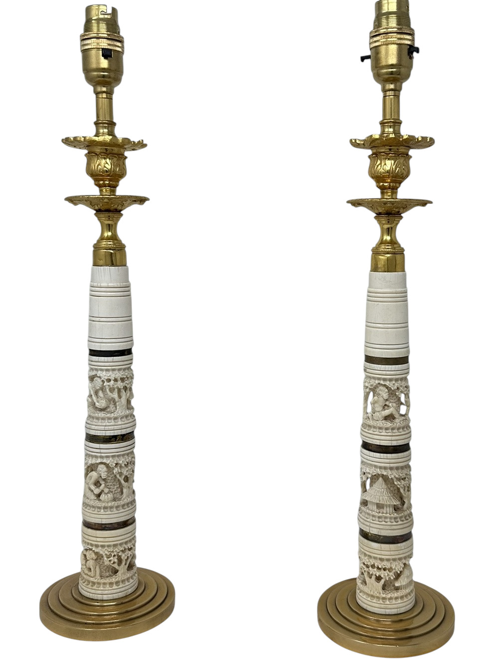 Fine and quite rare Pair of Asian Hand Carved Bovine Bone and ormolu early Victorian Single Light Candlesticks of tall slender form and fairly large proportions, now converted to a stunning Pair of Electric Table Lamps, offered in exceptional condition, each with unusual exquisite hand carving detailing depicting Oriental Carvings of adult figures and children in landscape, ending on heavy gauge stepped ormolu circular bases. Third quarter of the Nineteenth Century. Condition: Superb condition, these Lamps have been professionally re-gold plated, original firm fitting drip pans, professionally re-wired for electricity.