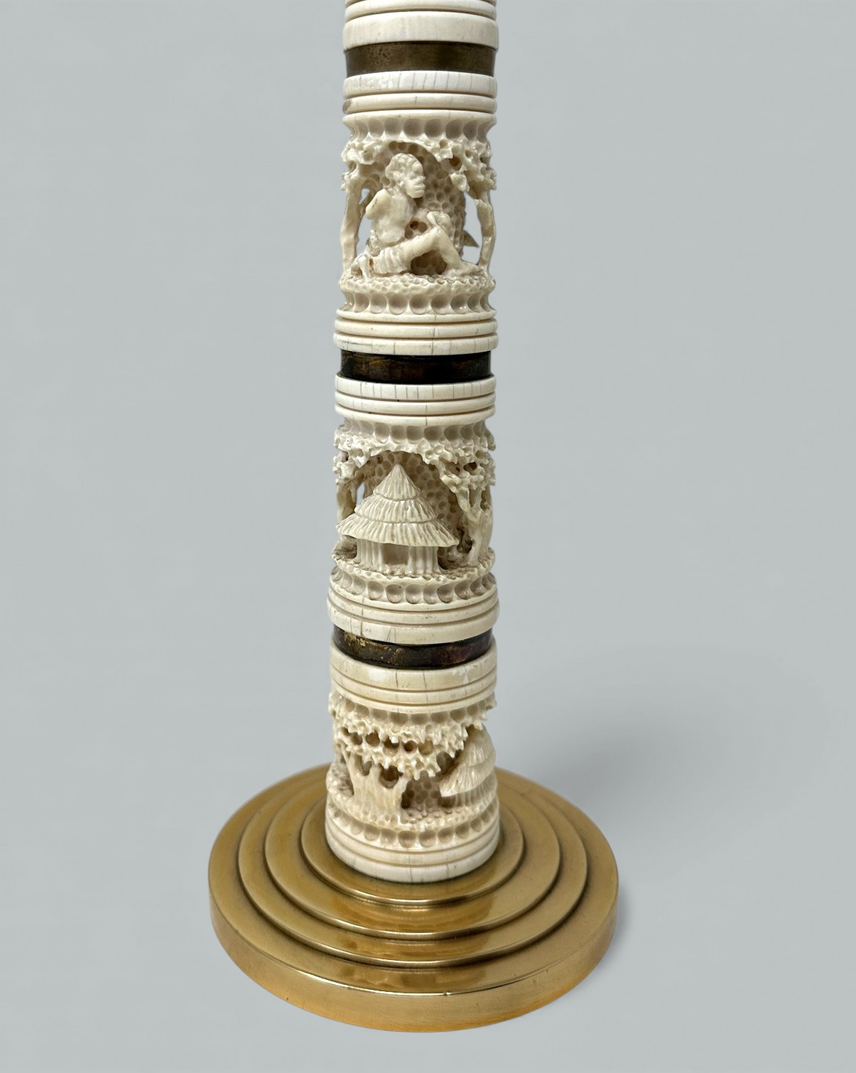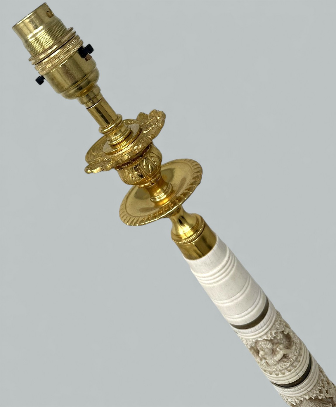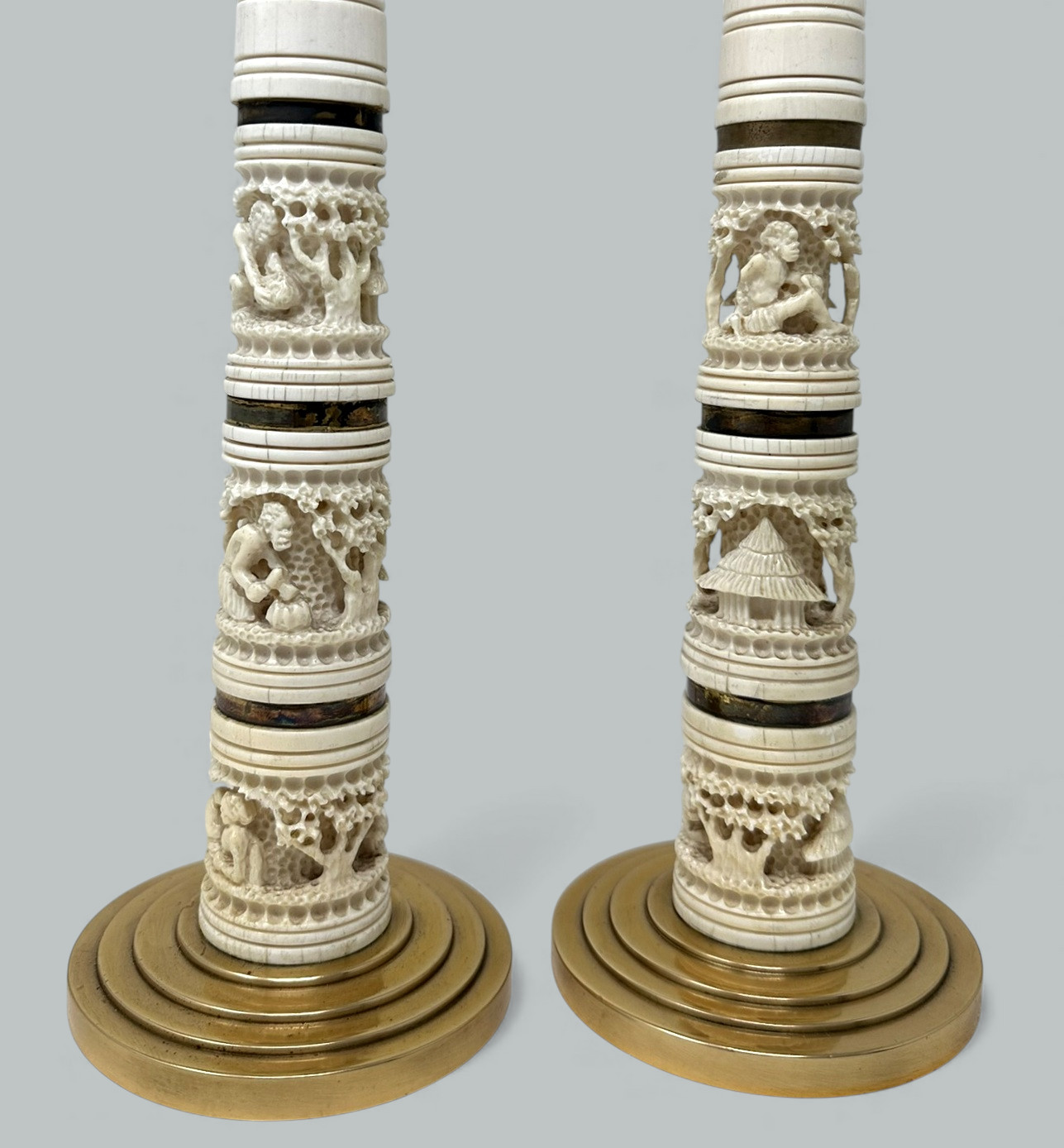 Fine and quite rare Pair of Asian Hand Carved Bovine Bone and ormolu early Victorian Single Light Candlesticks of tall slender form and fairly large proportions, now converted to a stunning Pair of Electric Table Lamps, offered in exceptional condition, each with unusual exquisite hand carving detailing depicting Oriental Carvings of adult figures and children in landscape, ending on heavy gauge stepped ormolu circular bases. Third quarter of the Nineteenth Century. Condition: Superb condition, these Lamps have been professionally re-gold plated, original firm fitting drip pans, professionally re-wired for electricity.