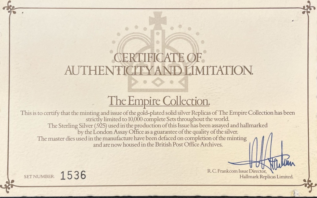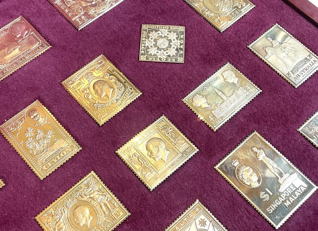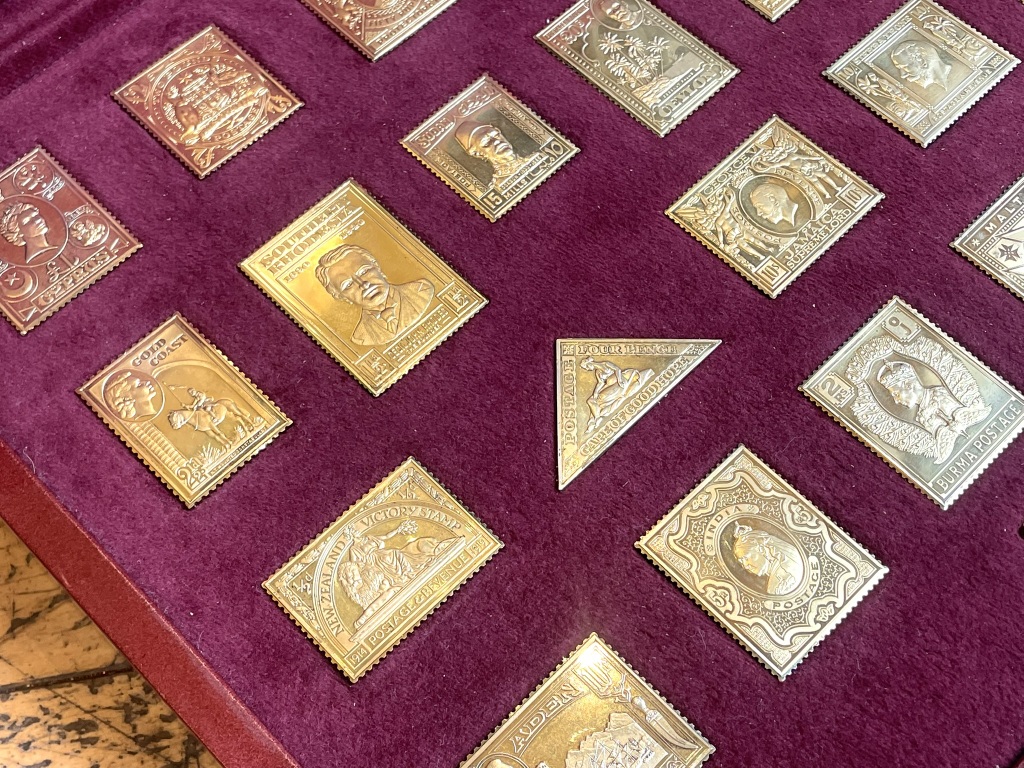 Produced in 1982 Royal Stamps of the Empire Collection in Original Box. Set of gold plated silver replicas of stamps issued throughout the British Empire from the Reign of Queen Victoria to our present Queen Elizabeth II. The obverse of each piece displays a replica image of a stamp, whilst the Reverse features the name of the Monarch, the country and year the stamp was first issued, in addition to a hallmark. Comes complete with wooden presentation box. Each ingot is assay marked for London.