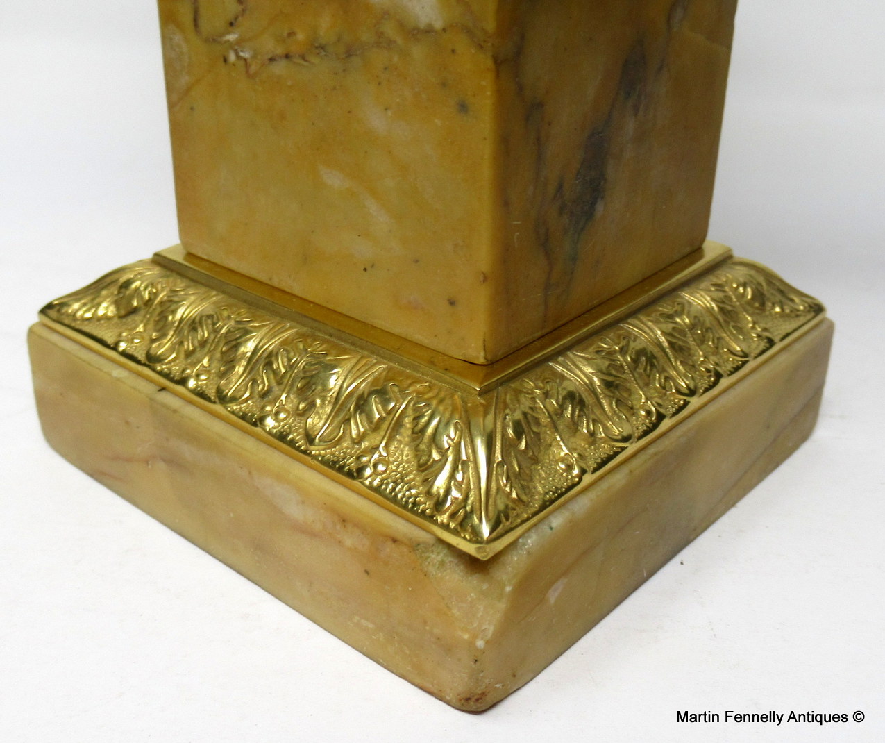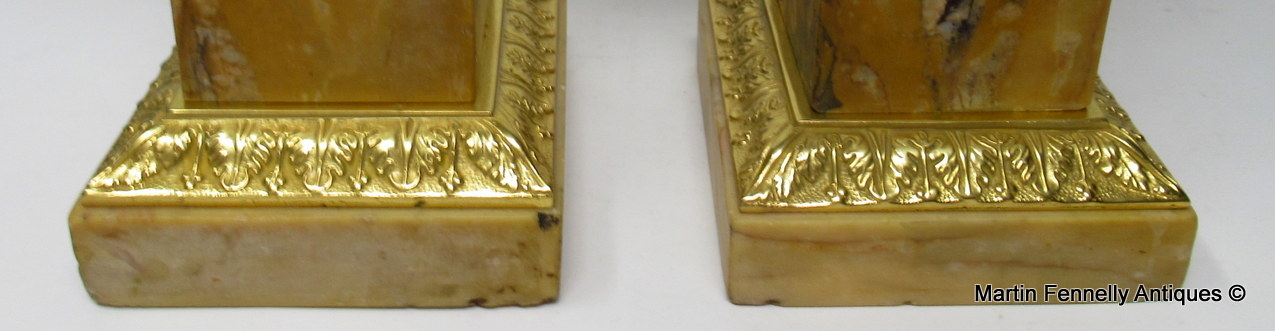 Condition: These pieces have been professionally cleaned, original patinated bronze with no wear at high points, ormolu has been professionally re-gold plated. Small loss to marble at one base corner, see image.