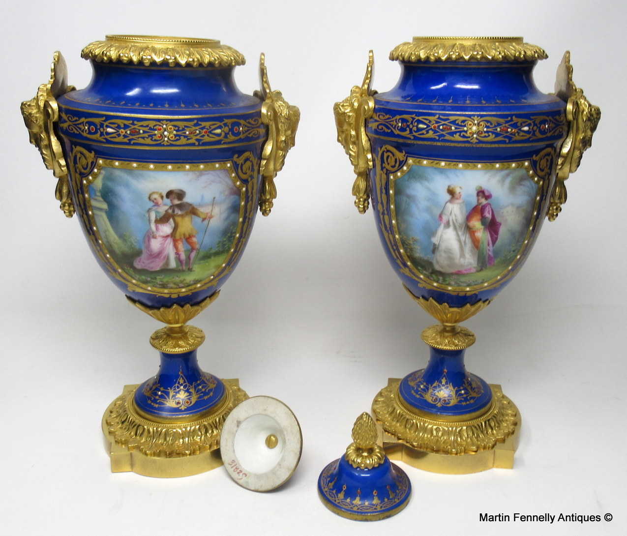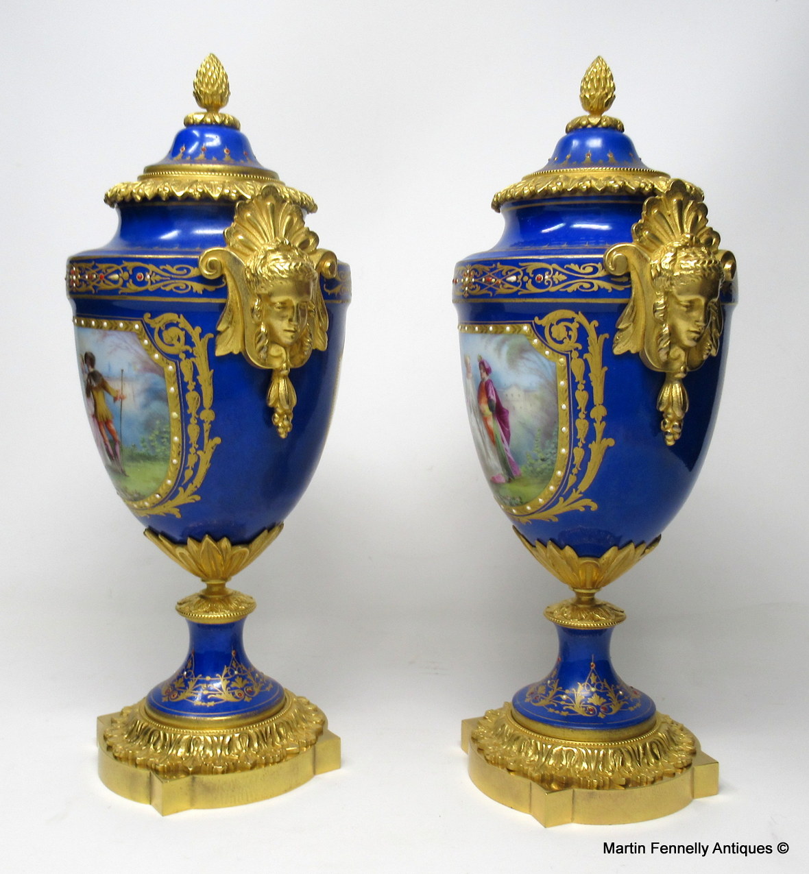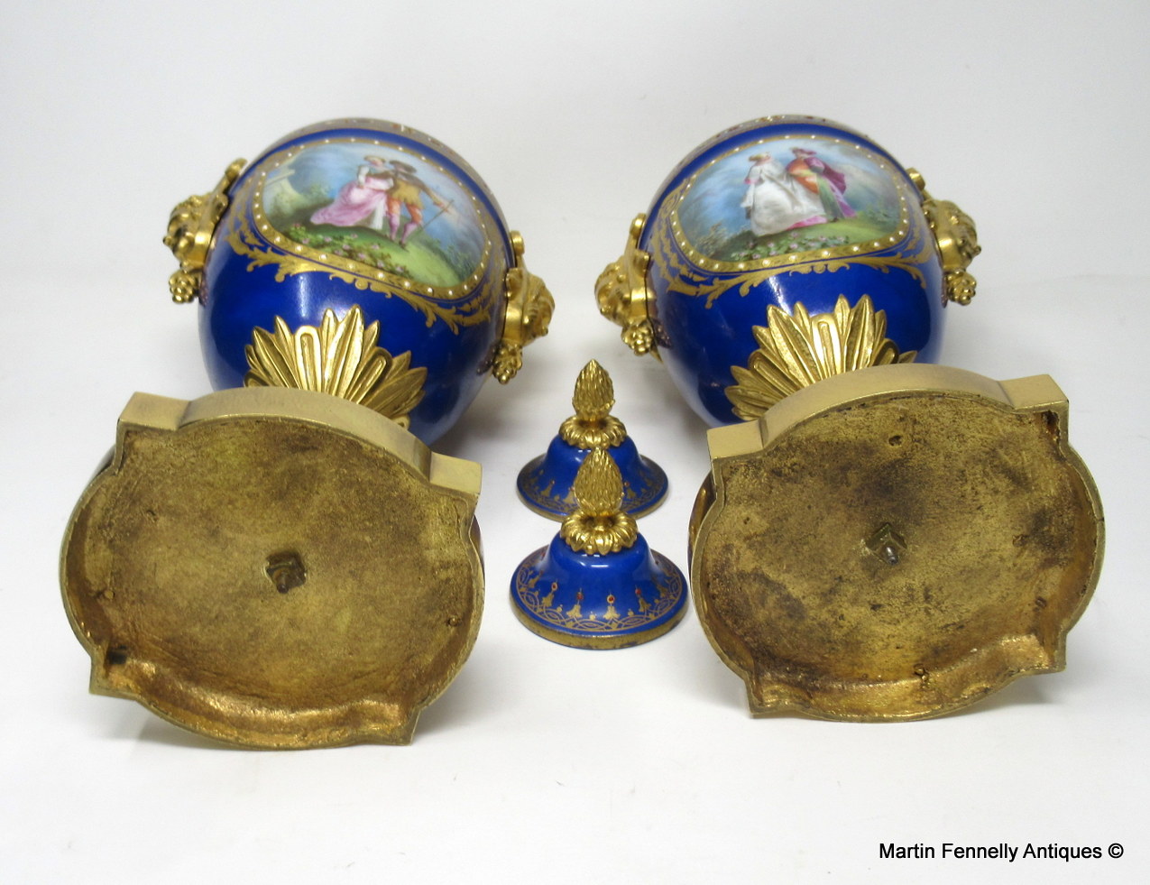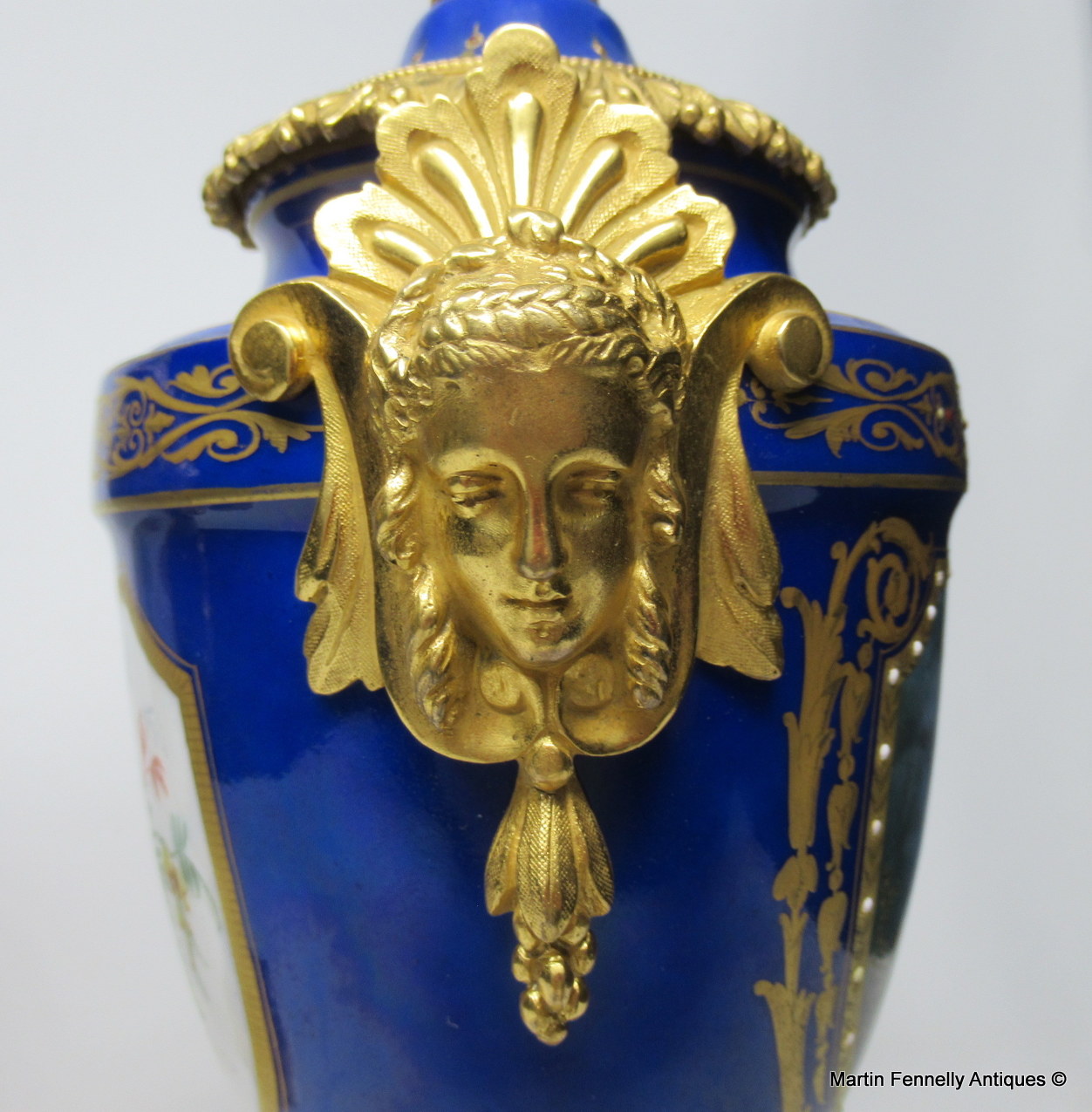 Stunning Pair French Sevres Soft Paste Porcelain and Ormolu Twin Handle Table or Mantle Urns of traditional form and of outstanding quality, and good size proportions, each raised on a square stepped base with canted corners.