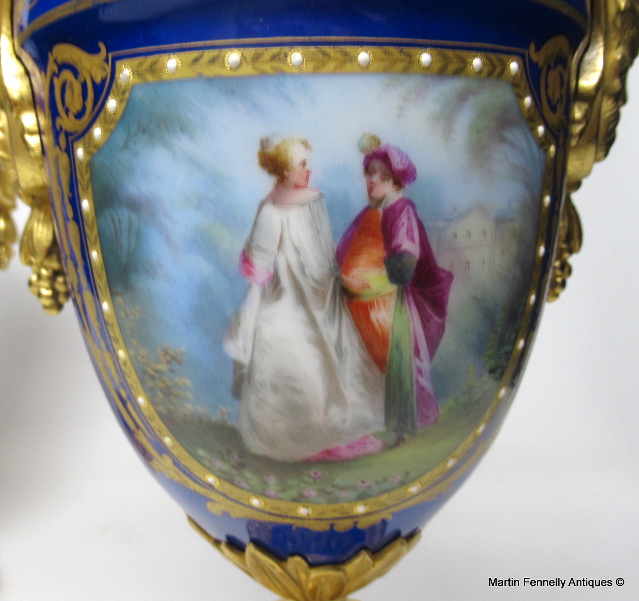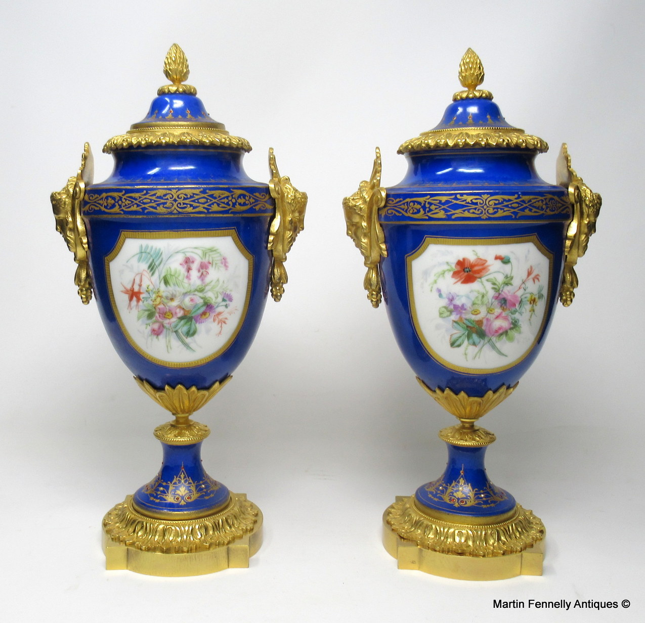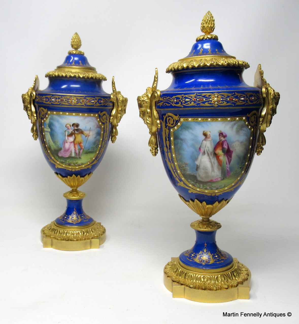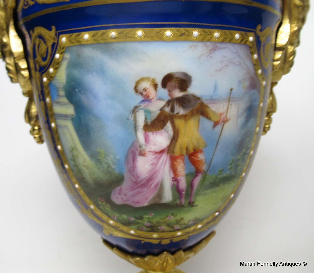 Stunning Pair French Sevres Soft Paste Porcelain and Ormolu Twin Handle Table or Mantle Urns of traditional form and of outstanding quality, and good size proportions, each raised on a square stepped base with canted corners.