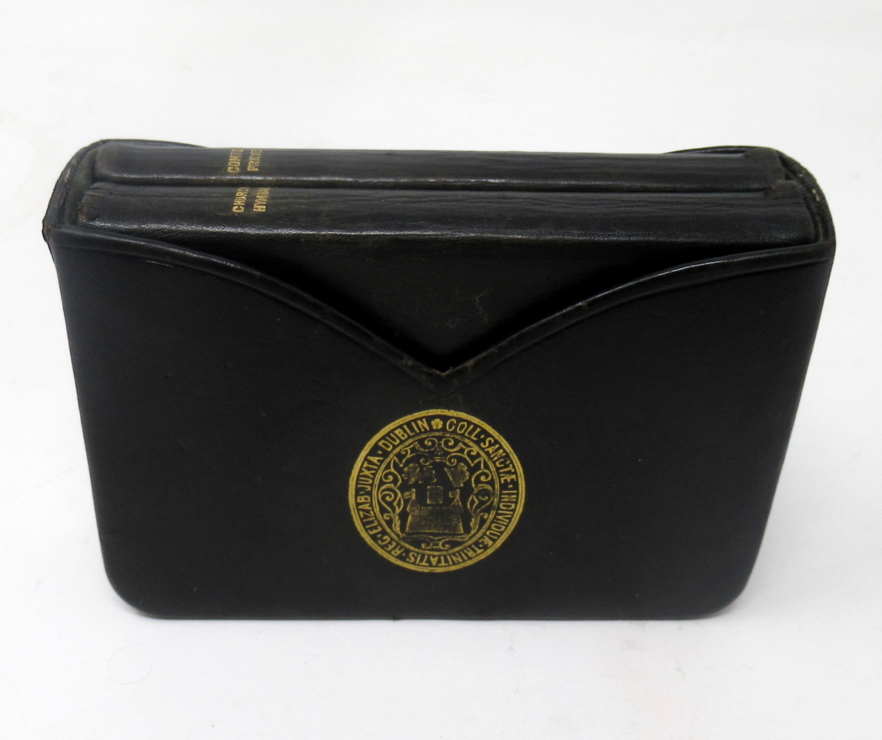 A very rare example of a leather-bound cased set of the book of “Common Prayer” and “Church Hymnal” enclosed within their original leather silk lined case which bears the insignia of Trinity College, Dublin, Ireland, at back and front areas. Translates to “Queen Elizabeth near Dublin College of Holy and Undivided Trinity” Circa 1900