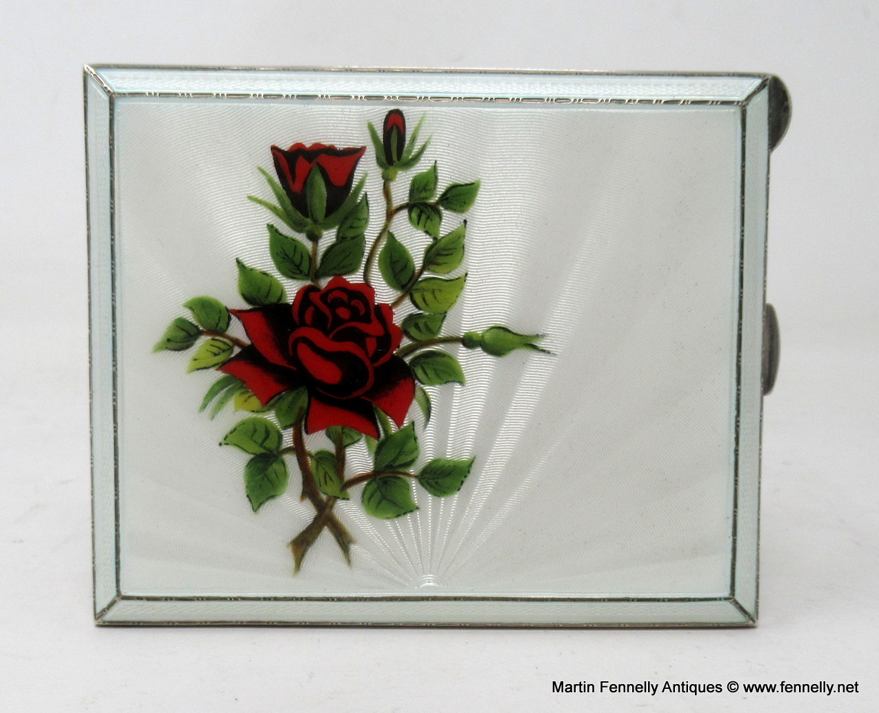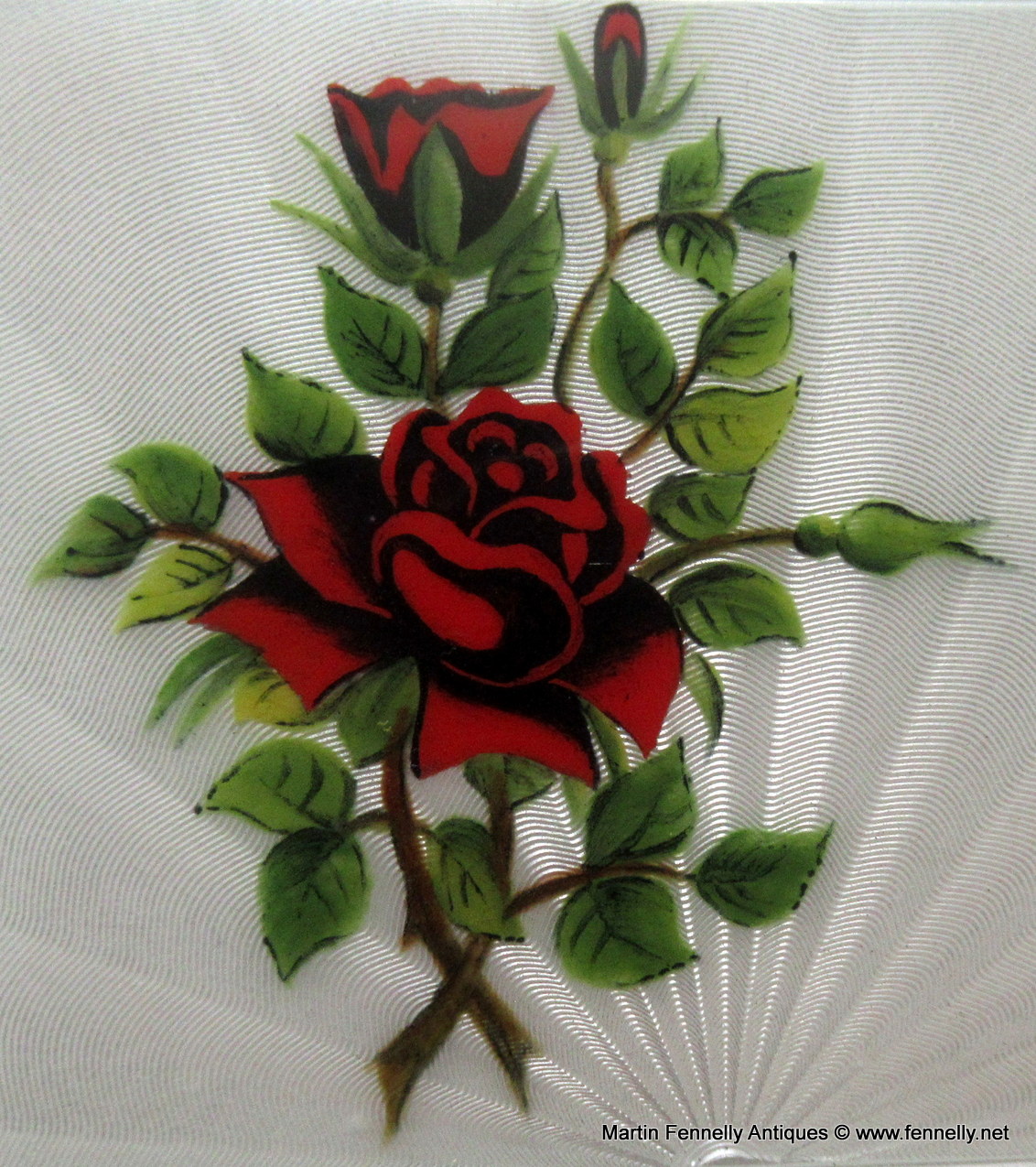 The rectangular cover enameled in colours of red and greens depicting a spary of roses on a sunray design background.