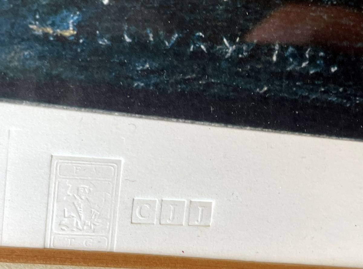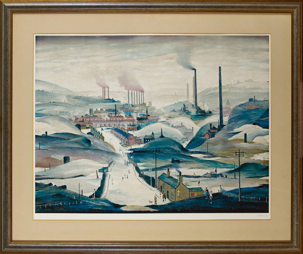 This is a rare Signed Lithograph of a dramatic landscape by LS Lowry (1887-1977), ‘Industrial Panorama’. The scene is a combination of several areas around Lancashire. The original painting is held in the Castle museum, Nottingham. This is number 278 as indicated beside the Guild Stamp (CJJ) from an original set of 300 signed by Lowry in Pencil lower right. This rare edition serves as a window into Lowry’s world where industrial scenes are rendered with unparalleled depth and emotion. It’s an opportunity to own a piece of British art history and is in excellent condition. L.S. Lowry is renowned for his captivating depictions of urban life amidst the industrial revolution, this piece showcases his signature style – a muted yet evocative palette that perfectly captures the essence of an era. Framed and please note the dimensions.