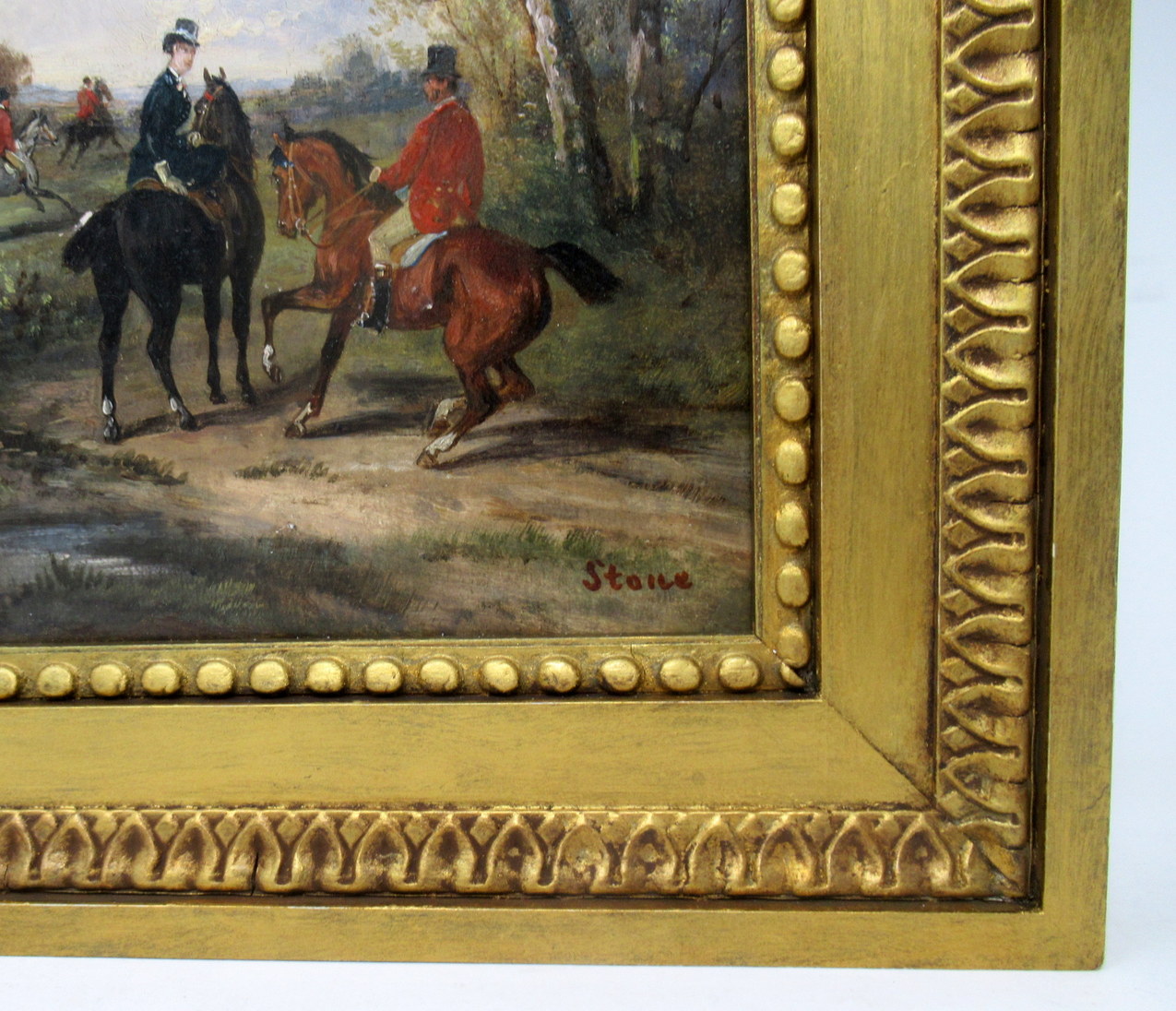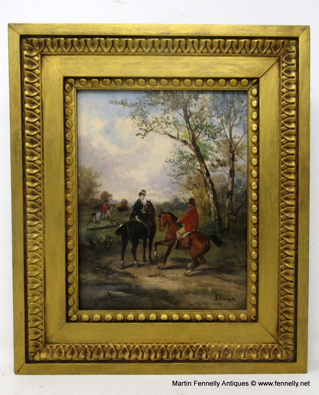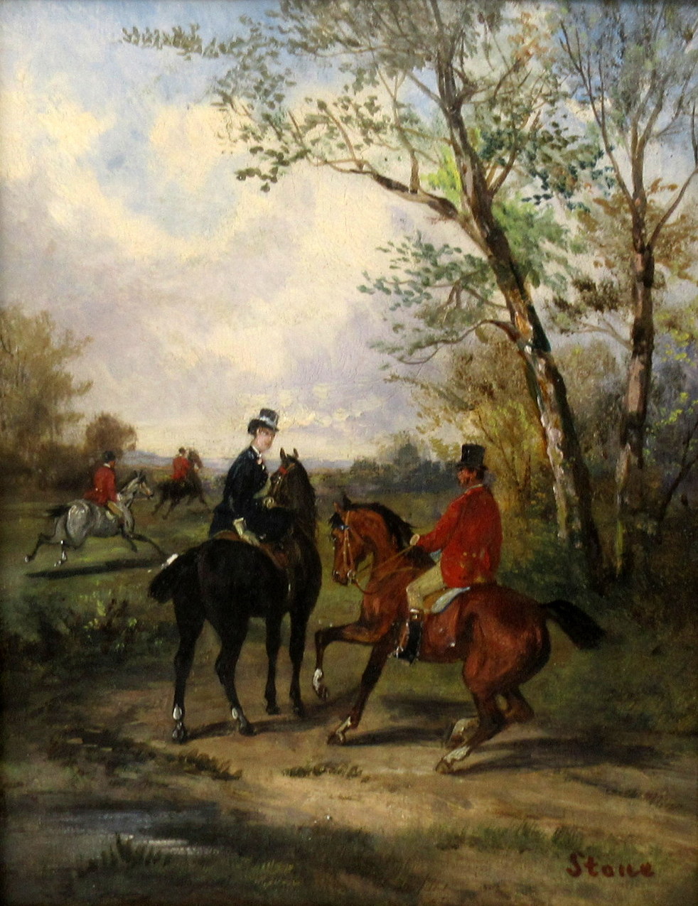 Depicting male and female Riders in traditional costume on horseback. Both signed lower R STONE
