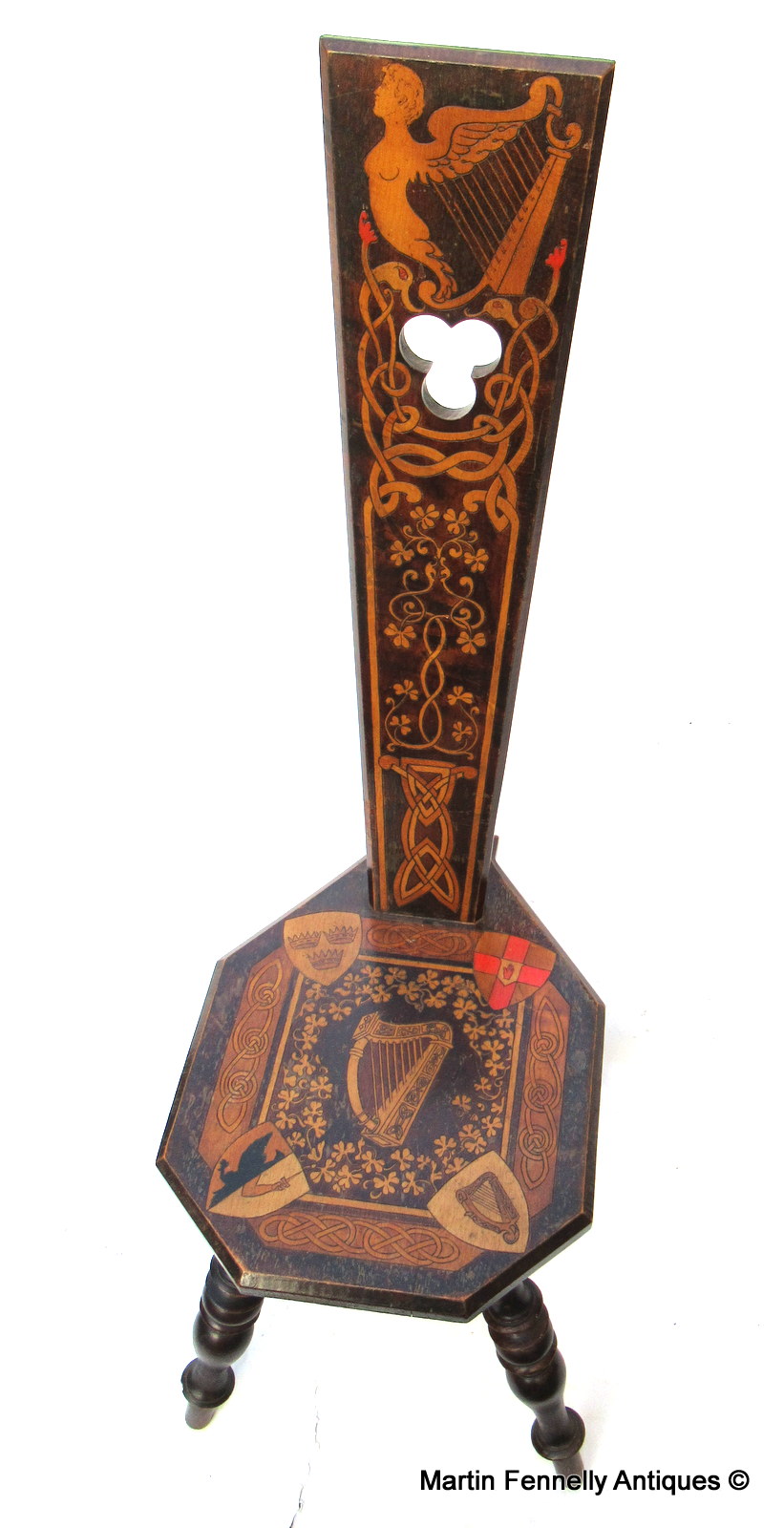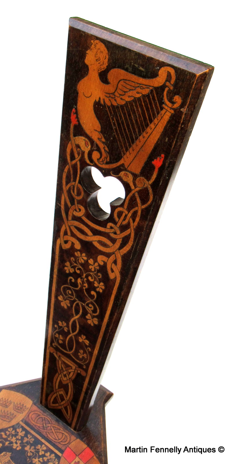Killarneyware Irish Harp Chair Circa 1880 – Museum Quality This piece of Irish History is truly Stunning and in some expert opinions, the rarest piece of Killarney Furniture currently for Sale. It was made in Co Kerry Ireland in the late 19th Century. It is constructed from Arbutus and Yew Wood and has the full spectrum of Iish Imagery exhibiting the harp with the flags of the 4 Provinces of ireland to each corner of the seat. The Table is in full original condition and was recently Cleaned and Waxed by our restoration experts. When it comes to a beautiful piece of Irish Furniture and also an investment item these pieces of Killarney are perfect, especially when they are as detailed as this one. This is a rare piece of Irish history and may be one of a kind so a great find for my Gallery.