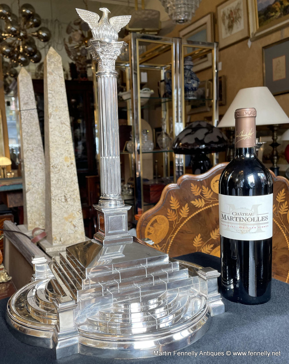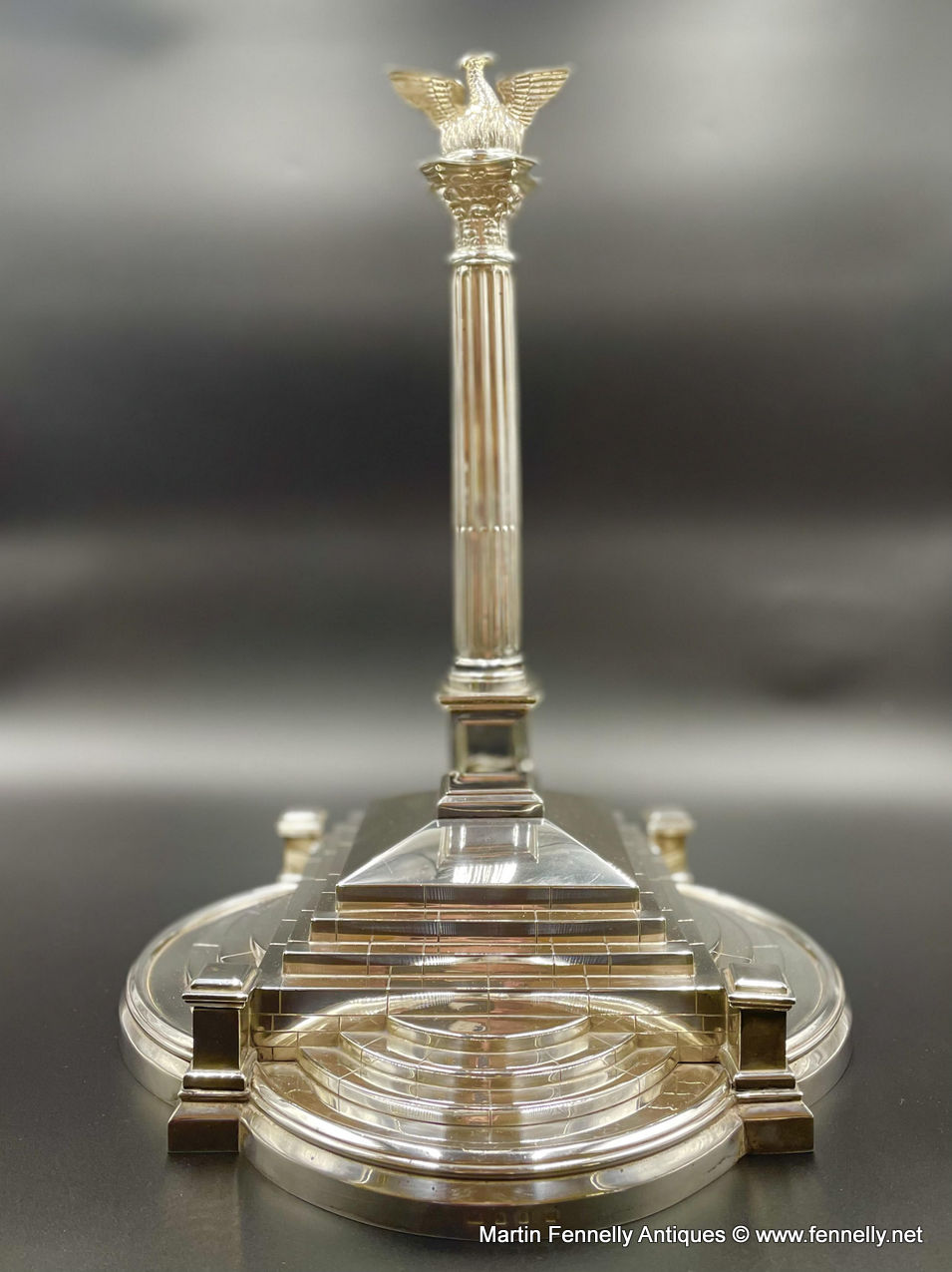 This rare item was made in 1963 and and is a stunning piece of Silver crafted by The Famed Dublin Silversmith, Larry Gunning. This Replica is of the Pheonix Monument in The Pheonix Park. This is a large miniature version of The Pheonix Monument on Chesterfield Avenue in The Phoenix Park Dublin. The monument stands at The Gates of Áras an Uachtaráin which is the Official Residence of The Irish President. This bespoke replica is a very rare item and I was fortunate that I managed to acquire it and I am very proud that the Public can see it before it is sold (this will sell very fast as a one off piece of Irish History – update – sale is pending to a private Collector).